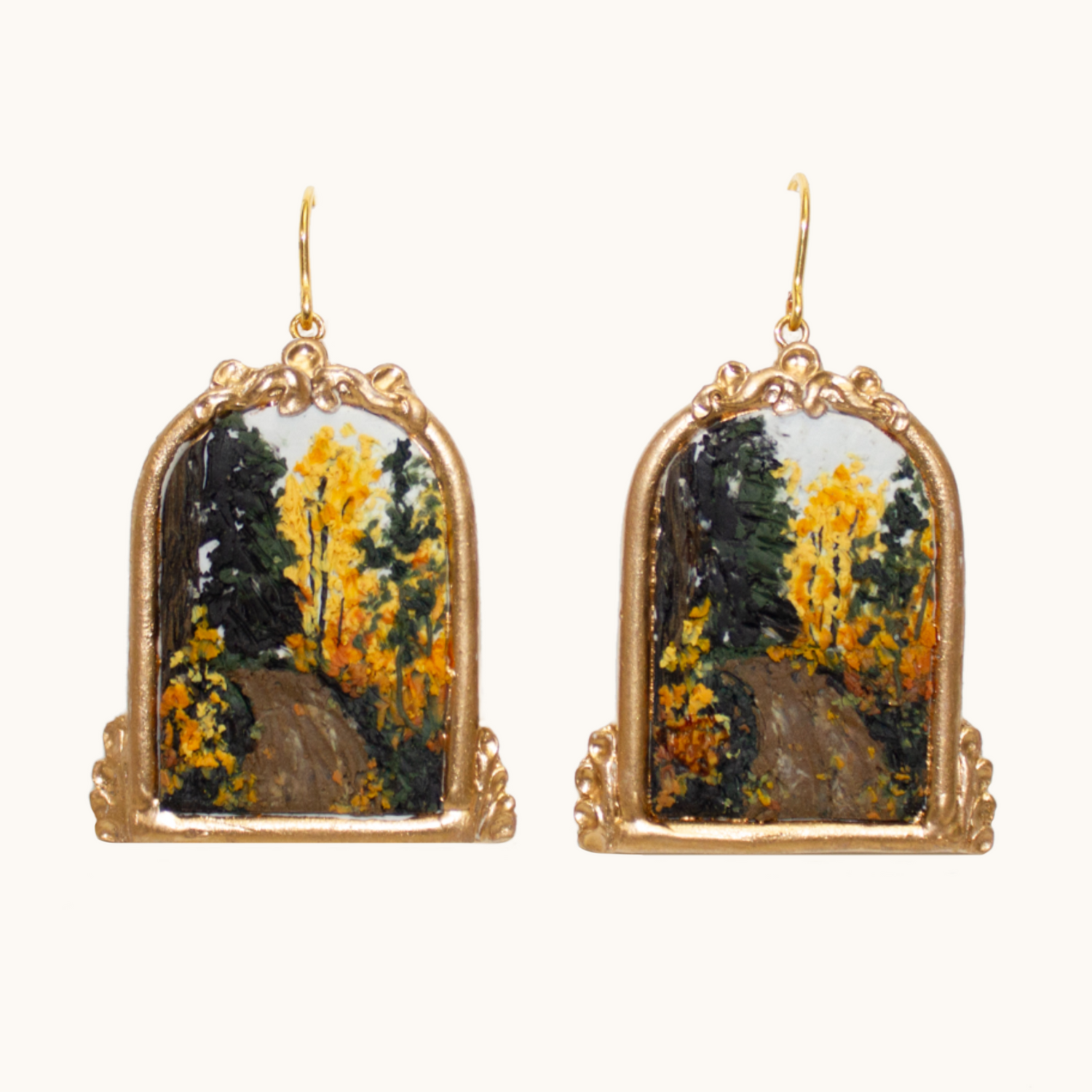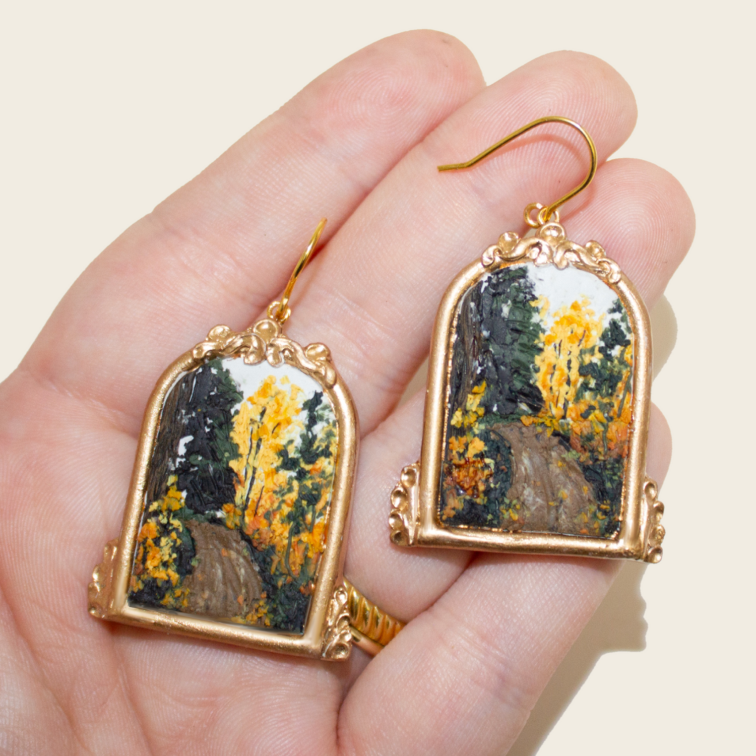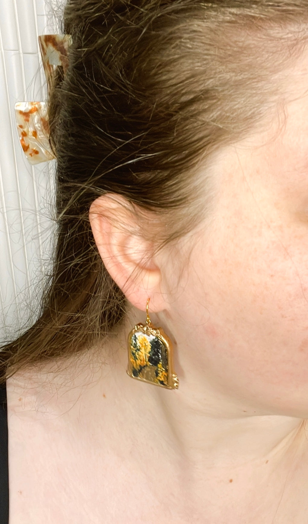 These earrings are meticulously crafted by hand with polymer clay. I place every little detail and then sculpt an ornate frame around the outside for the perfect gold accent. Both earrings take about 2 hours just to get the raw clay to look exactly right.