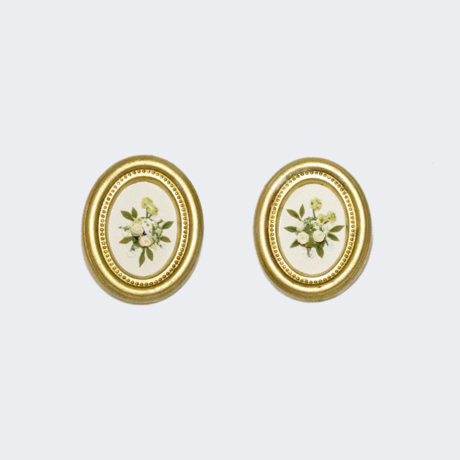 These earrings feature a bouquet of flowers on a cream base within a vintage-style frame. These are studs, so there's a titanium post embedded in the back :)