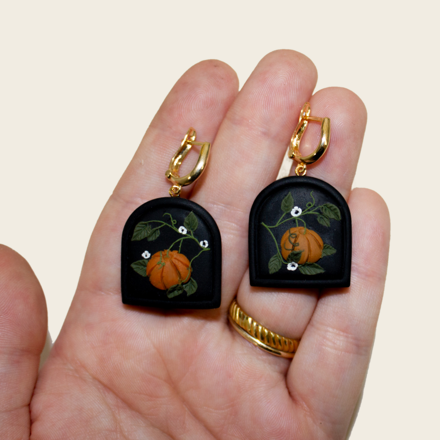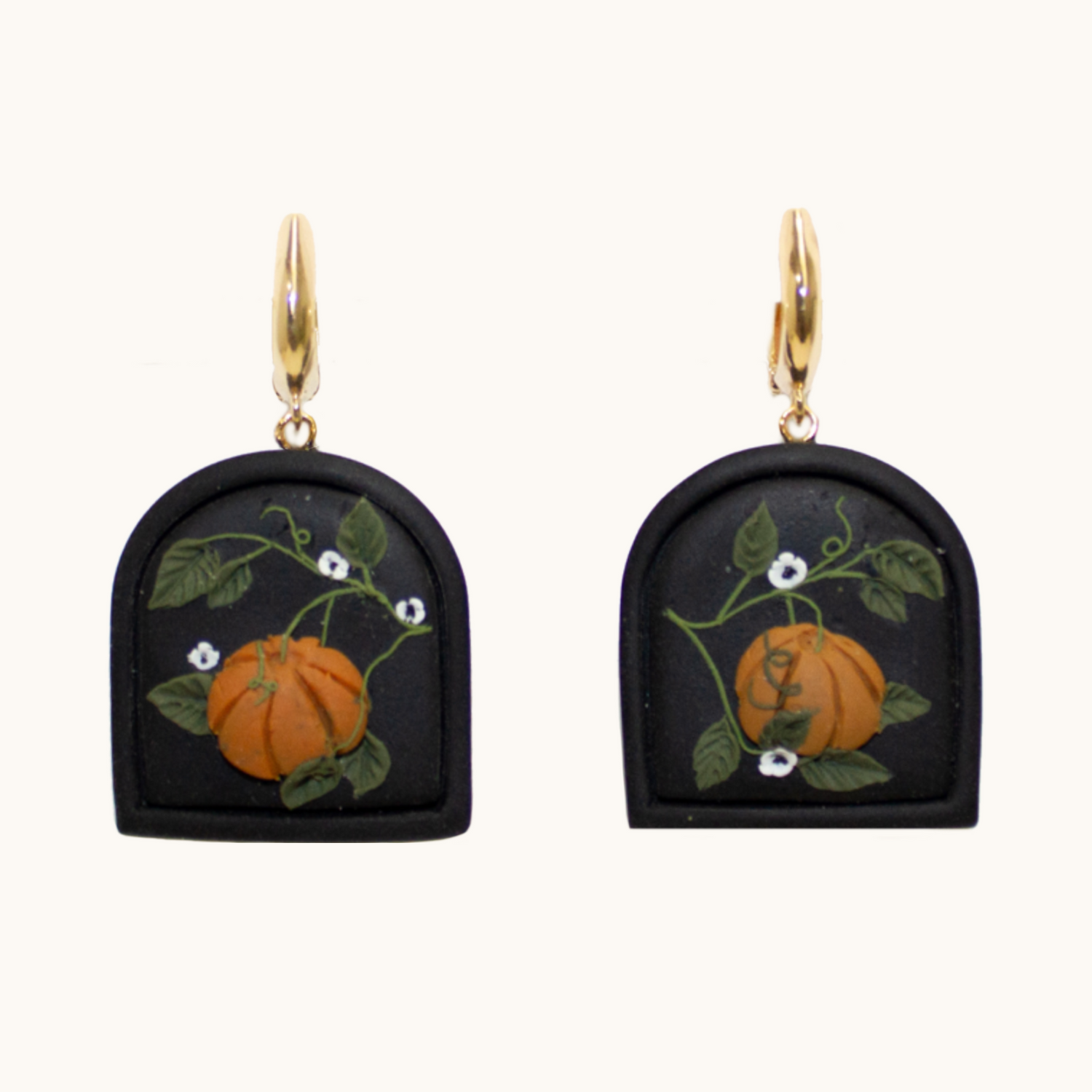 These earrings are a short arch with an outline detail. I hand- sculpted pumpkins, foliage and little flowers to give you your very own fall dream :) If you like these, check out the matching necklace and barrettes I made!