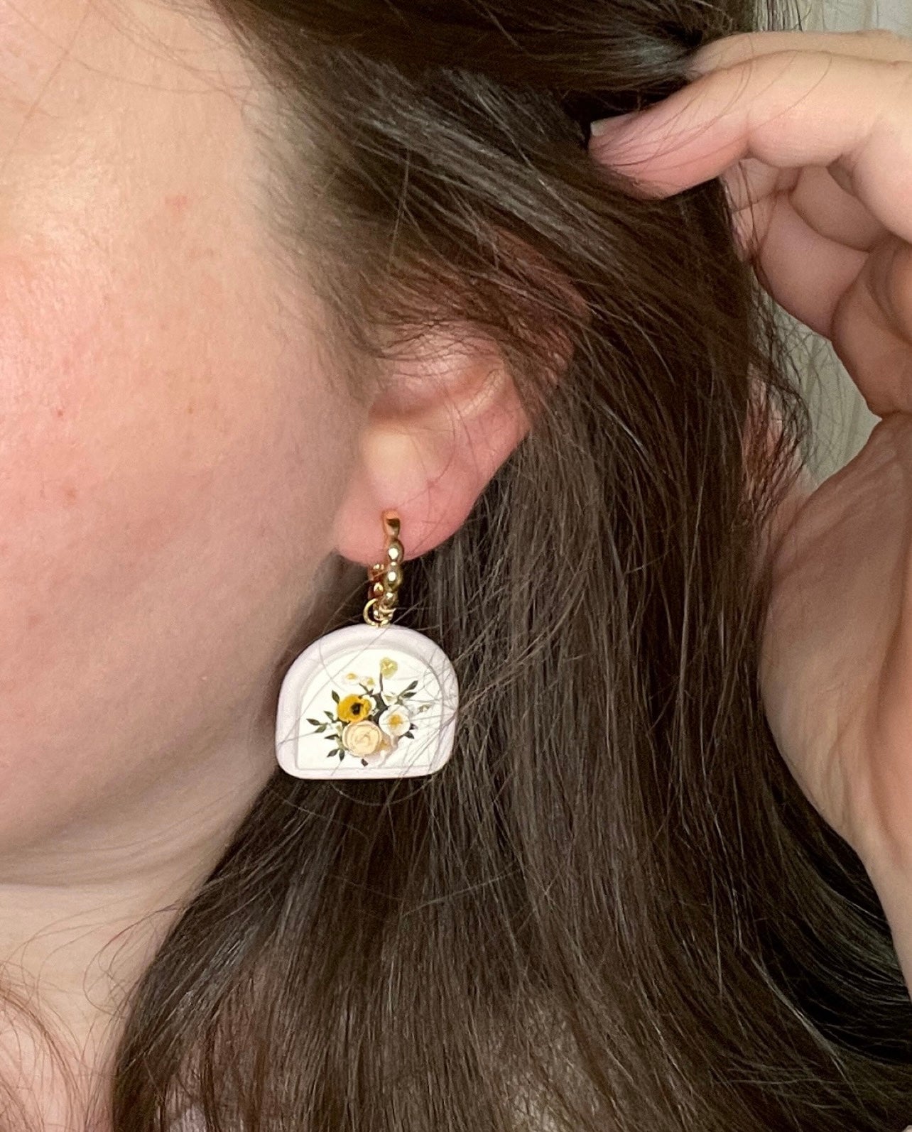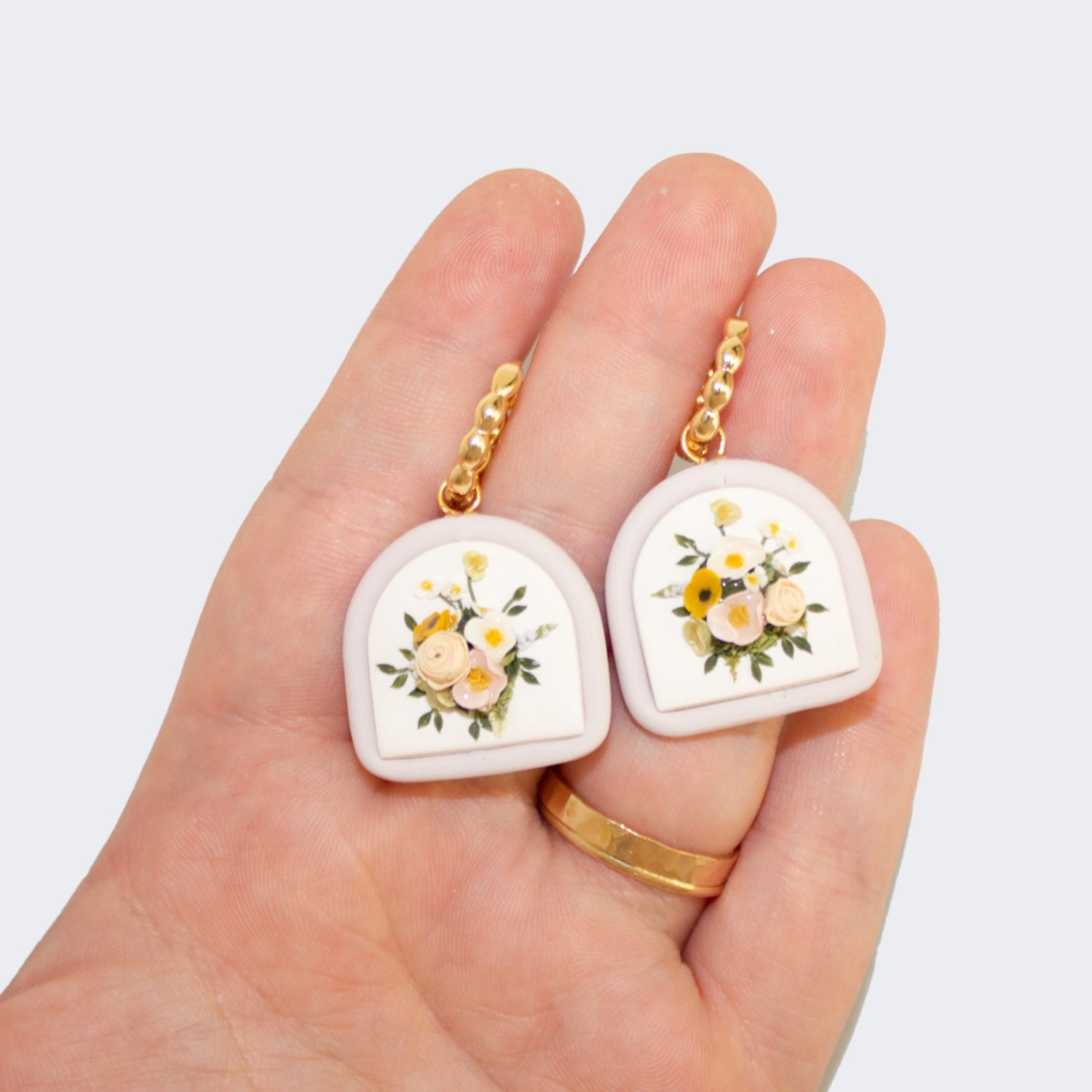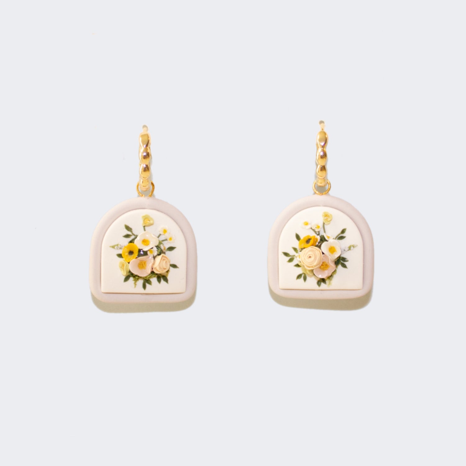 This pair of earrings features a white base, bordered with a tube of lilac clay. The effect is so amazing, they're really unique! The bouquet consists of white and peach flowers accented with deep green foliage.
