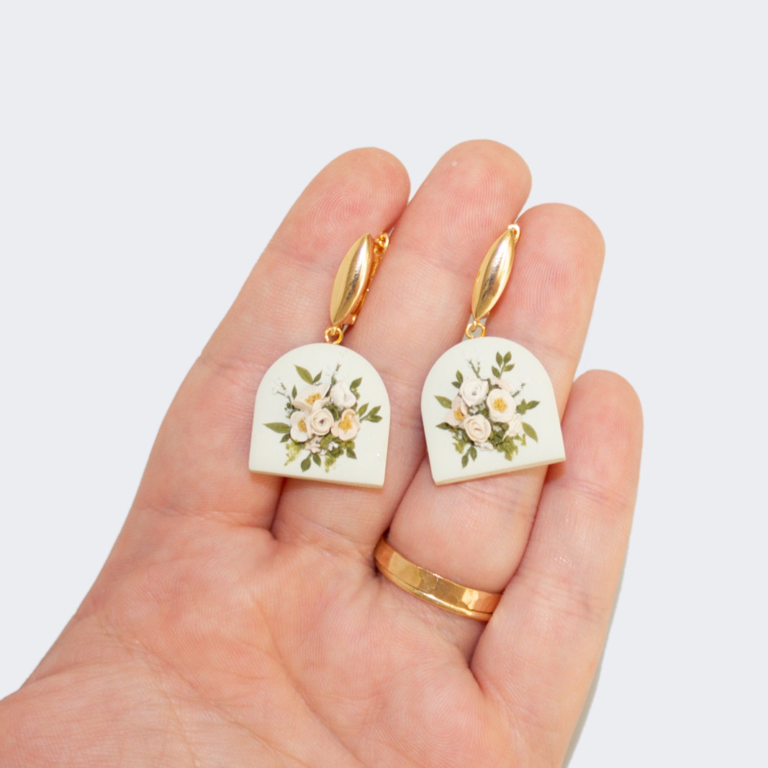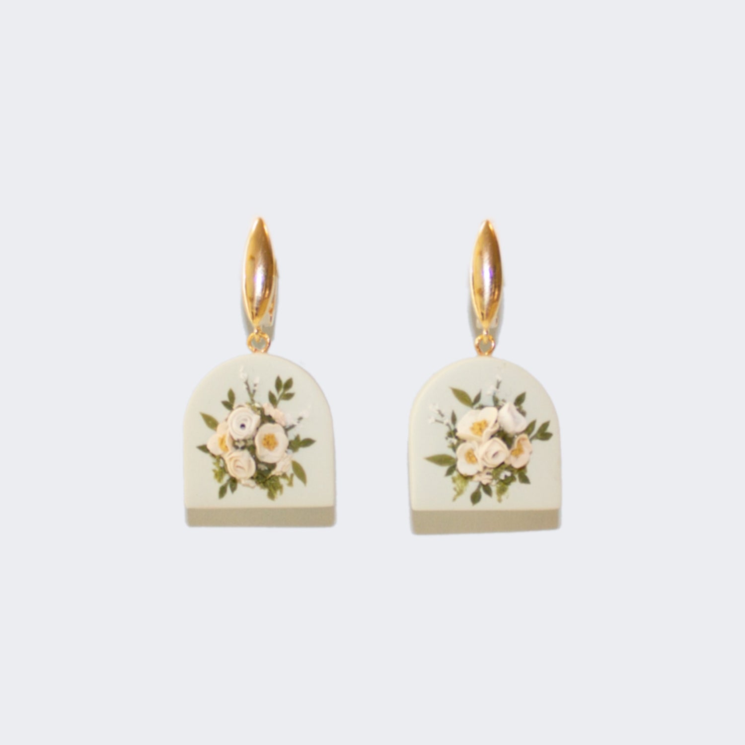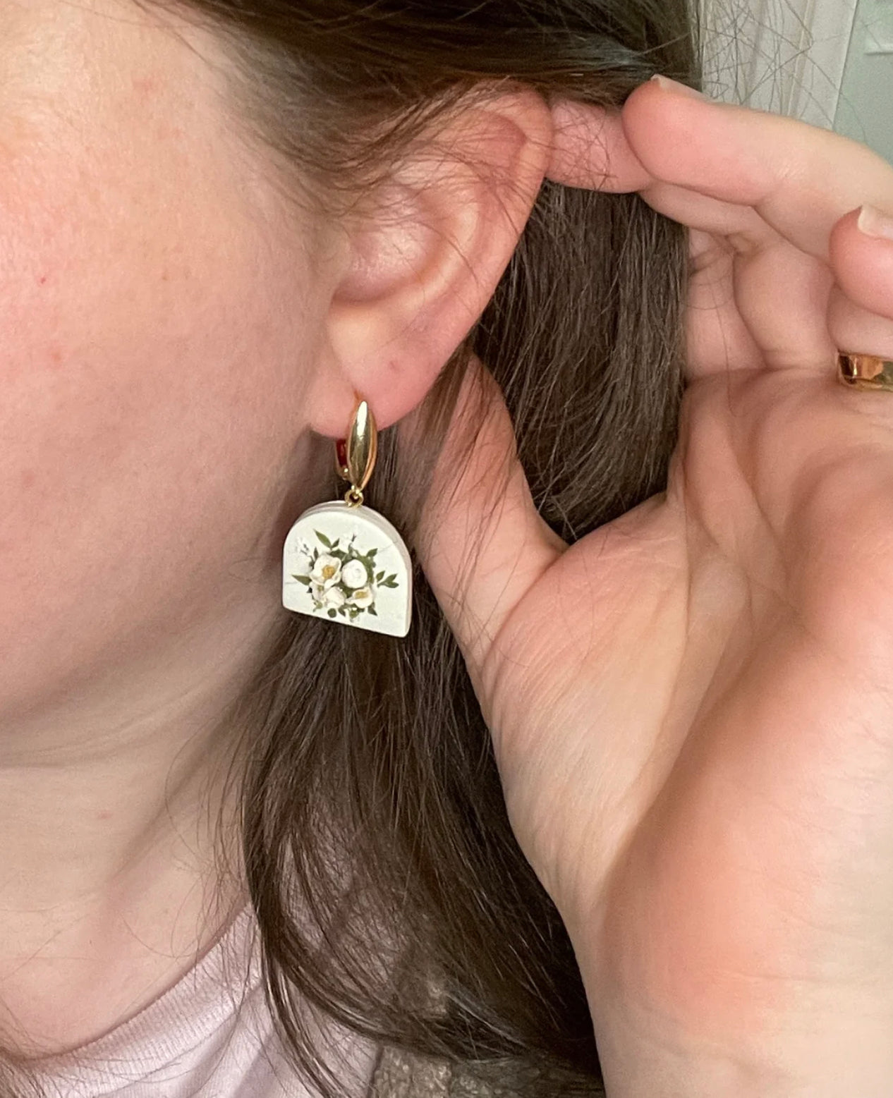 This pair of earrings is such a classic "Mal style". You have the light mint green base with a cute white bouquet in the center. The latch hoops are perfectly paired with this little arch.