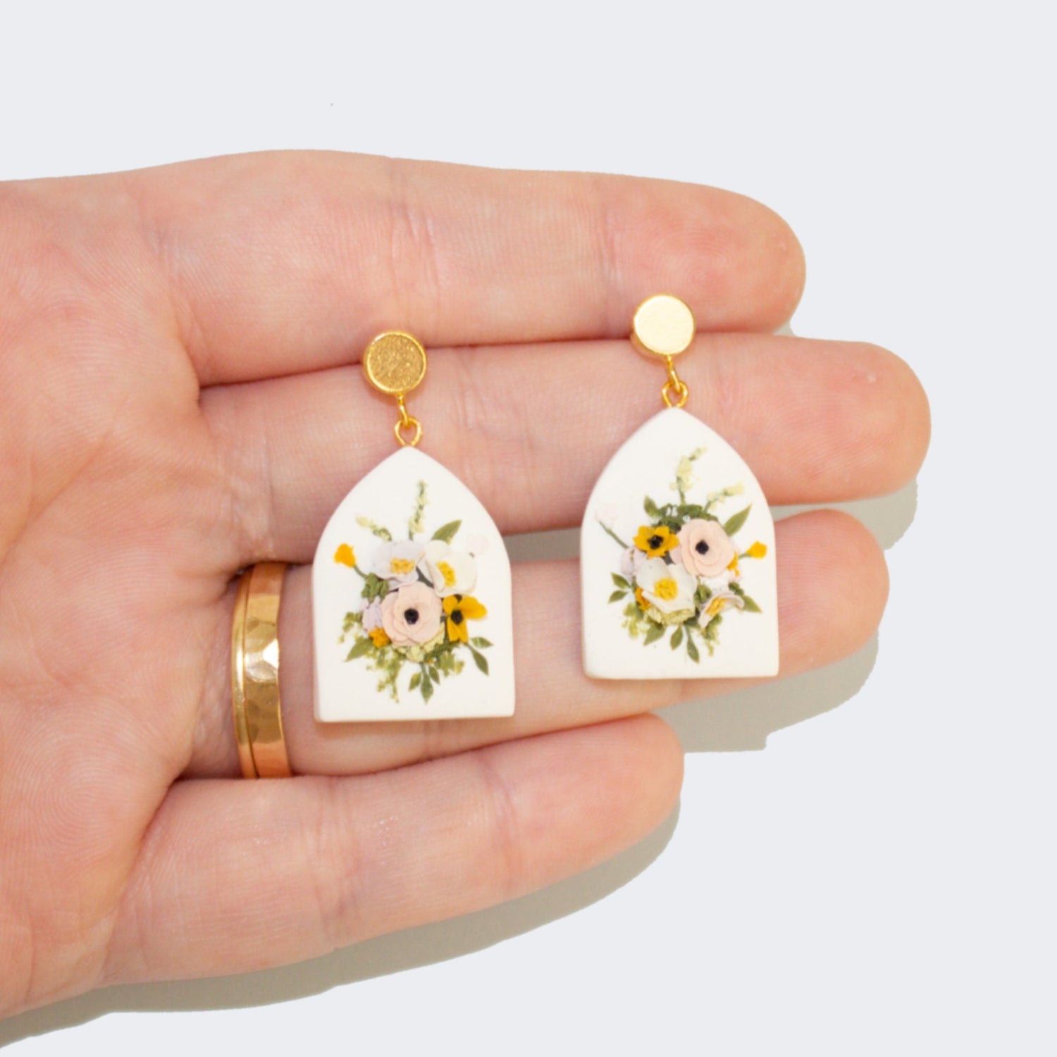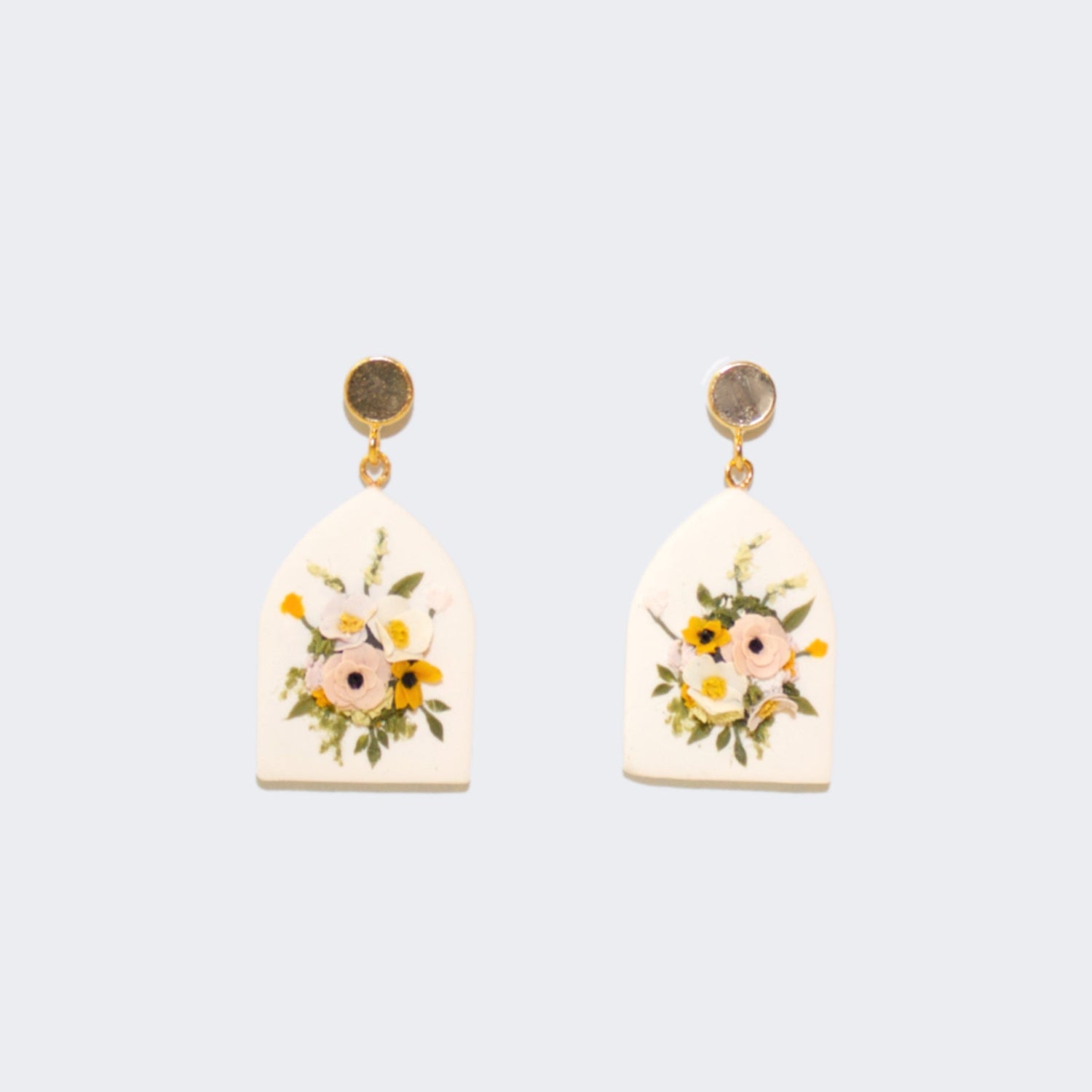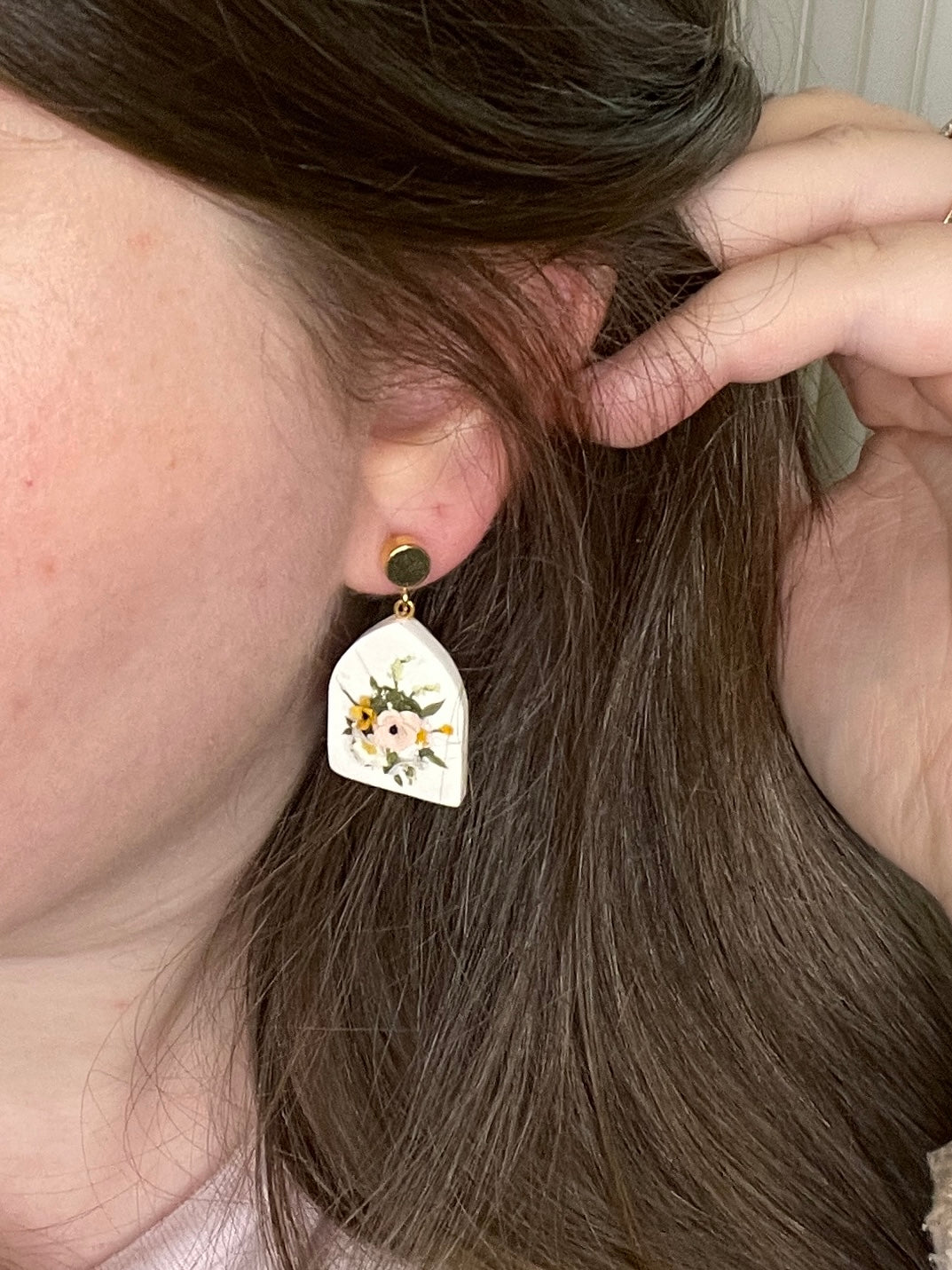 These earrings feature a white pointed arch base with an adorable bouquet of pink, white, lilac, and tangerine flowers and beautiful green foliage.