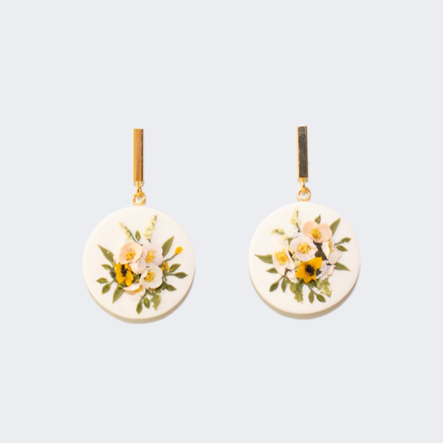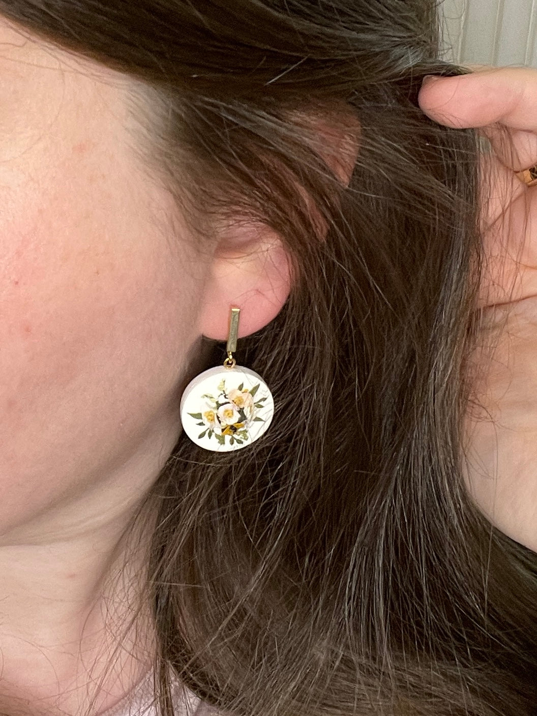 These earrings feature a white, circular base with an adorable bouquet of pink, white, lilac, and tangerine flowers and beautiful green foliage.