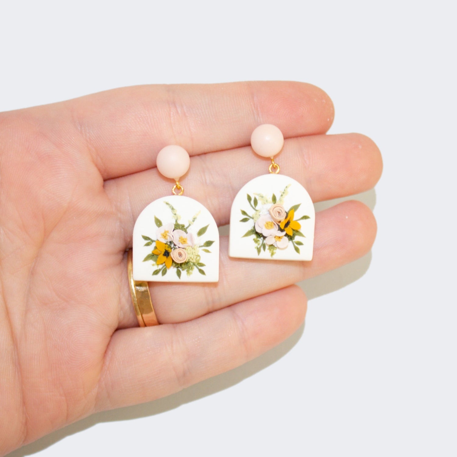 This design features a white arch base and a bouquet of white, citrine, mauve, tangerine and peach flowers. I leaned into the colors of these earrings, giving them a domed post in a beautiful peachy pink shade. I think it gives them the perfect pop of coordinated color!