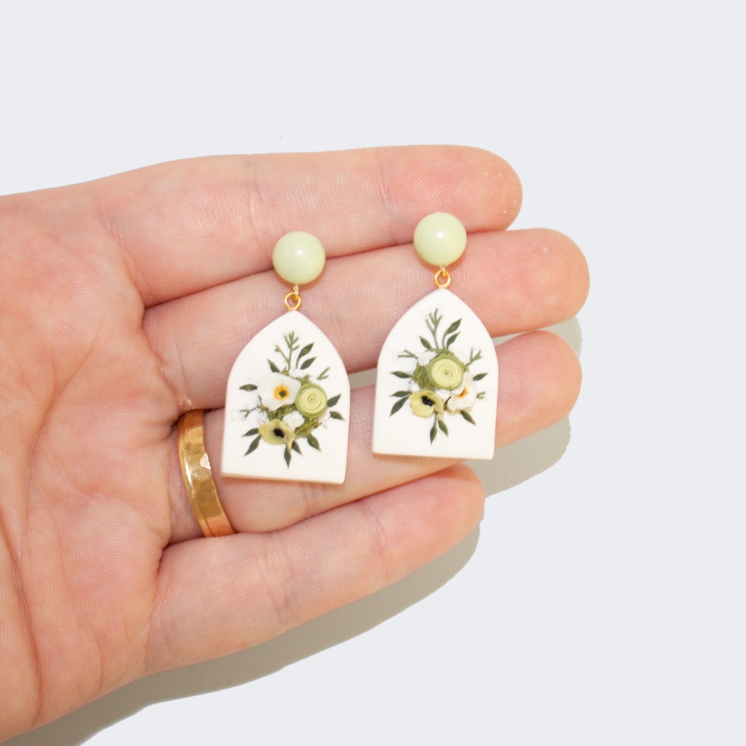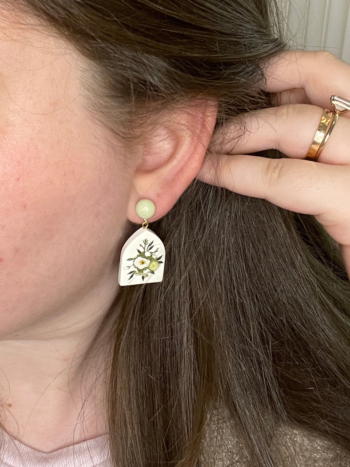 This design features a white, pointed arch base and a bouquet of white and citrine flowers. I leaned into the colors of these earrings, giving them a domed post in a beautiful light sage color. I think it gives them the perfect pop of coordinated color!
