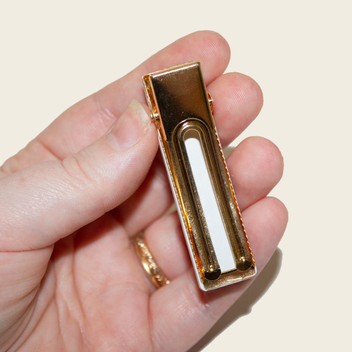 Materials: Polymer clay, brass hair clip component, resin