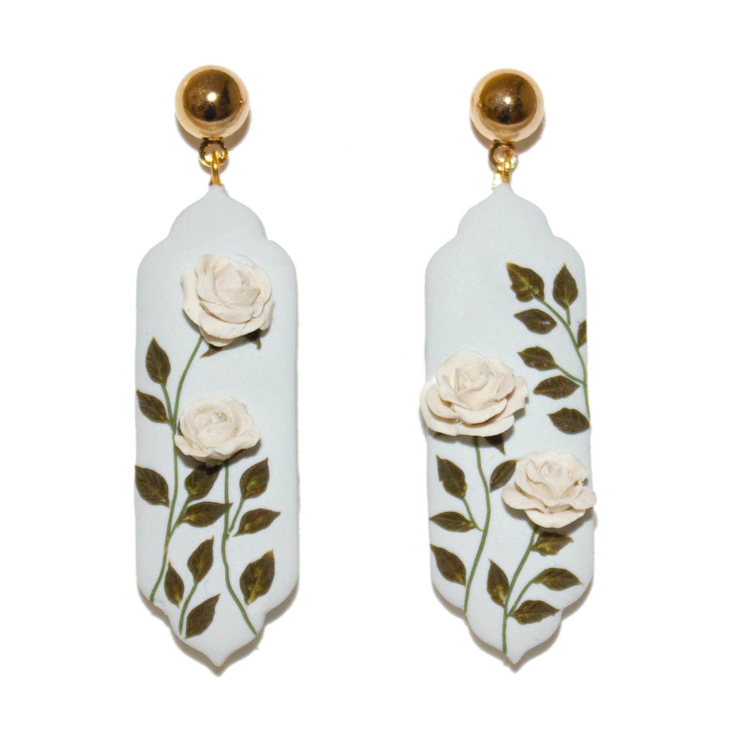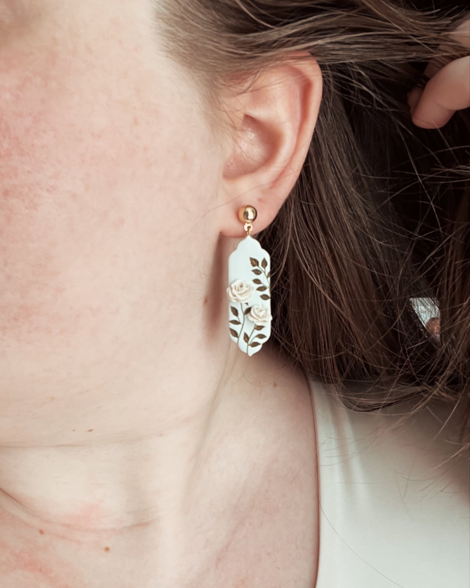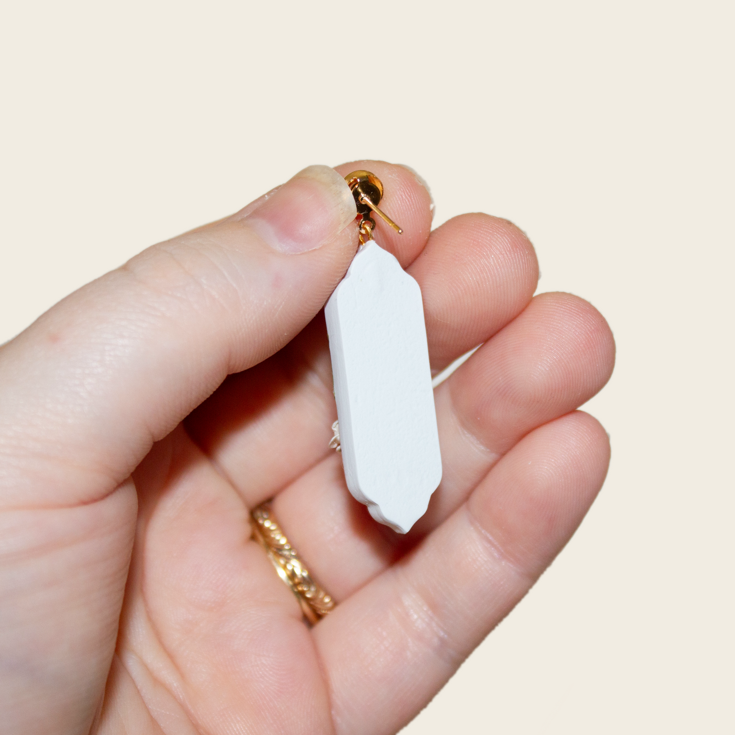 Materials: Polymer clay, resin, gold filled wire, gold filled earring post