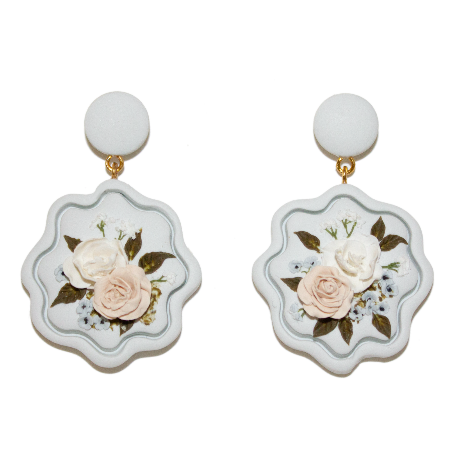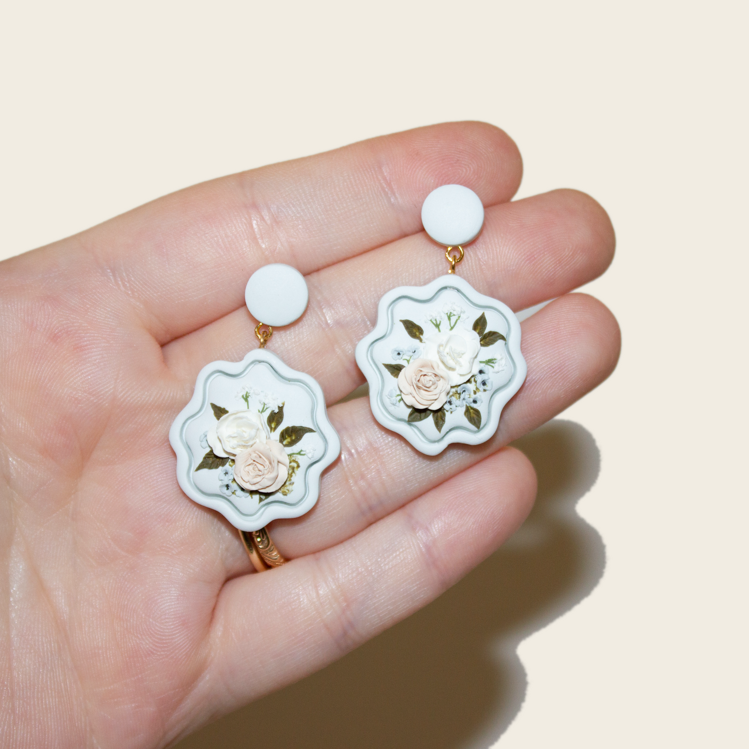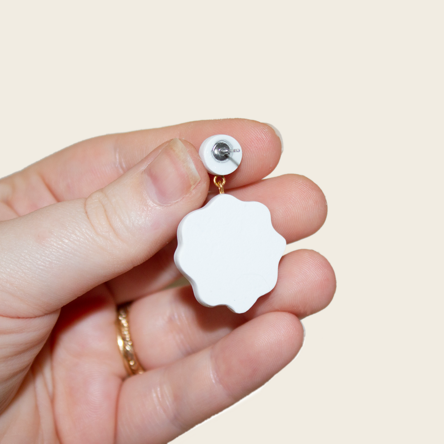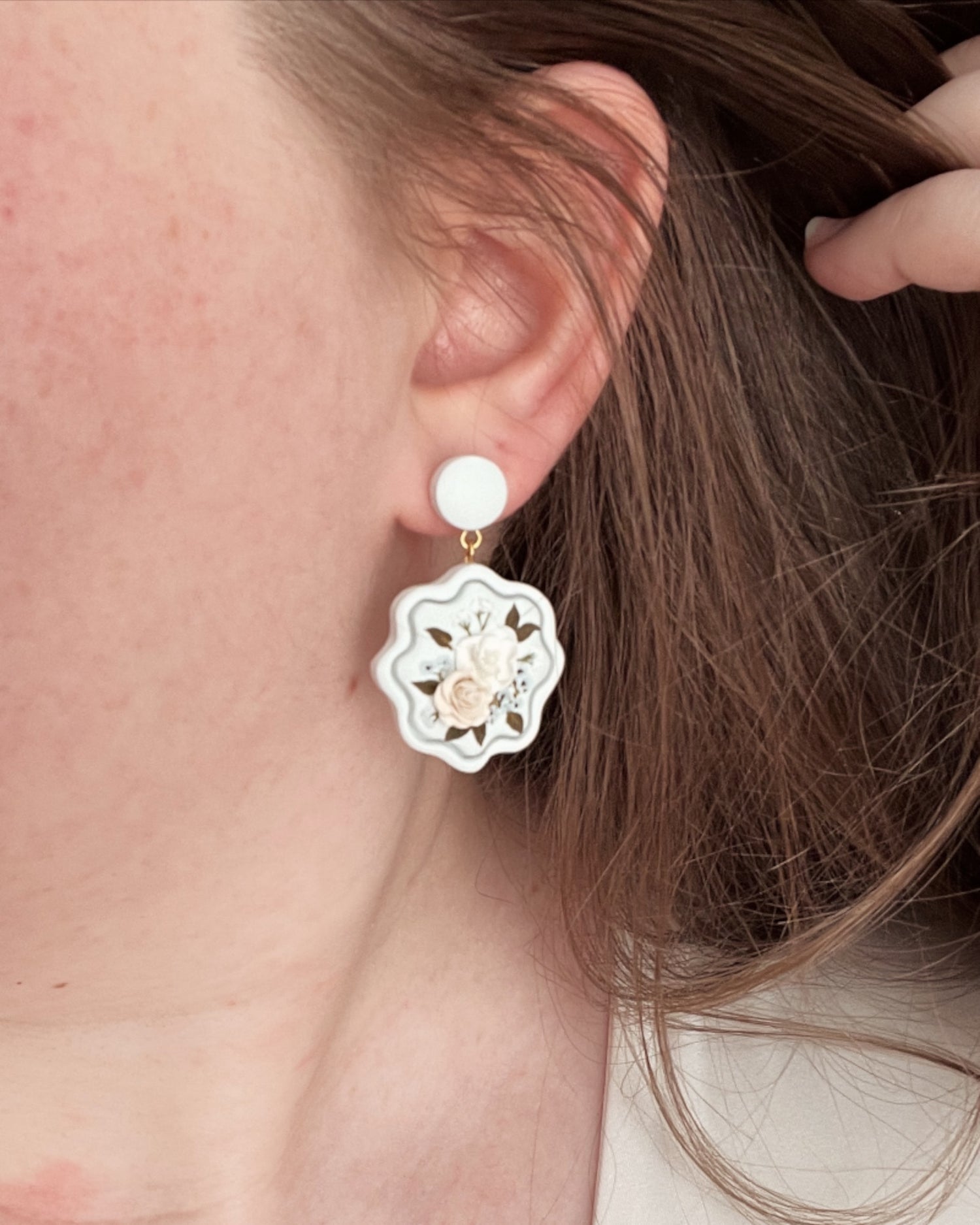 Materials: Polymer clay, resin, gold filled wire, gold filled earring post