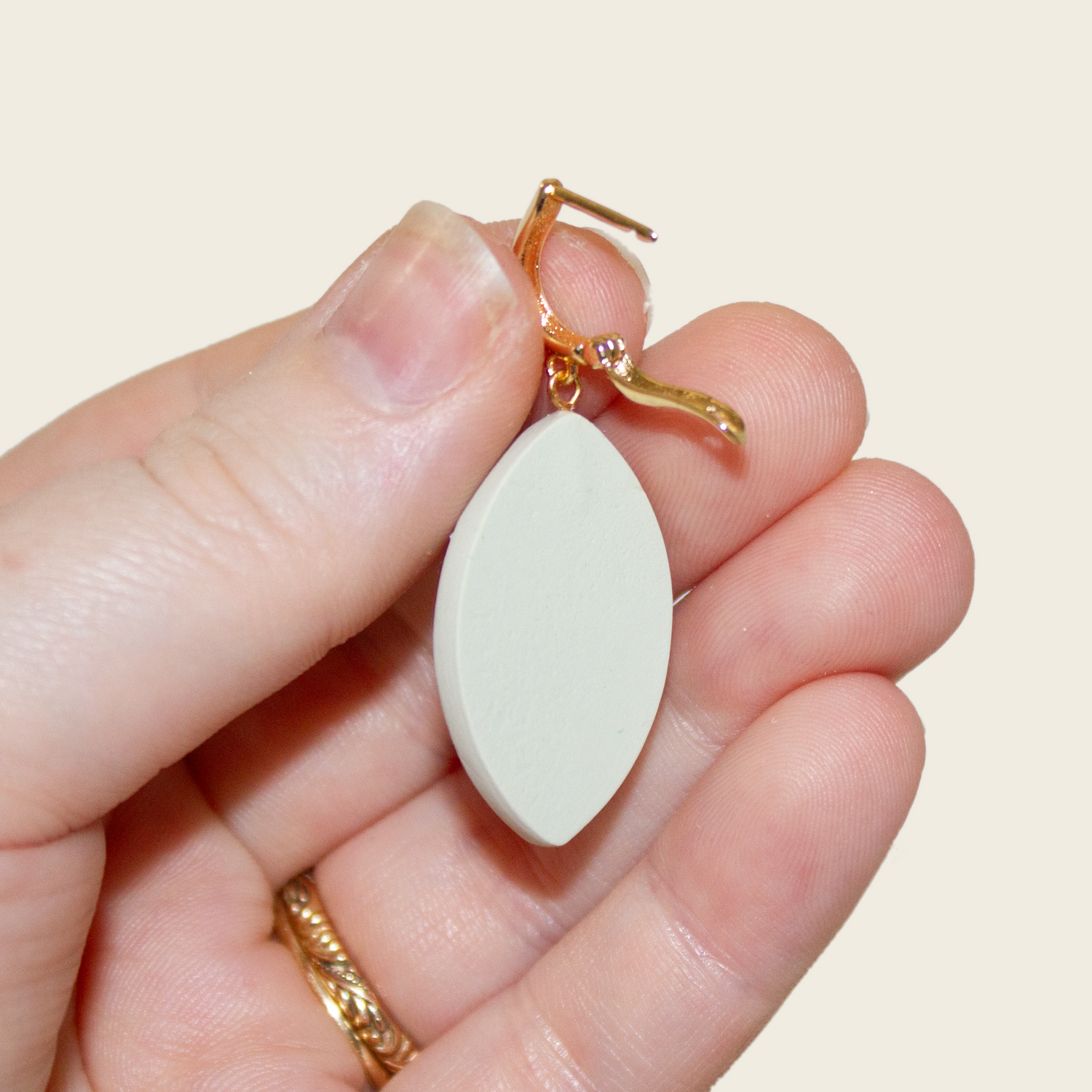 Materials: Polymer clay, resin, gold filled wire, gold filled earring post