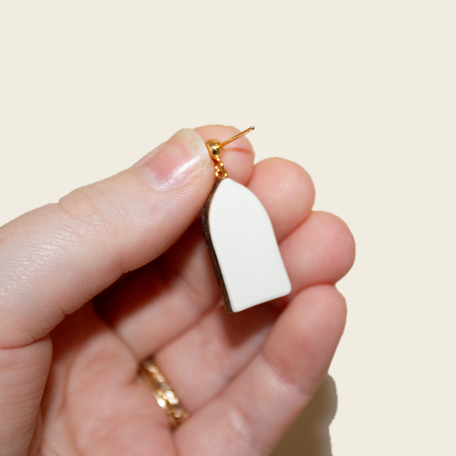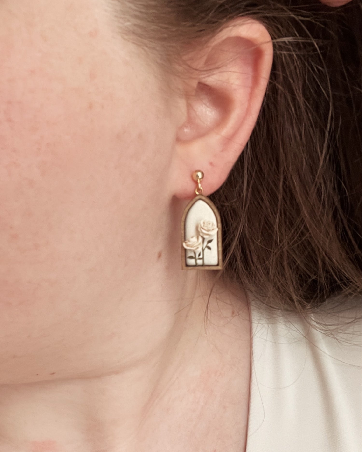 Materials: Polymer clay, resin, gold filled wire, gold filled earring post, wood frame, natural wood stain