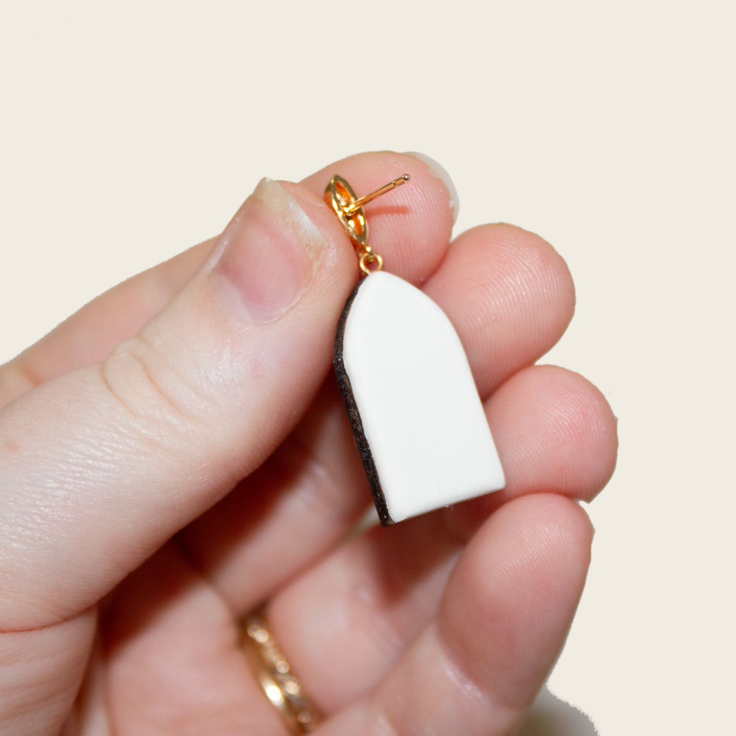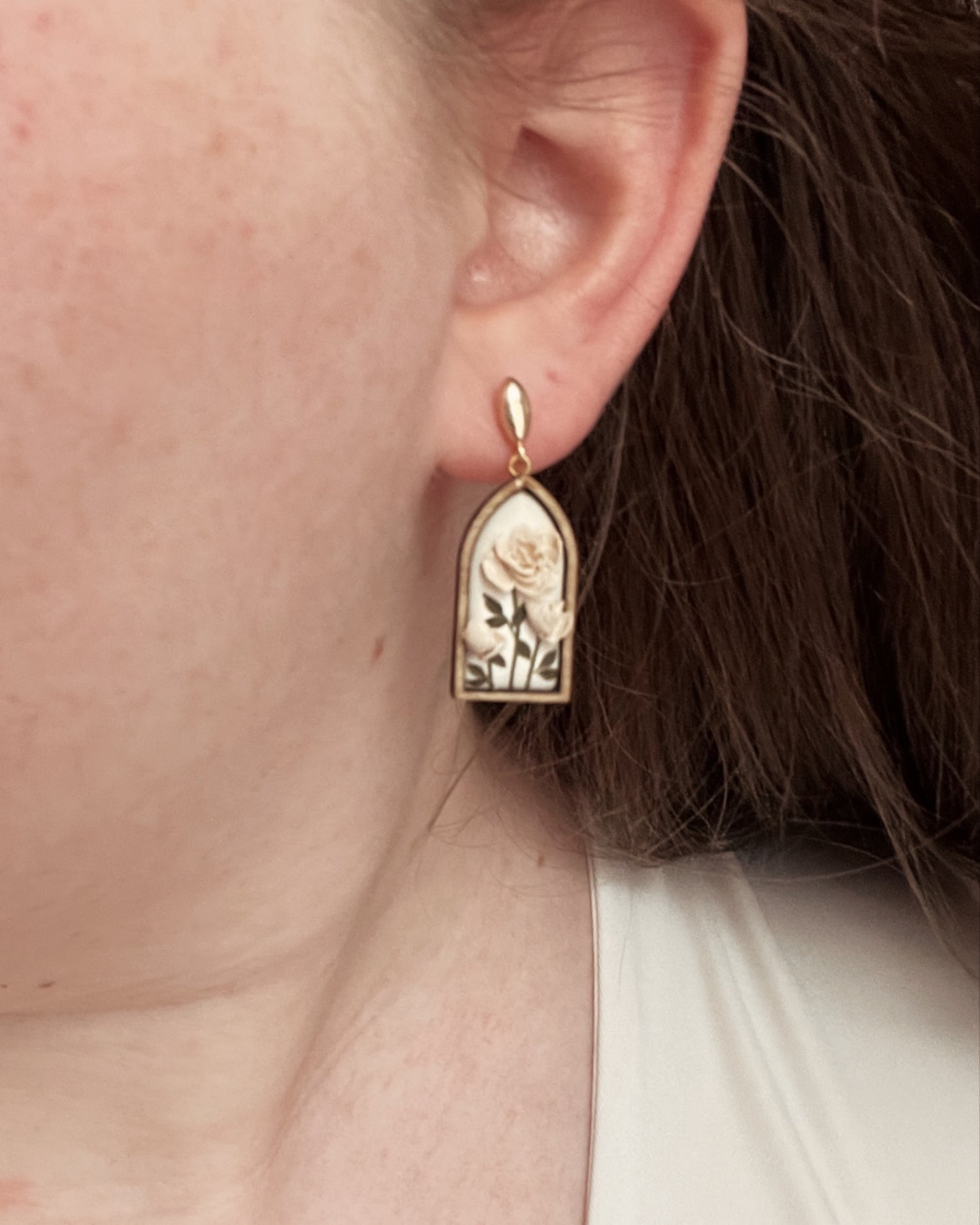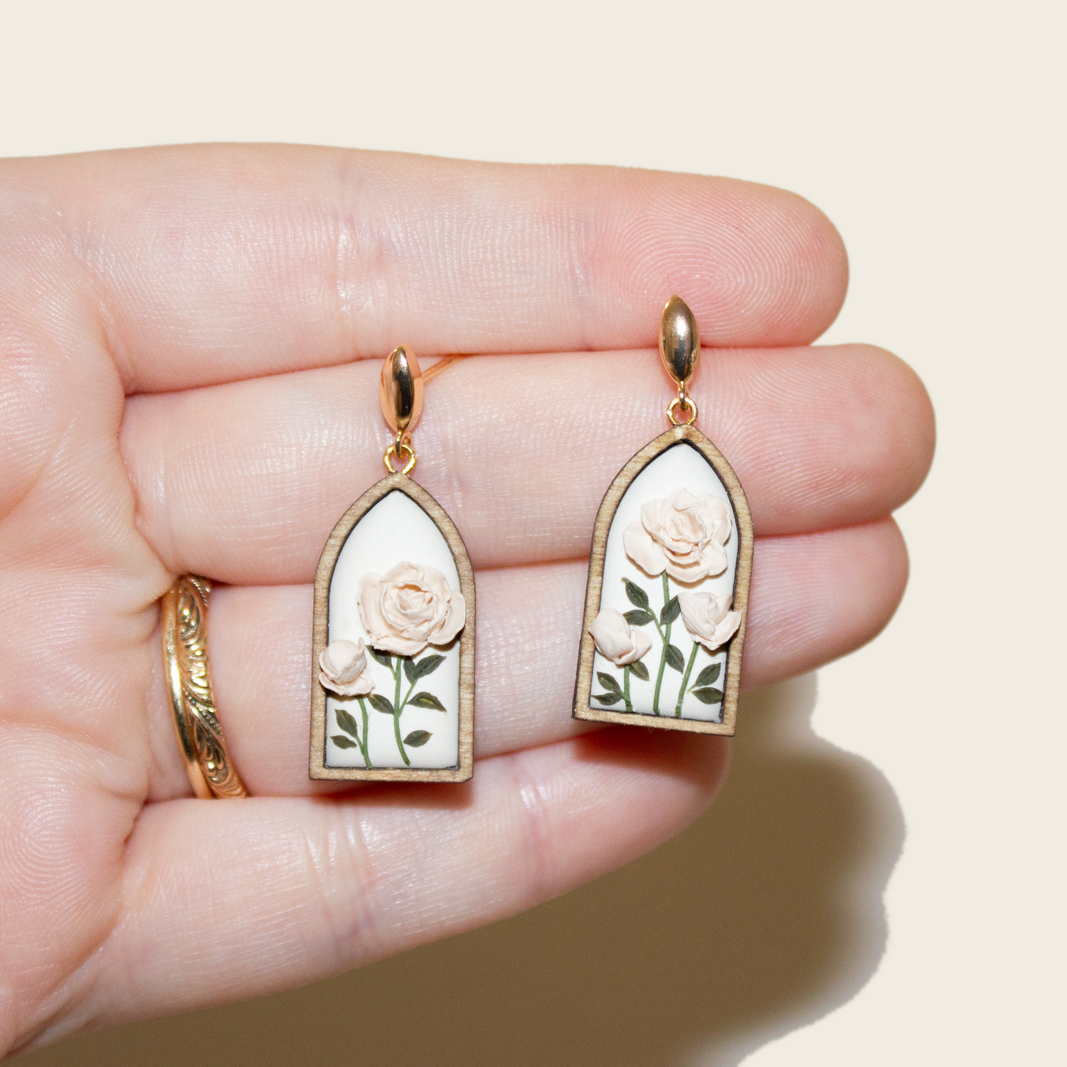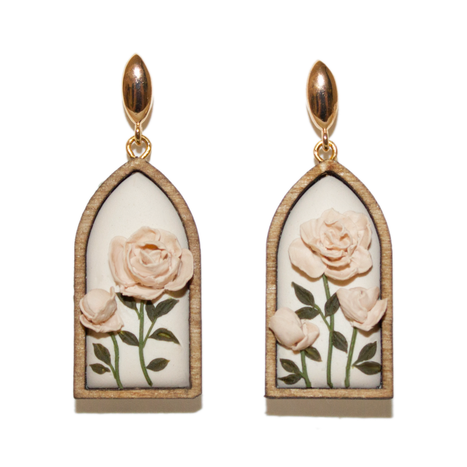 Materials: Polymer clay, resin, gold filled wire, gold filled earring post, wood frame, natural wood stain