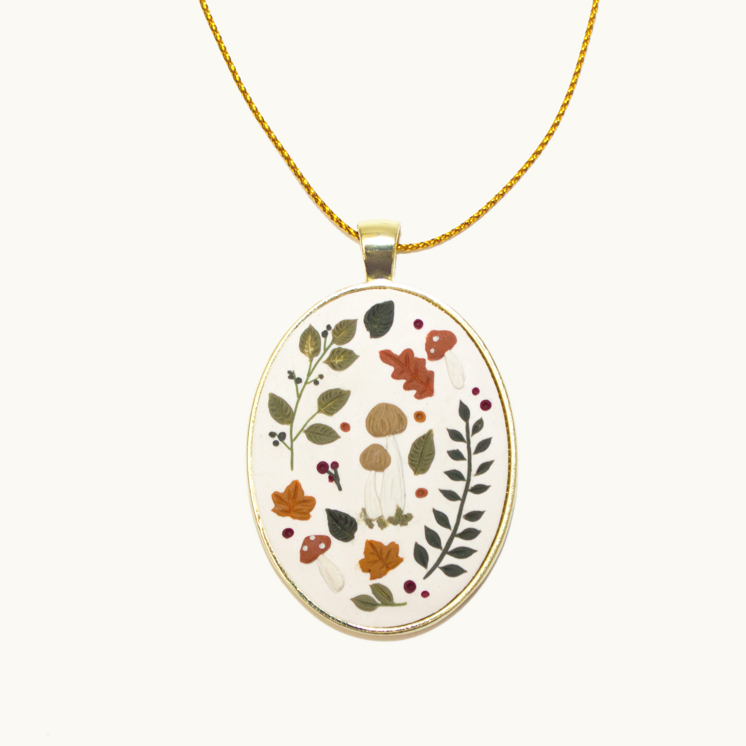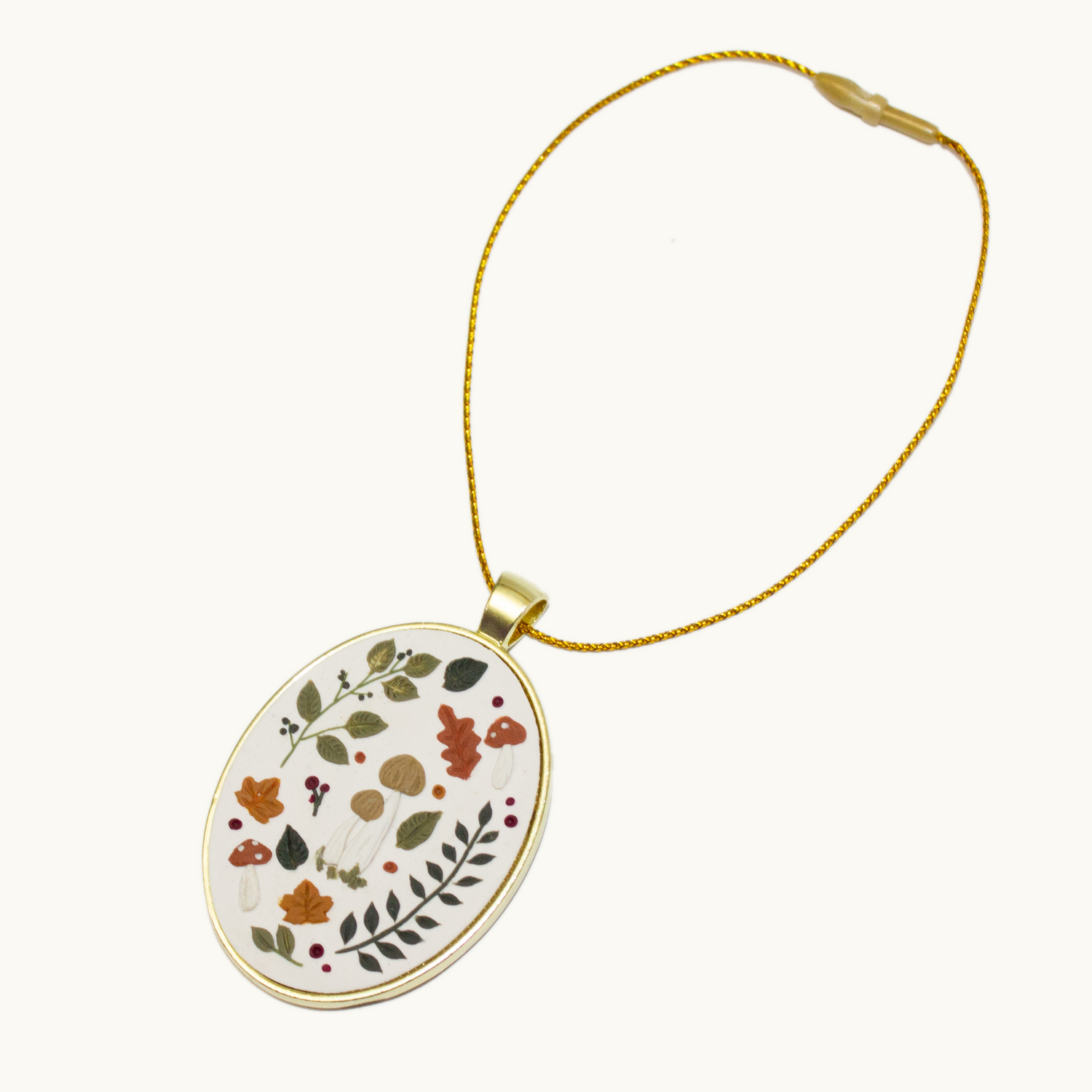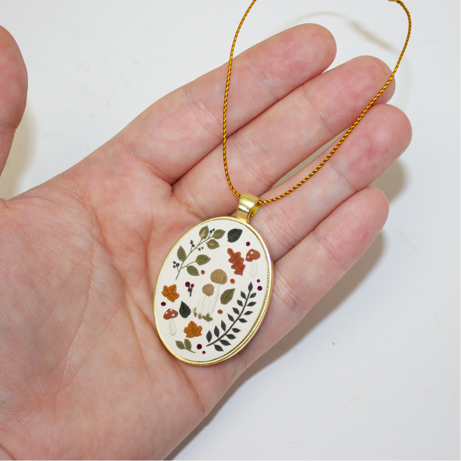 -Pendant is made of polymer clay sealed with resin, hanging from a gold ornament string
