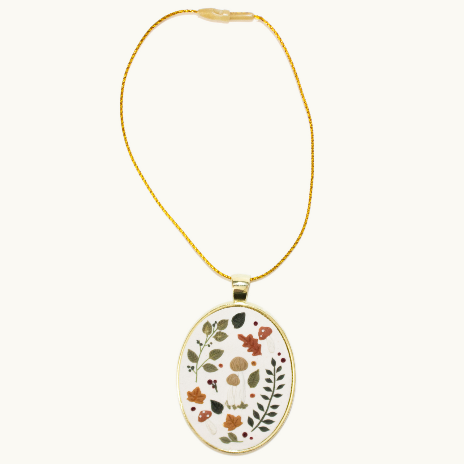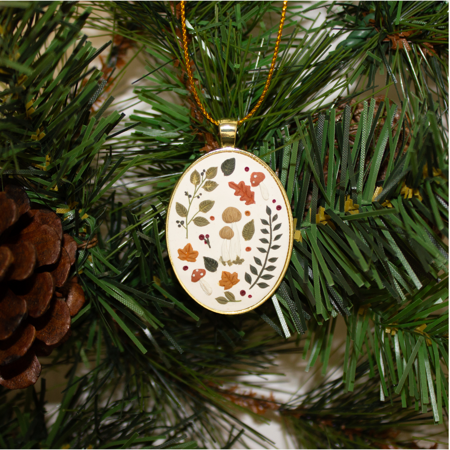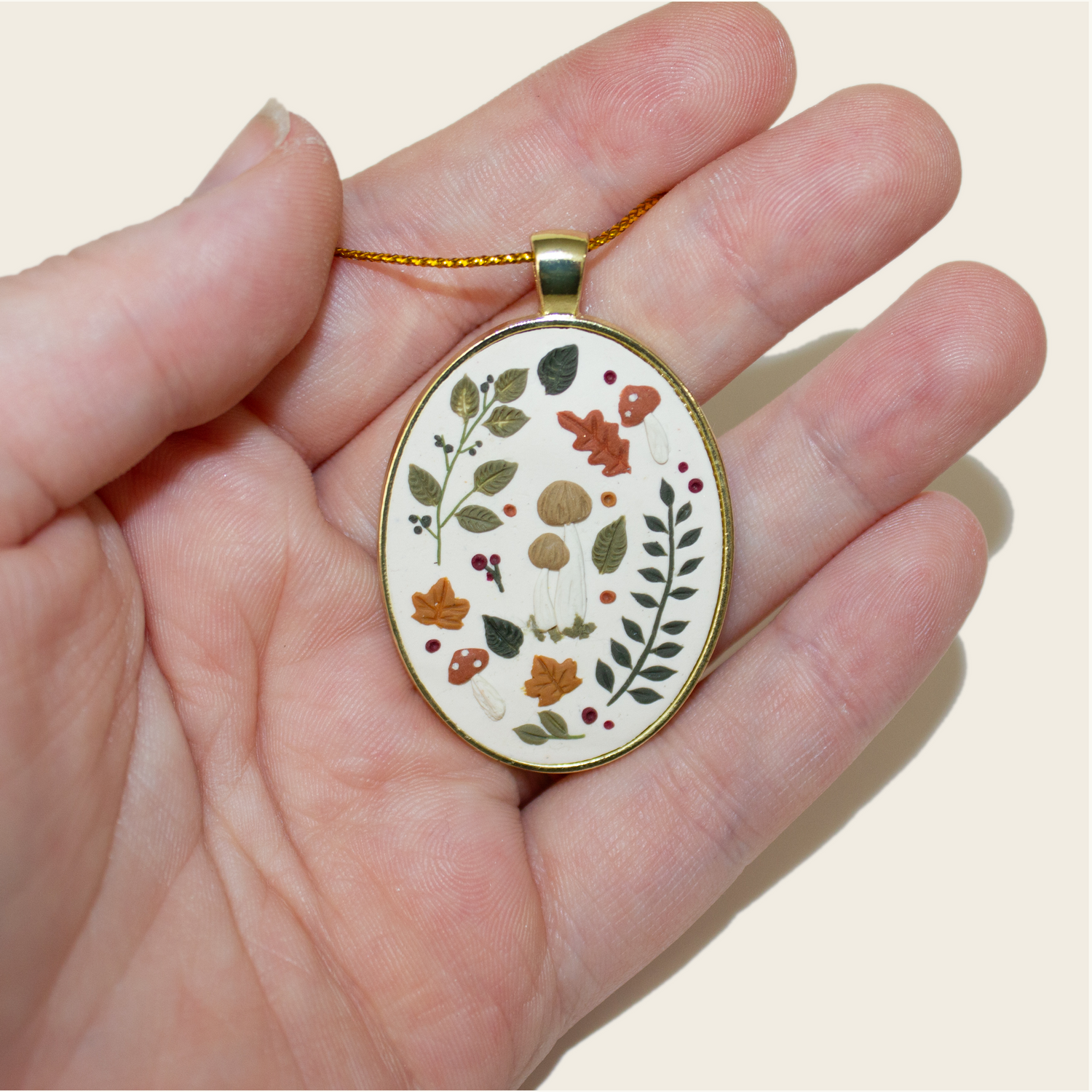 - Materials: polymer clay, brass cabochon setting, ornament string