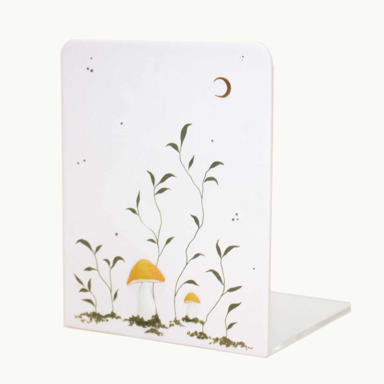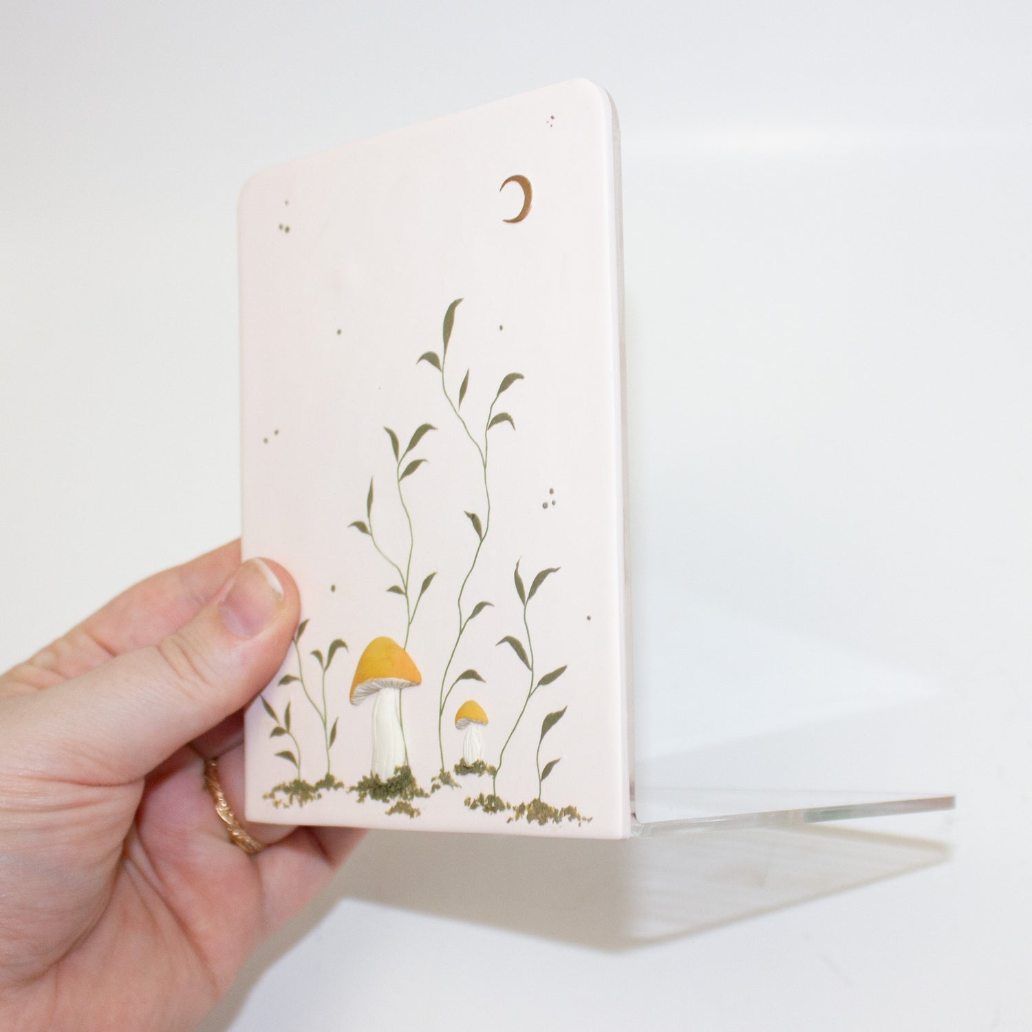 This book end matches the rest of my Berry Mushroom designs, featuring little golden colored mushrooms in a tiny forest under the moon. The base color is a pale peachy pink shade that goes perfectly with the little mushrooms :)