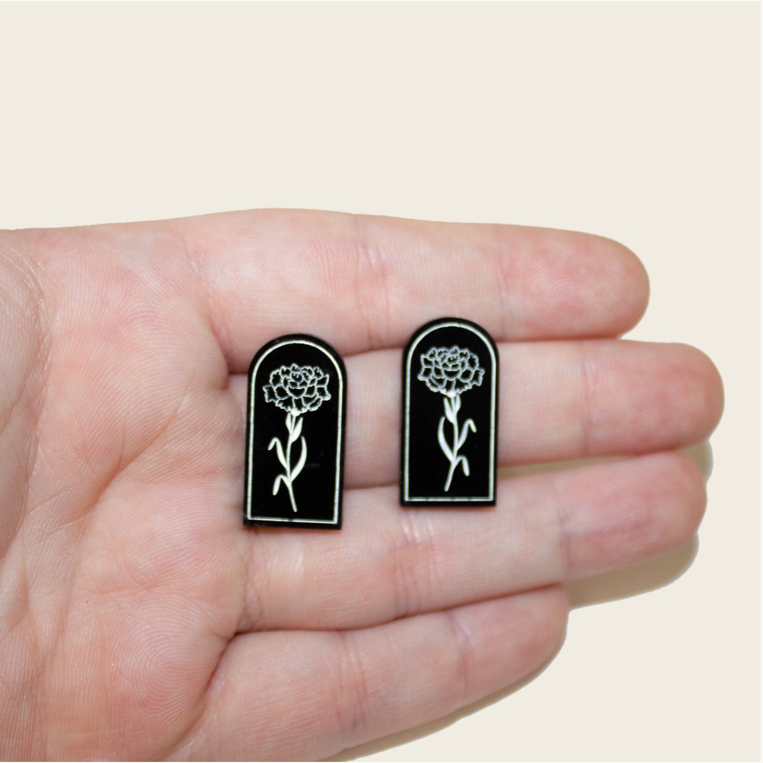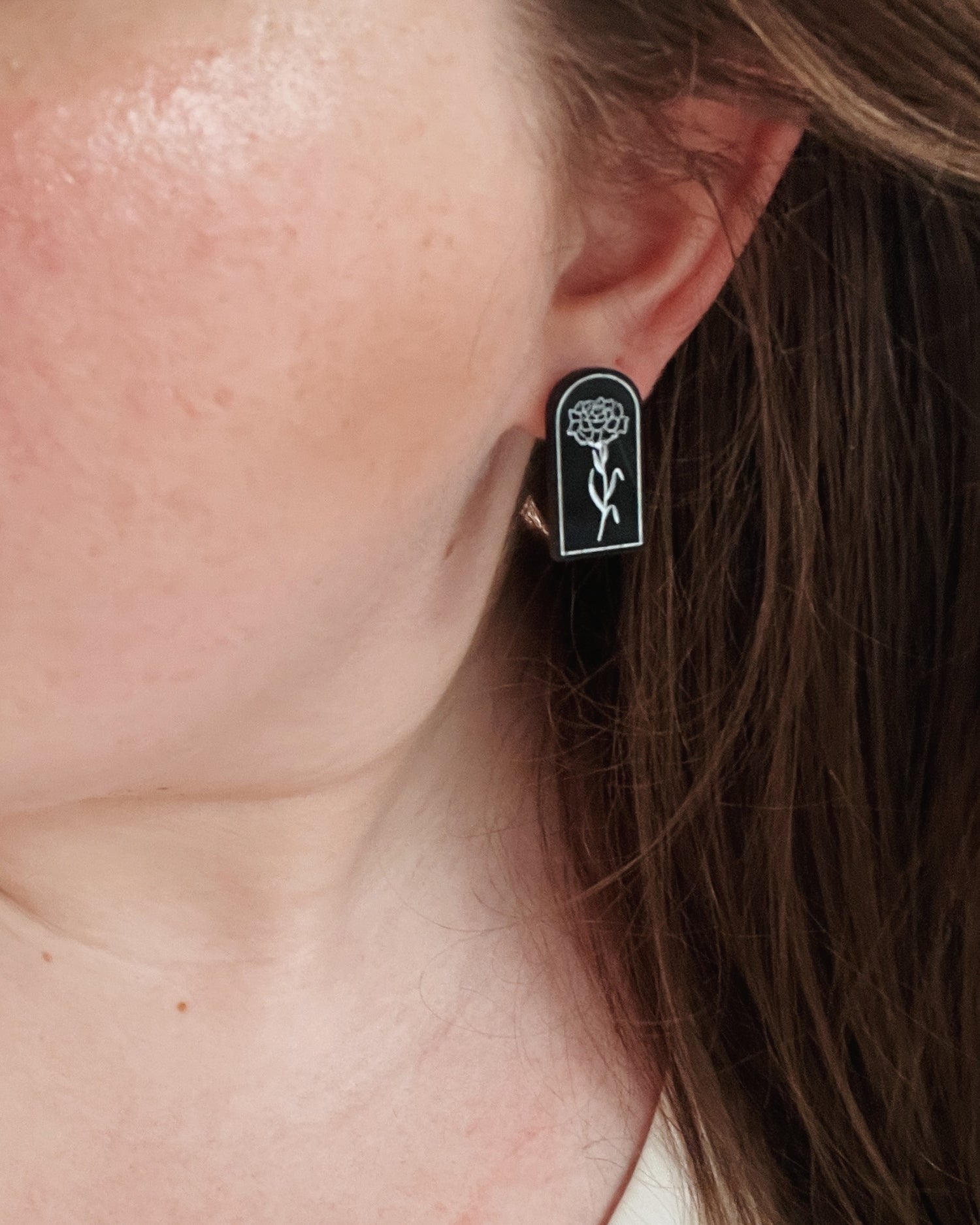 Materials: black acrylic, white paint, resin, polyurethane sealant, titanium earring posts