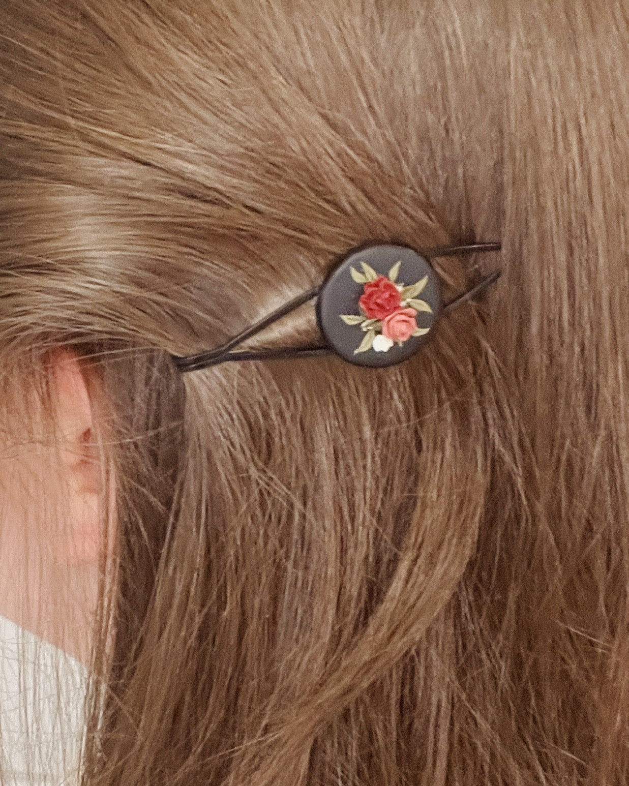 Materials: Polymer clay, resin, black coated brass hair clip setting