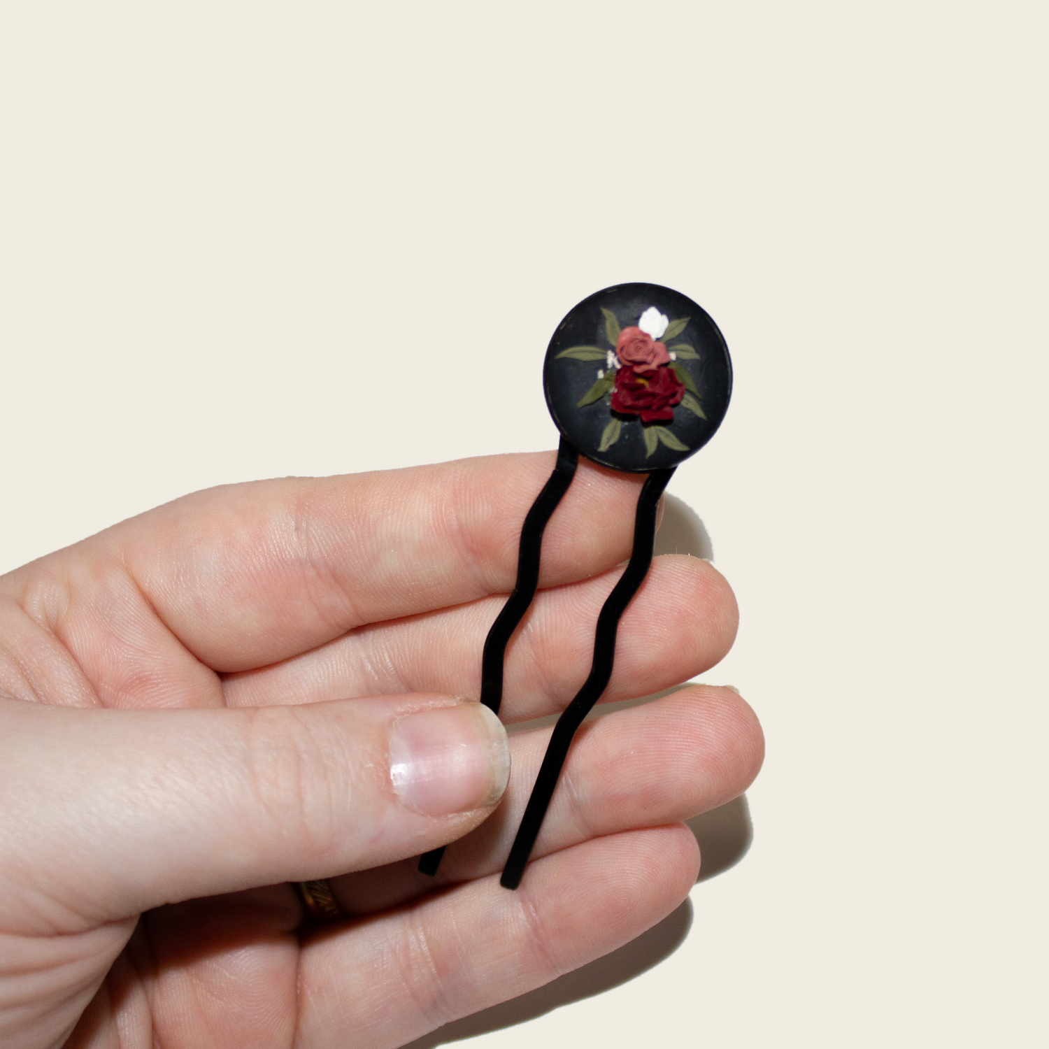 Materials: Polymer clay, resin, black coated brass hair pin setting