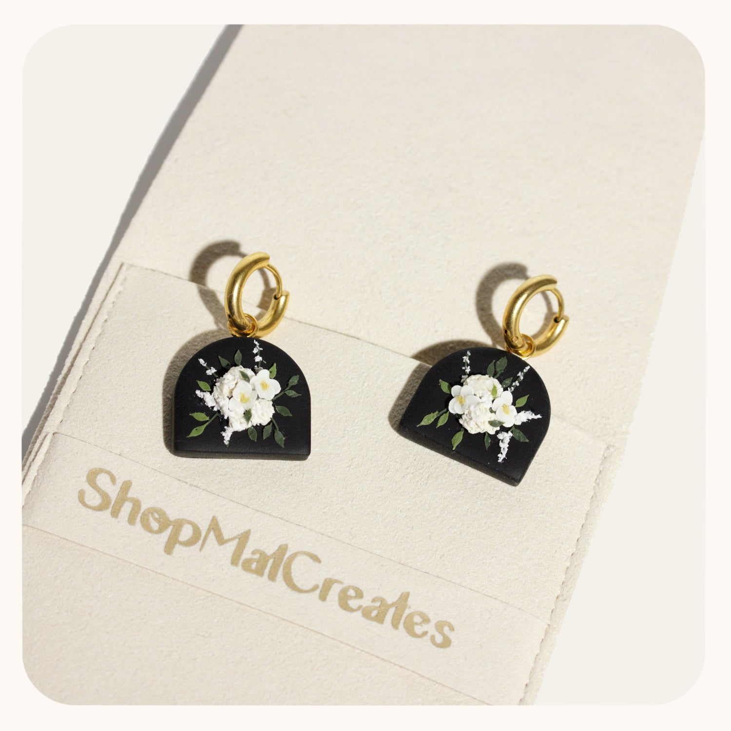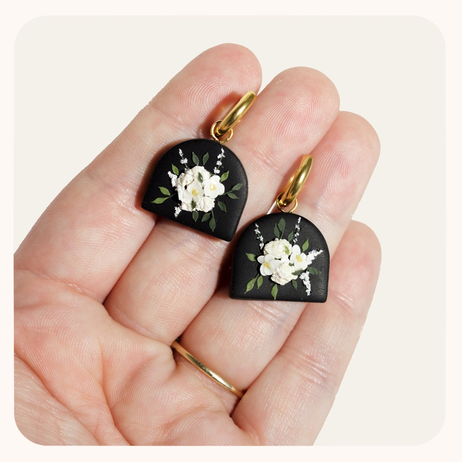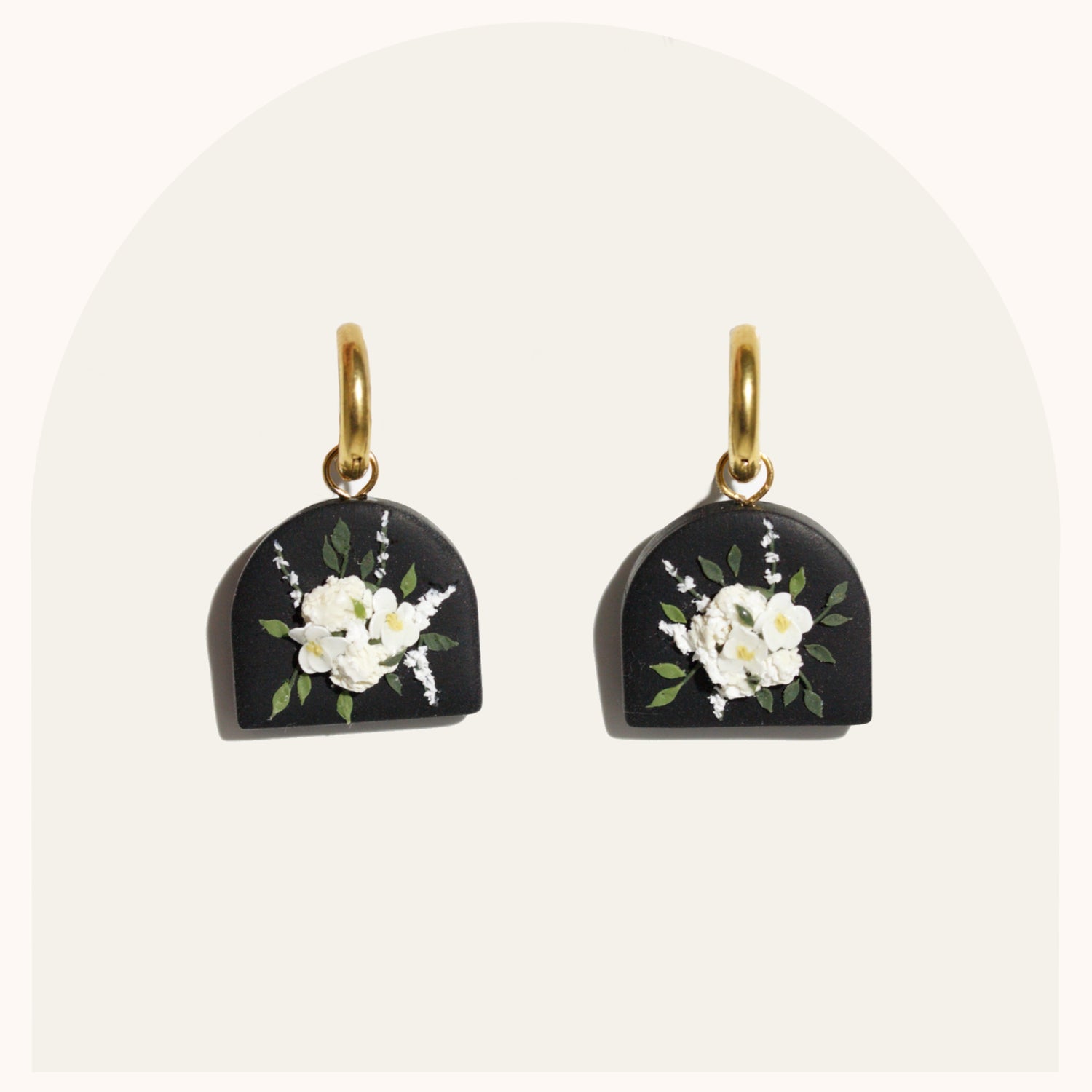 My bouquet earrings are so classic. Each pair is unique, you'll never find a pair that's exactly the same. I spend upwards of 2 hours placing each petal and leaf to make sure the bouquet is cohesive and beautiful.