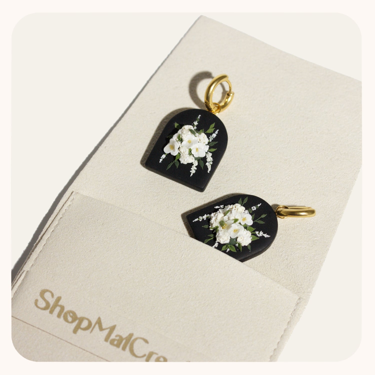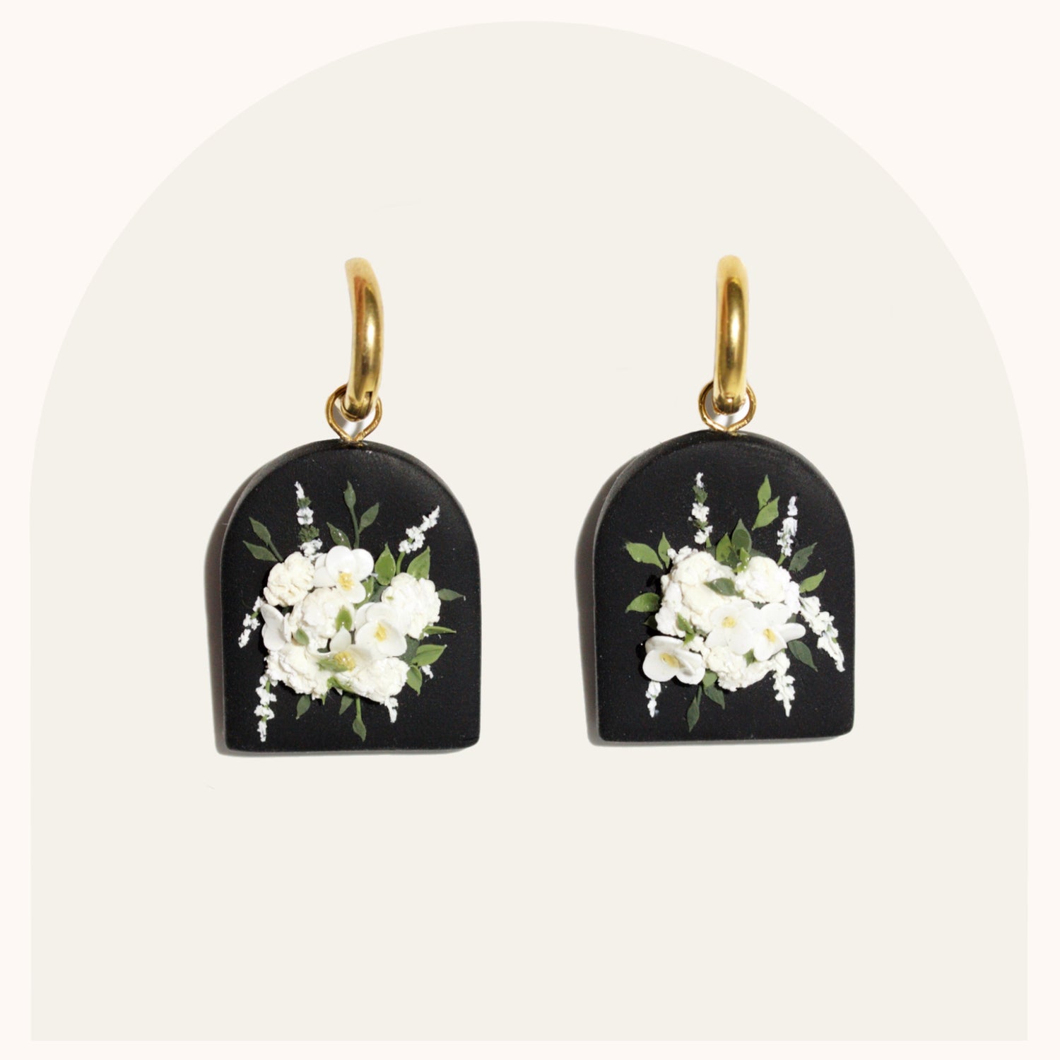 My bouquet earrings are so classic. Each pair is unique, you'll never find a pair that's exactly the same. I spend upwards of 2 hours placing each petal and leaf to make sure the bouquet is cohesive and beautiful.