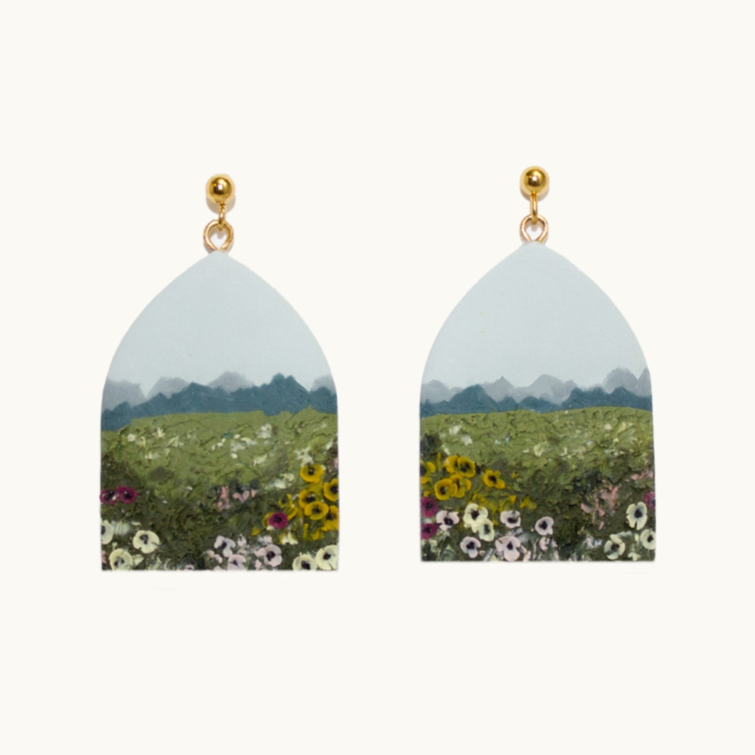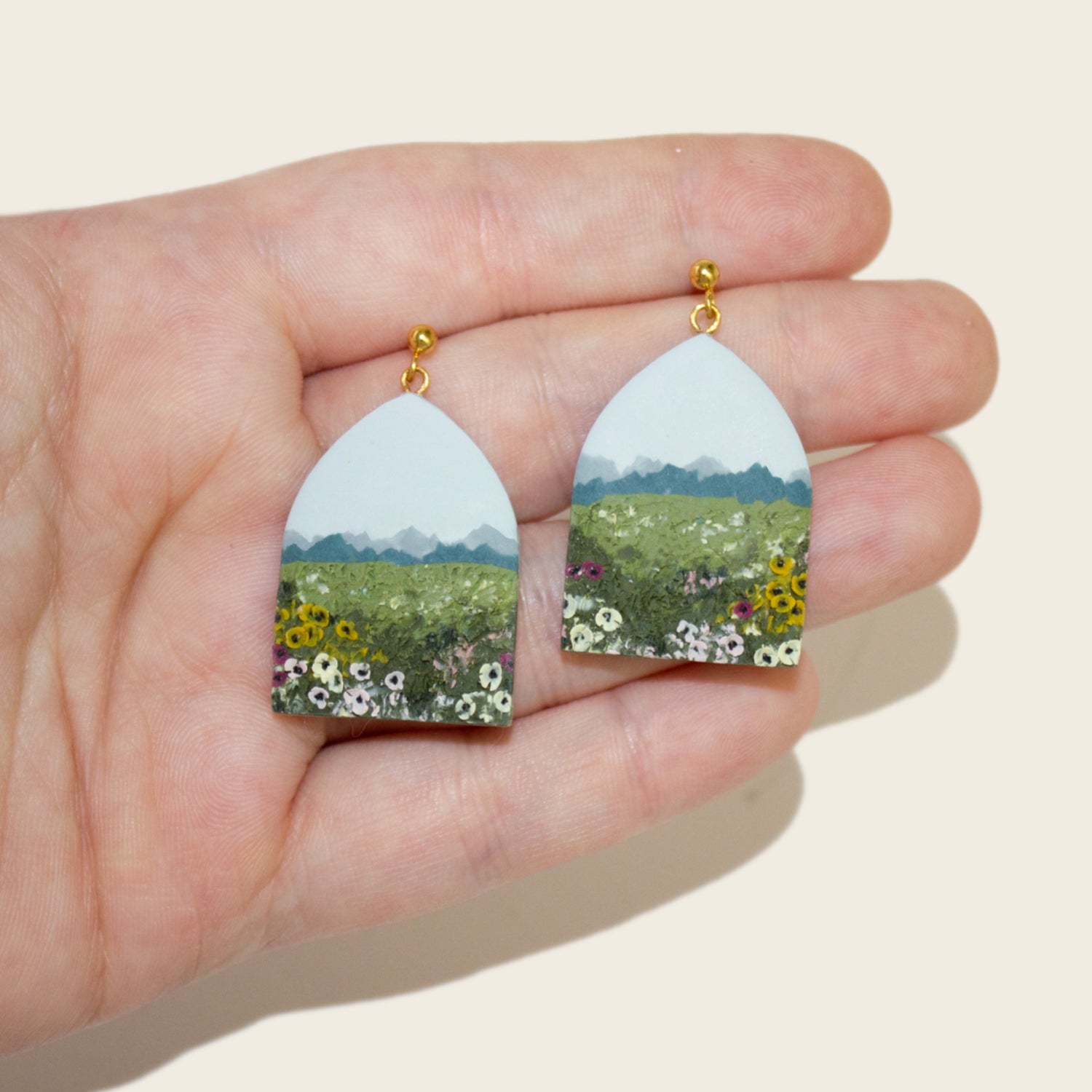 These earrings are a really cute polymer clay version of a flowery hill beneath the blue ridge mountains!