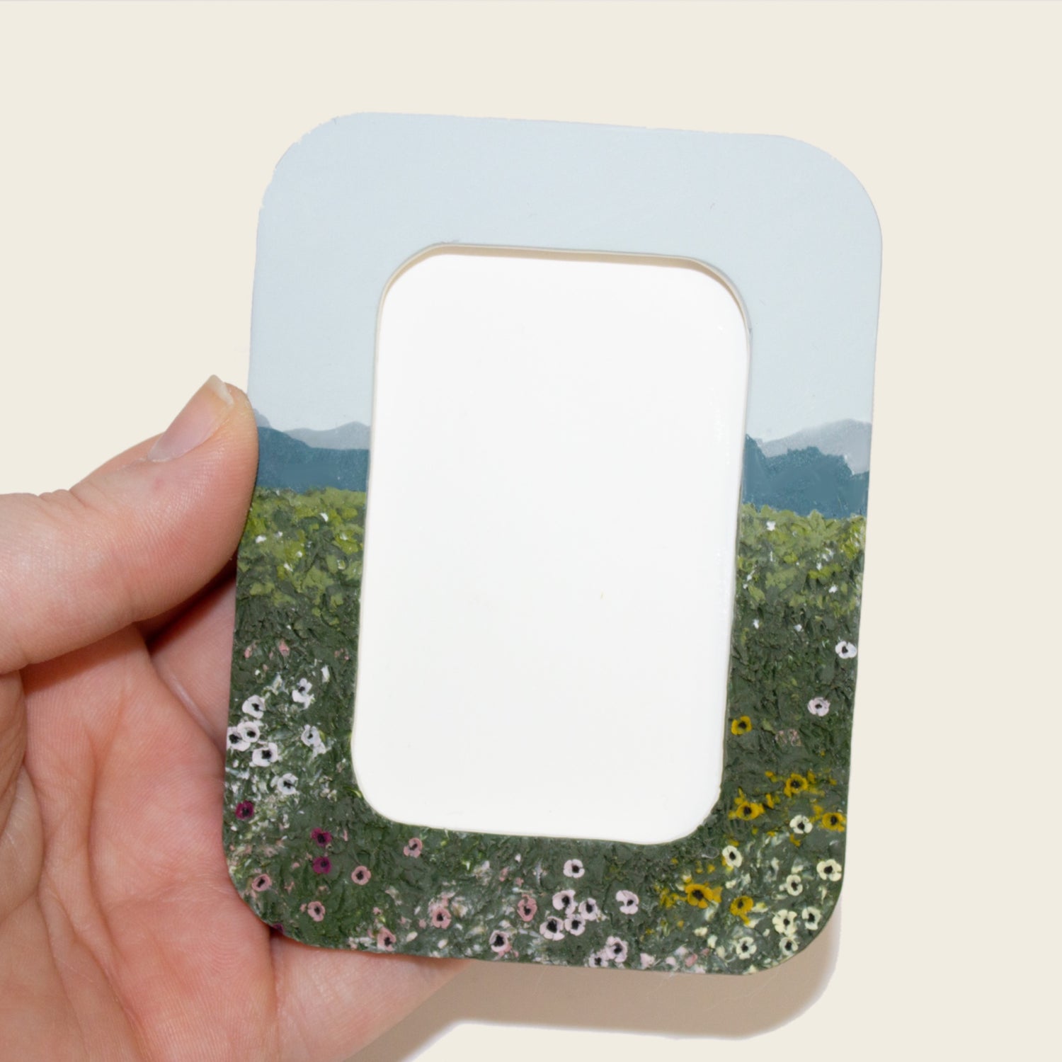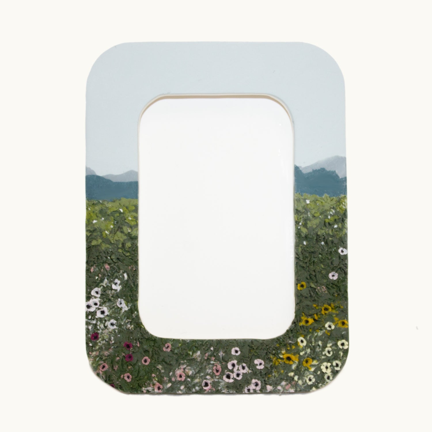 This frame is a really cute polymer clay version of a flowery hill beneath the blue ridge mountains! This one holds a very special place in my heart. I always loved seeing those blue mountains off in the distance.