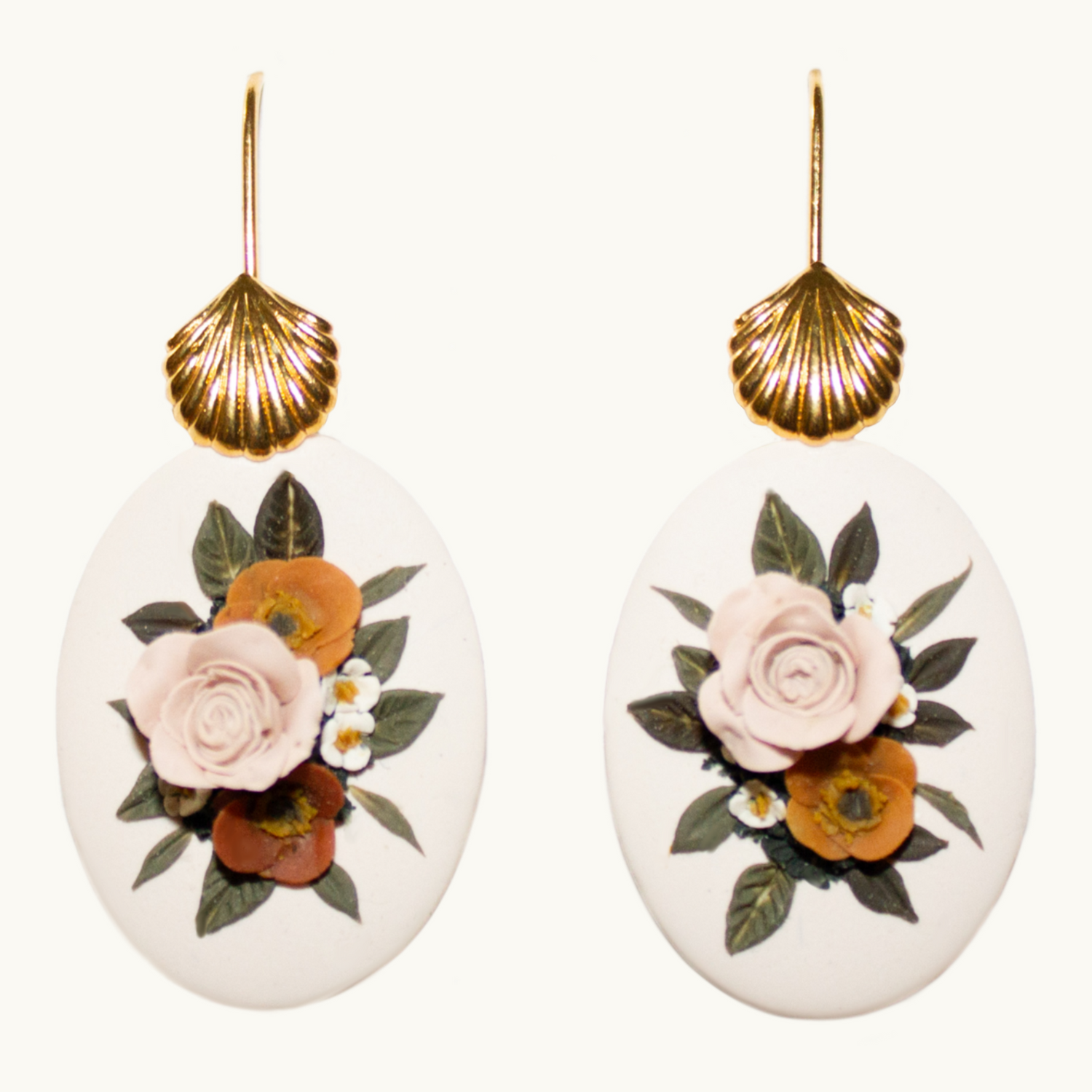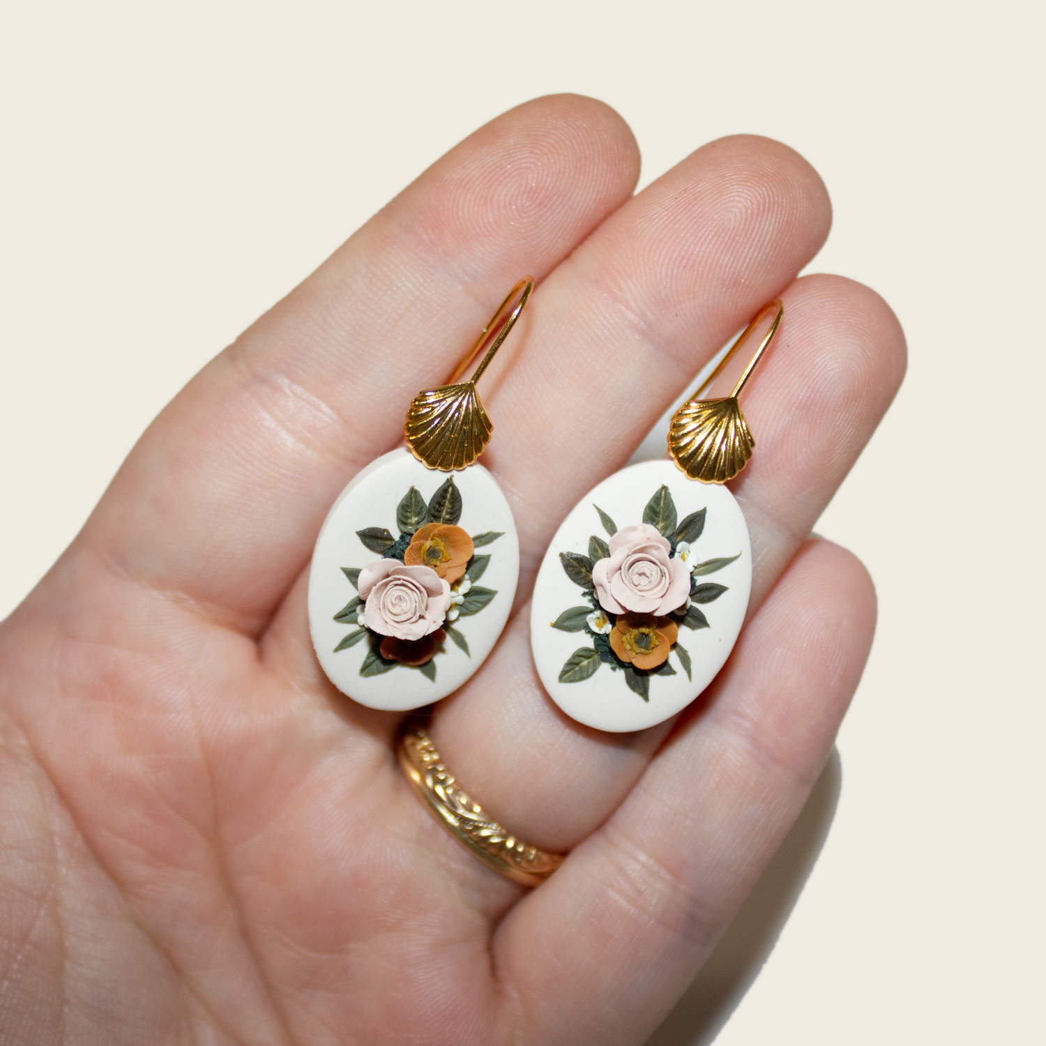 Materials: Polymer clay, resin, gold filled wire, gold filled hook earring posts