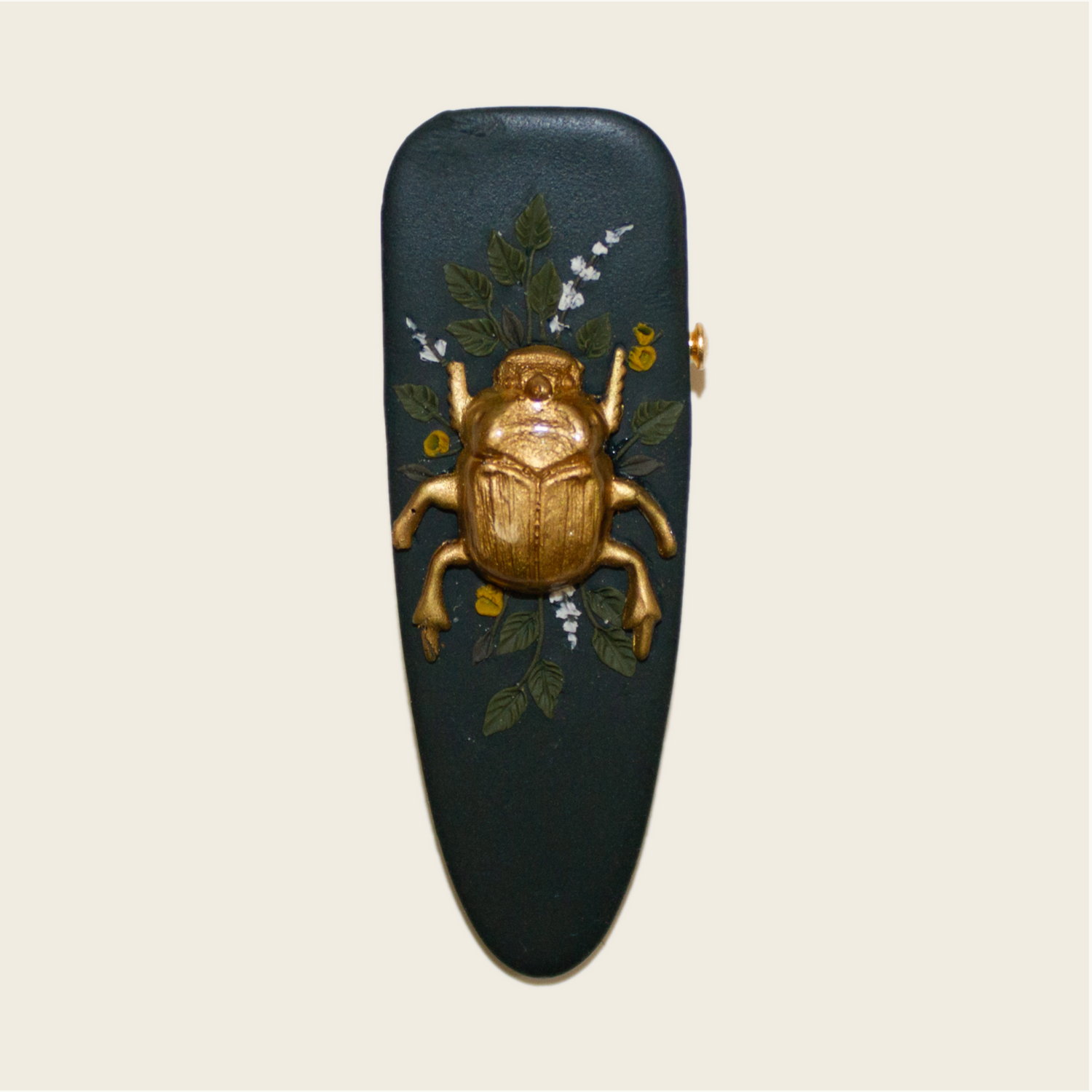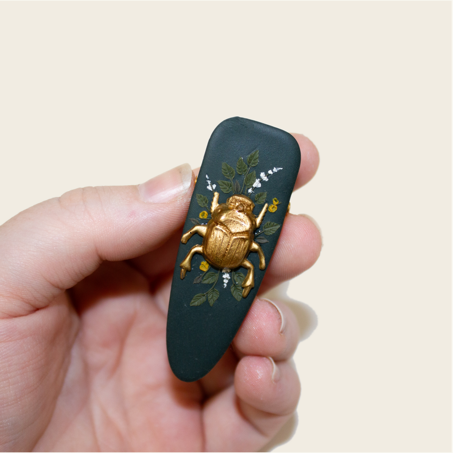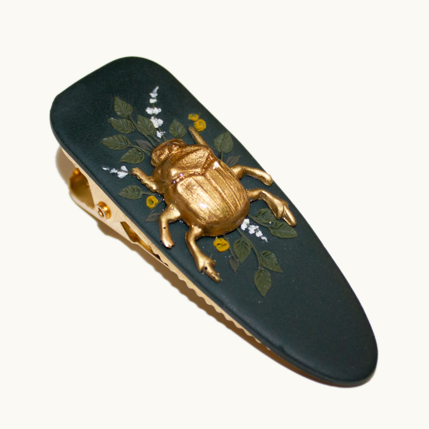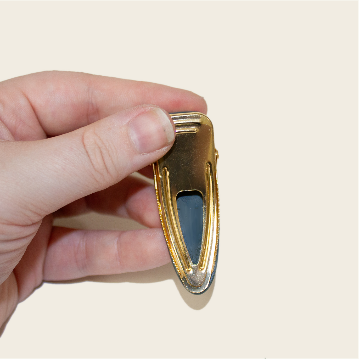 Materials: polymer clay, gold paint, resin, polyurethane sealant, gold plated alligator clip