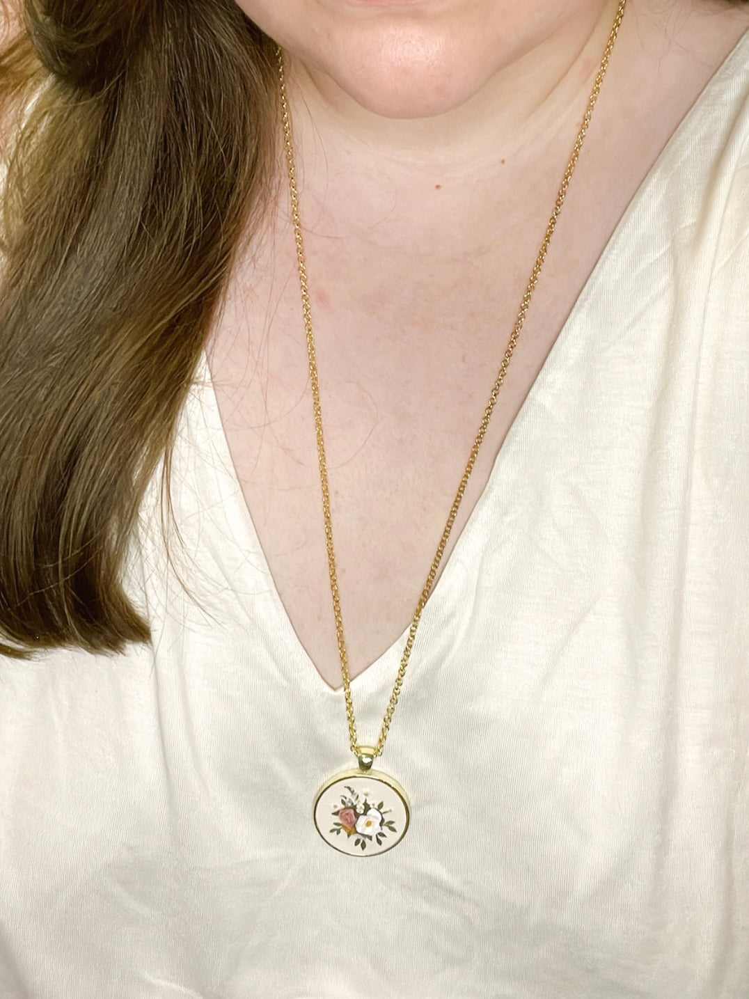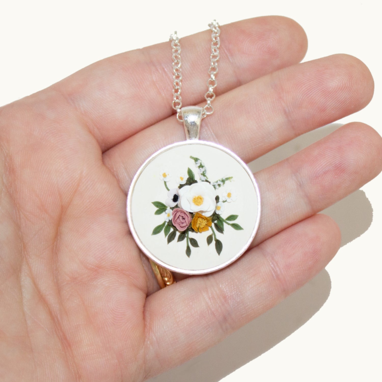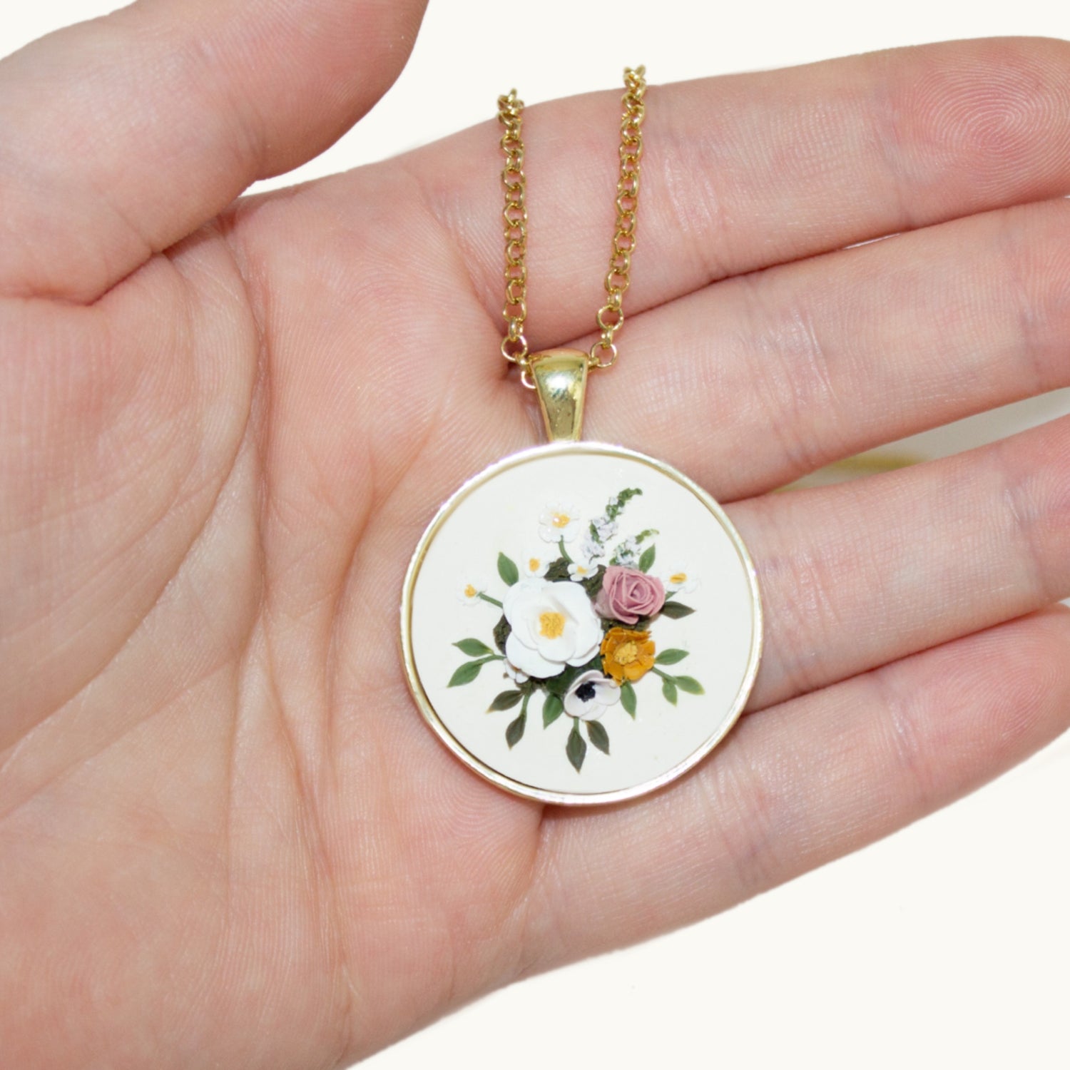 The bouquet on these pendants is some of my best work! It's a super detailed little spring floral bouquet featuring roses, poppies, carnations, daisies, foxglove... the list goes on!