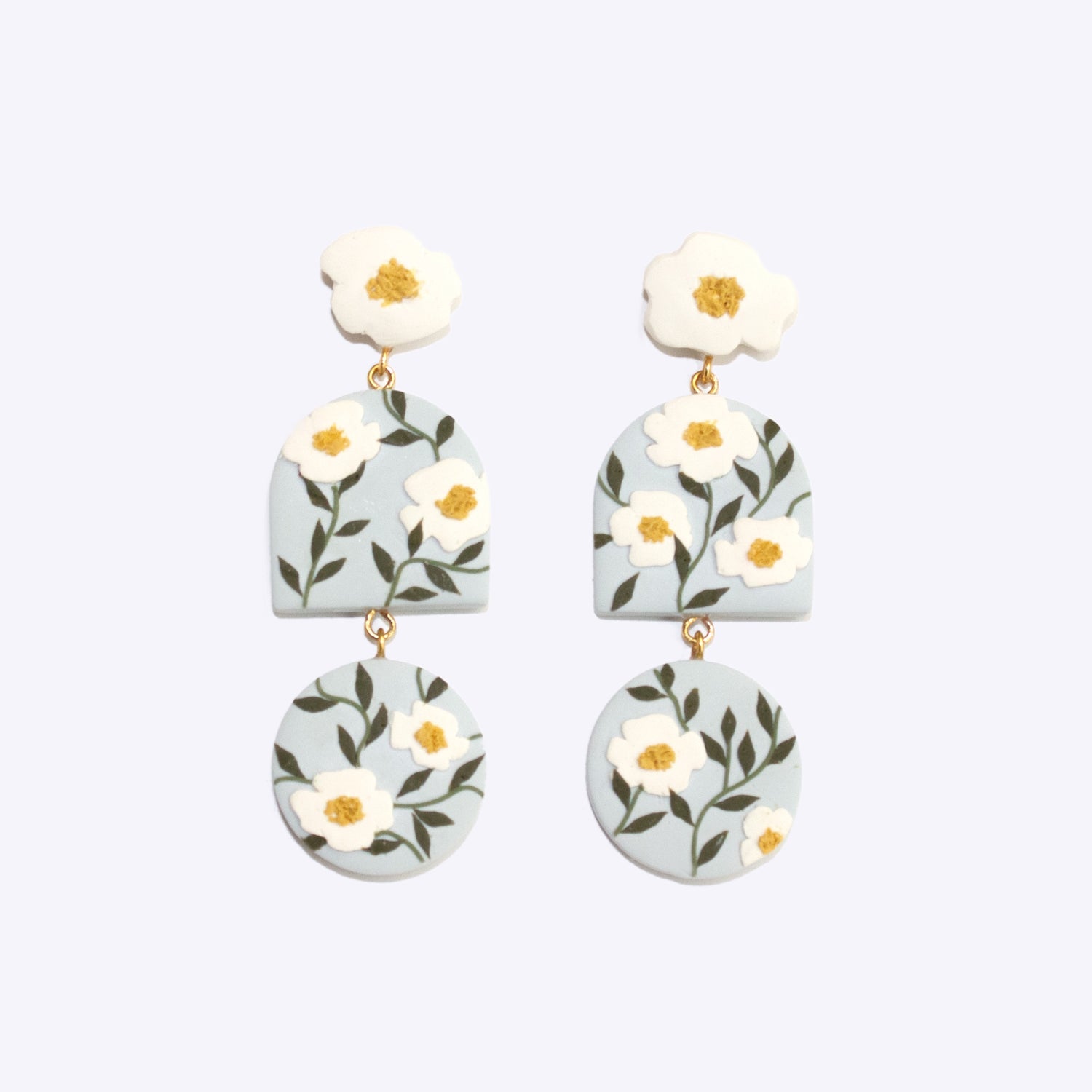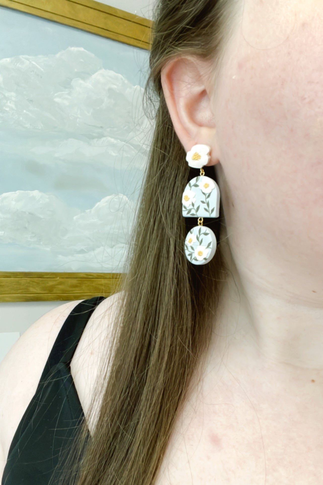 These earrings have a beautiful light blue base with a peony pattern design! The stud is a small, cream colored flower. The whole design has so much movement and looks absolutely amazing on your ears.