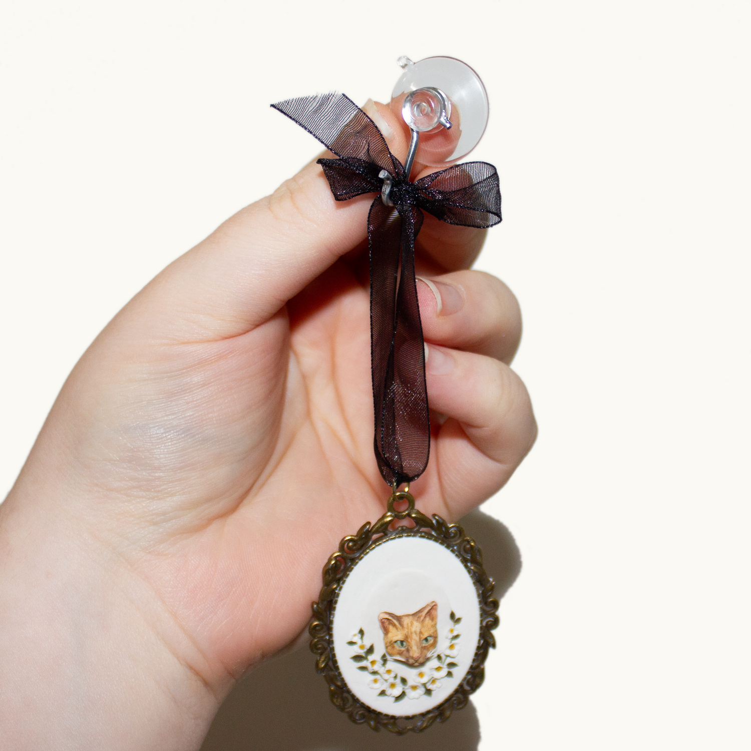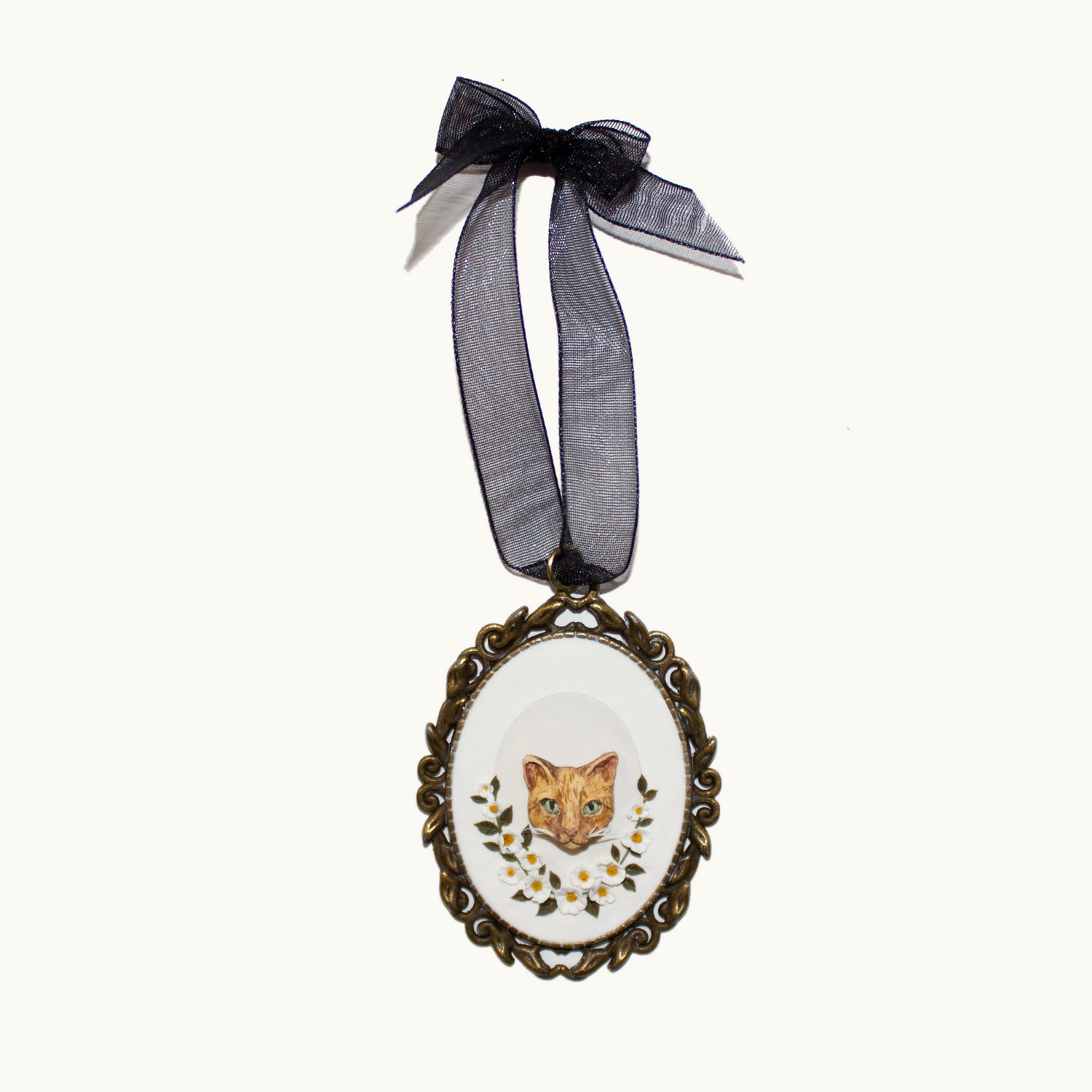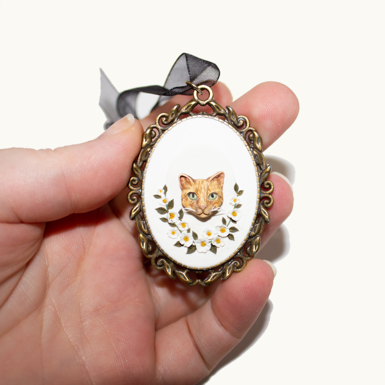Materials: Polymer clay, resin, brass setting, ribbon