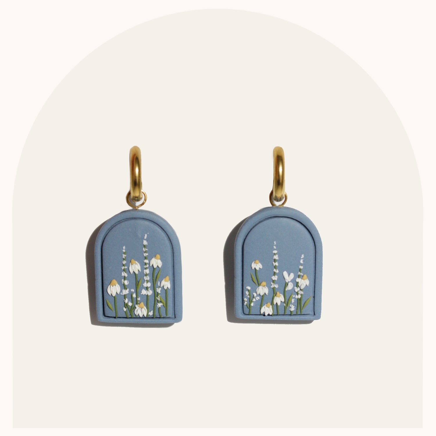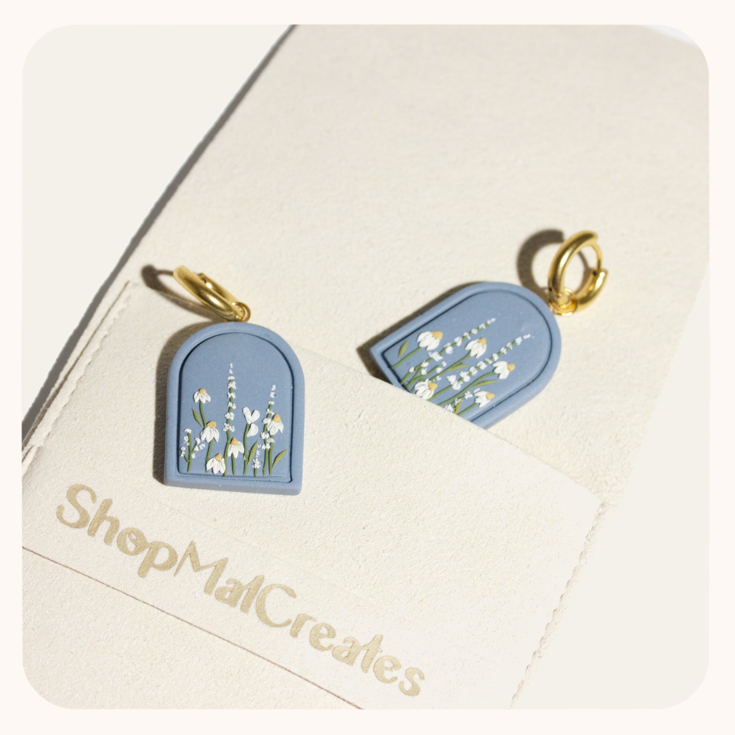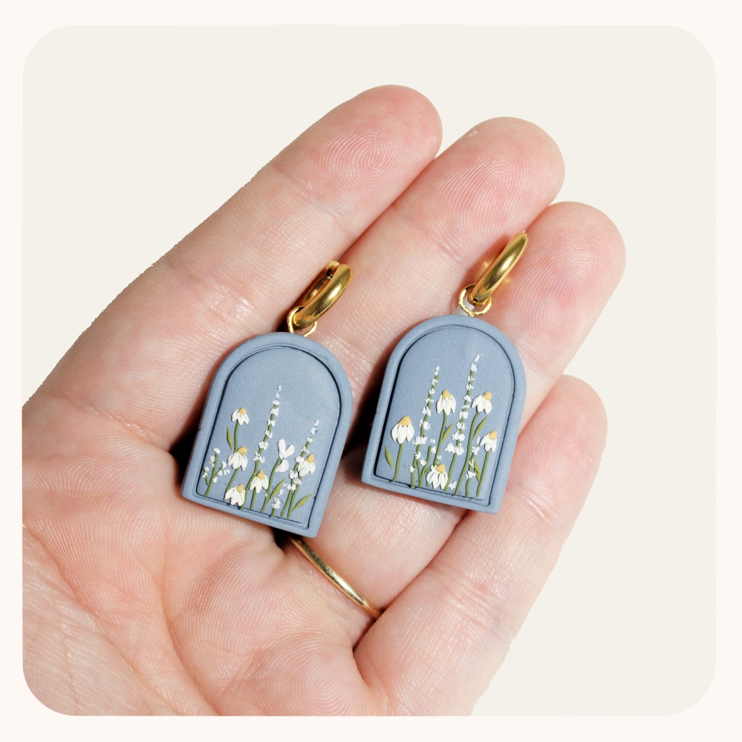 I love creating mini gardens for your ears. This pair is a sky-blue base color with white daisies and Foxglove. Looking at them makes me crave spring!