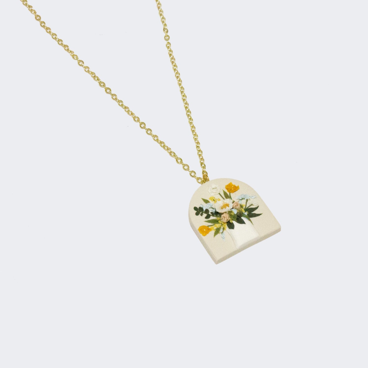This necklace features a beautiful floral arrangement in a white vase. The clay pendant itself is a cream color and the bouquet has blue, tangerine, white, pink and yellow flowers accented with deep green foliage!