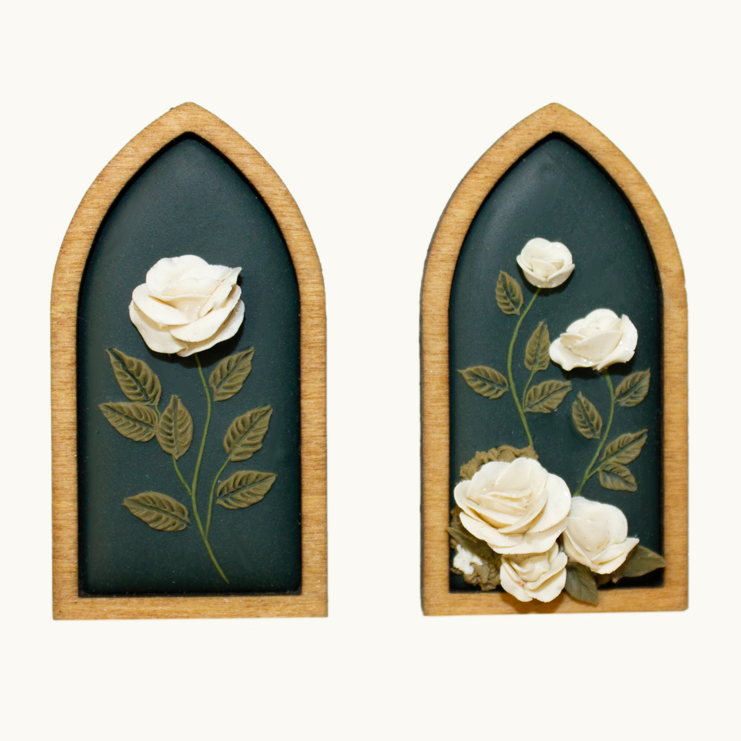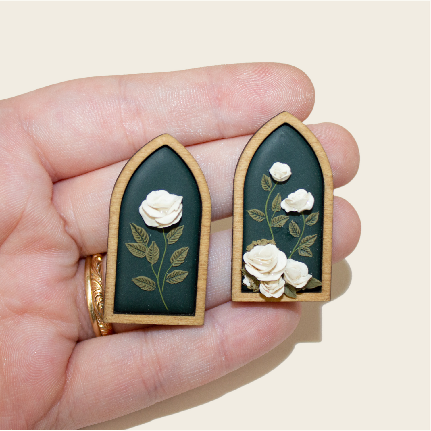These earrings feature tiny rose gardens and a single-stem rose. I've been working really hard lately to improve my floral skills, I hope you love them! The base clay color is a pretty emerald green.