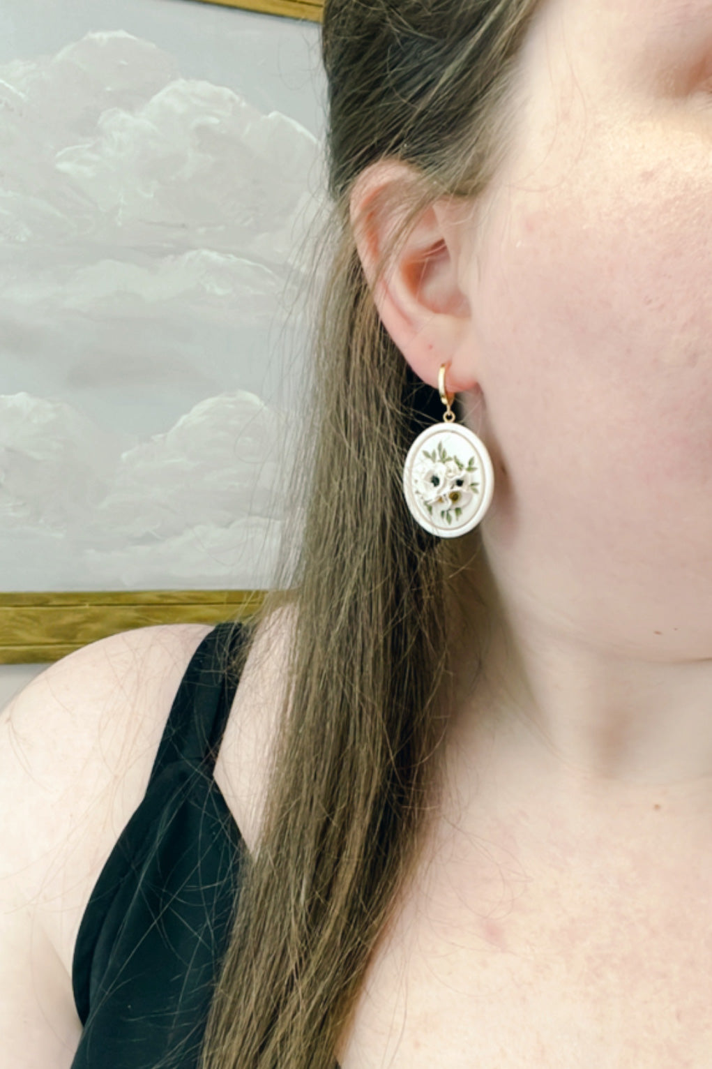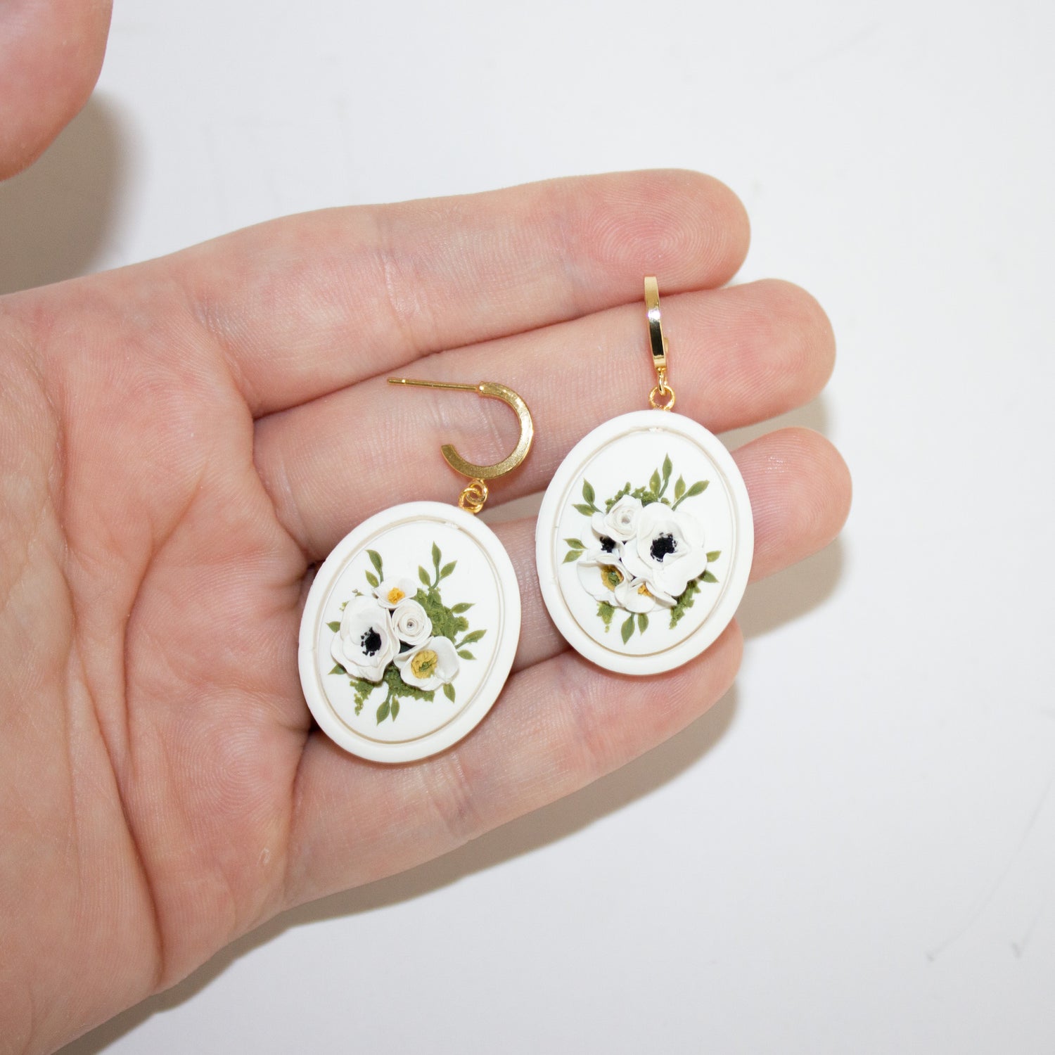 These earrings feature an adorable bouquet of white flowers on a white oval base. The oval base has an outline detail that elevates the entire design :)