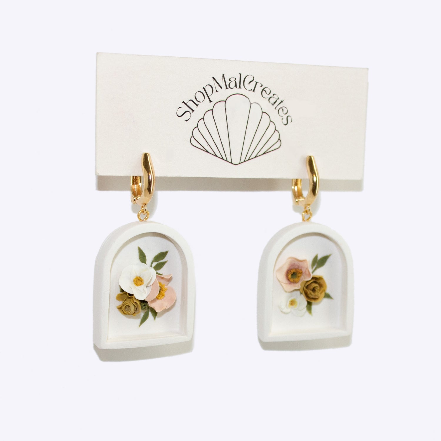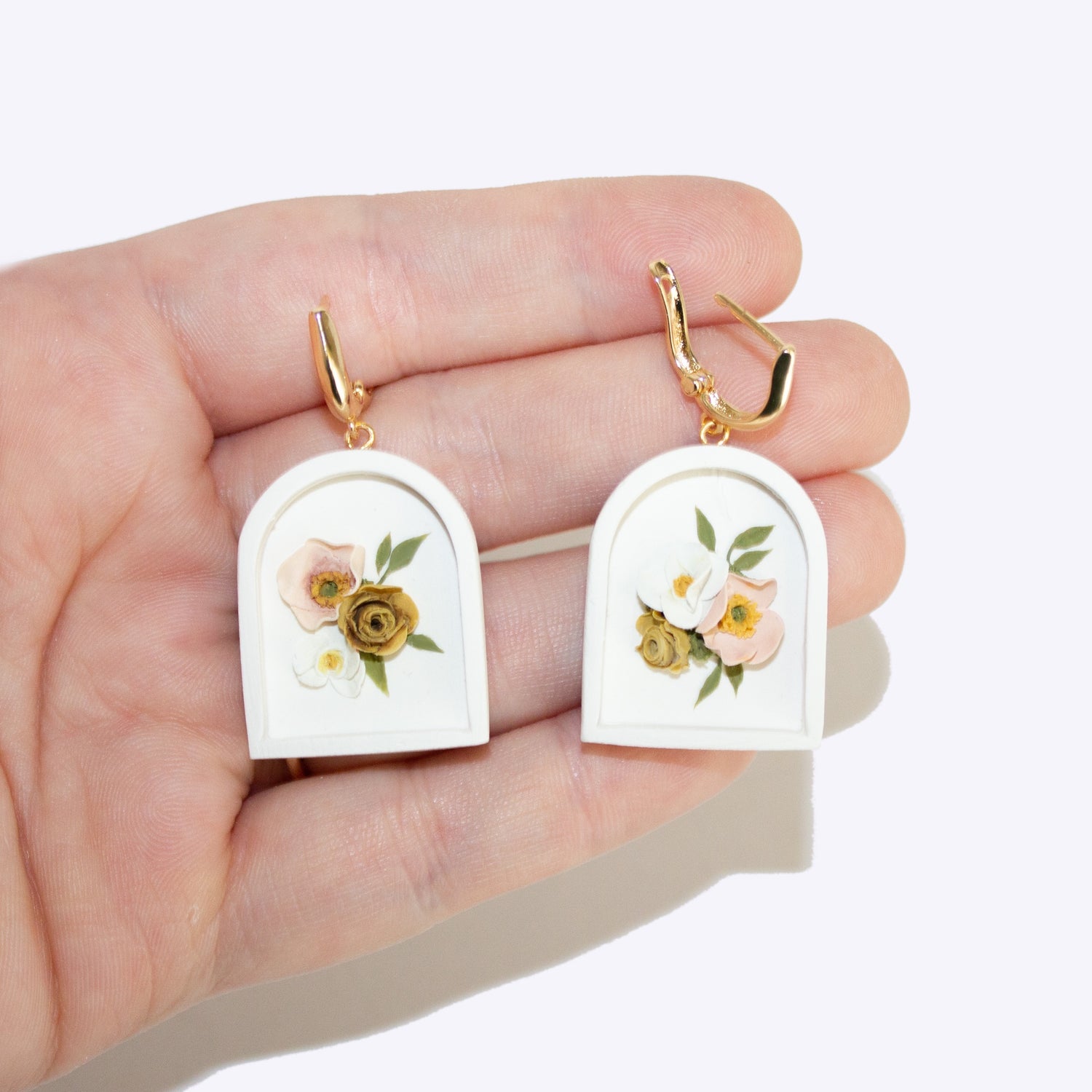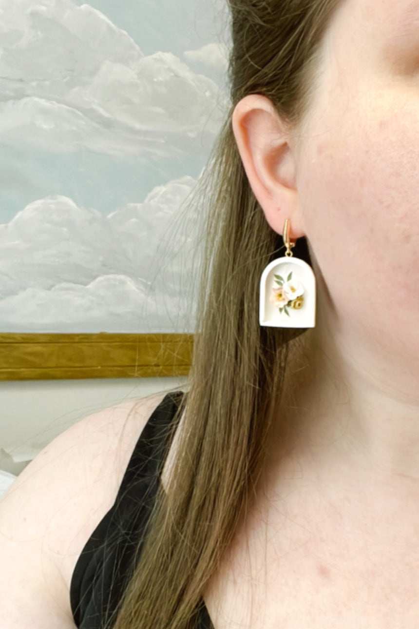 These earrings feature an adorable spring bouquet of peonies, roses, and orchids. The bouquet is set inside a framed piece of clay. I like to think of it kind of like a little picture frame :)