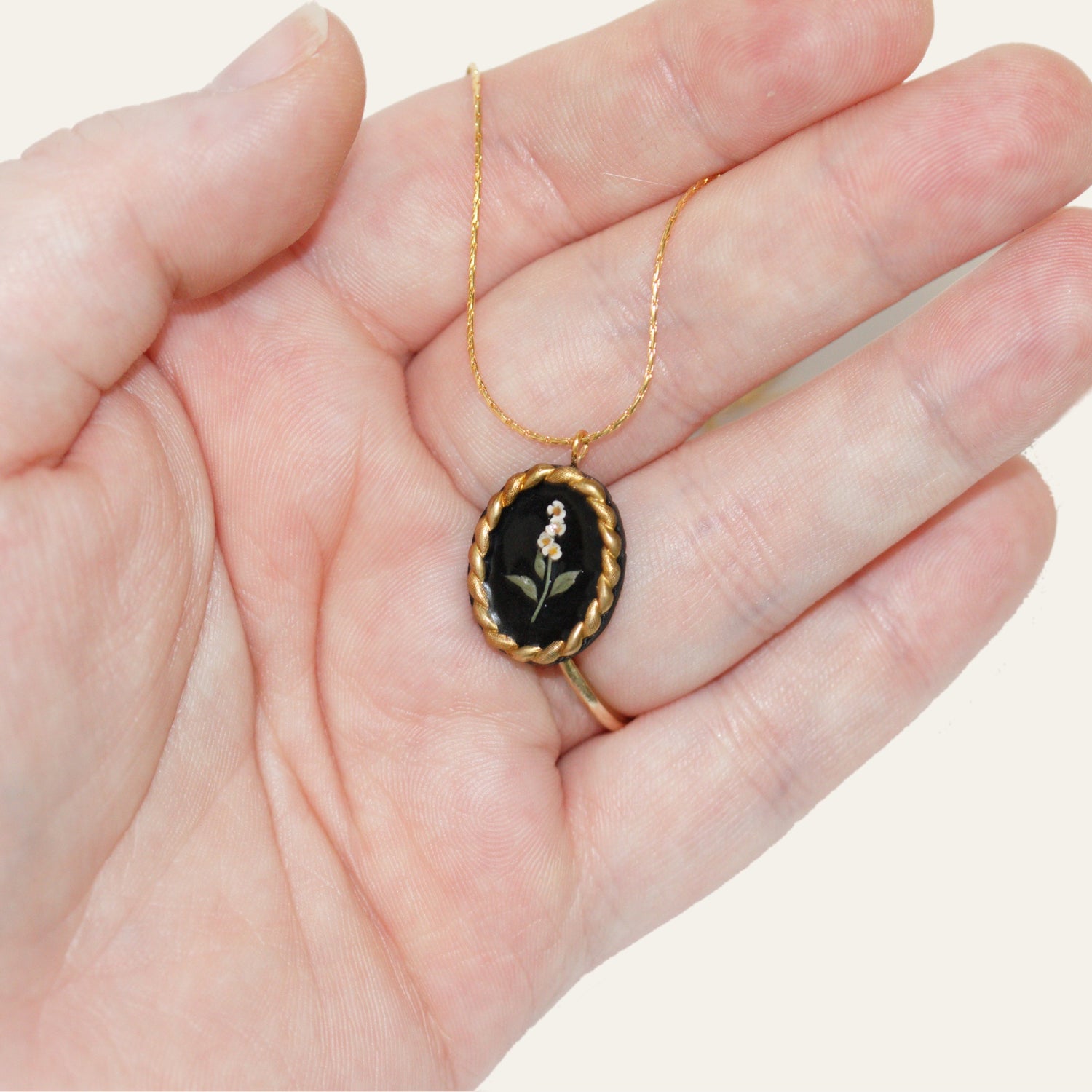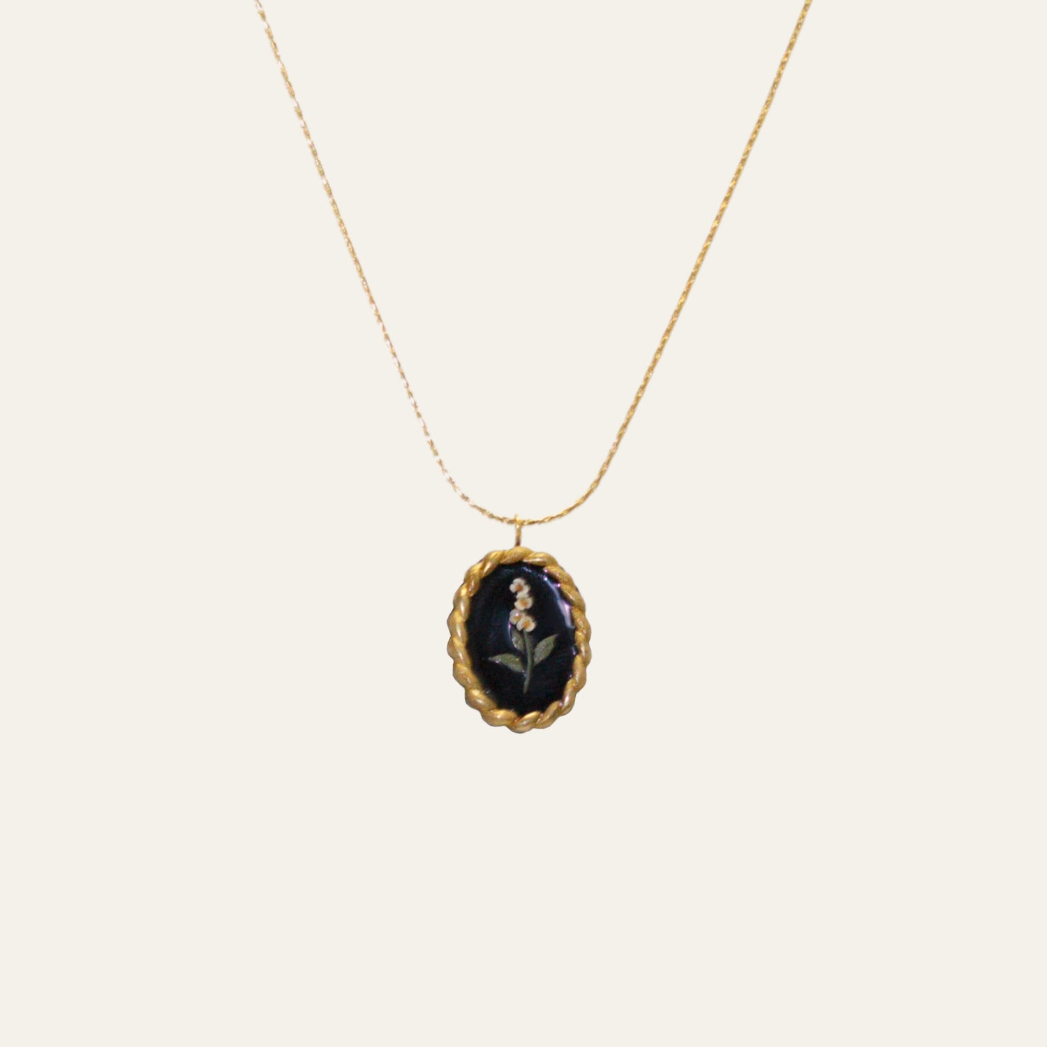 Here we have a tiny floral stem detail inside a twisted brass frame with a black clay base. So simple but so, so sweet.