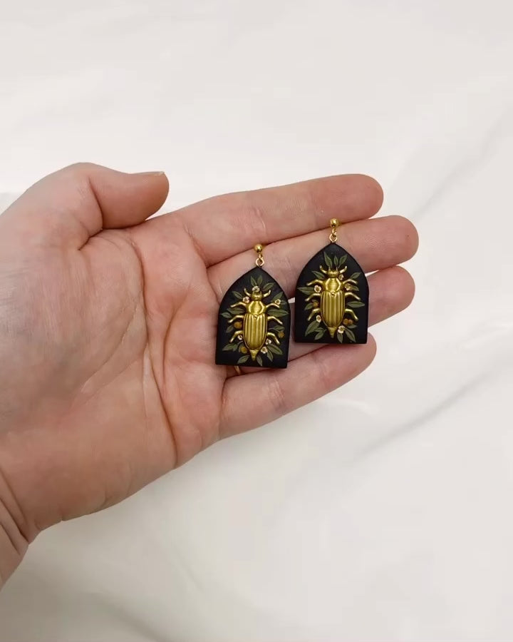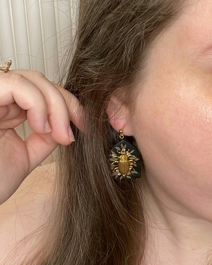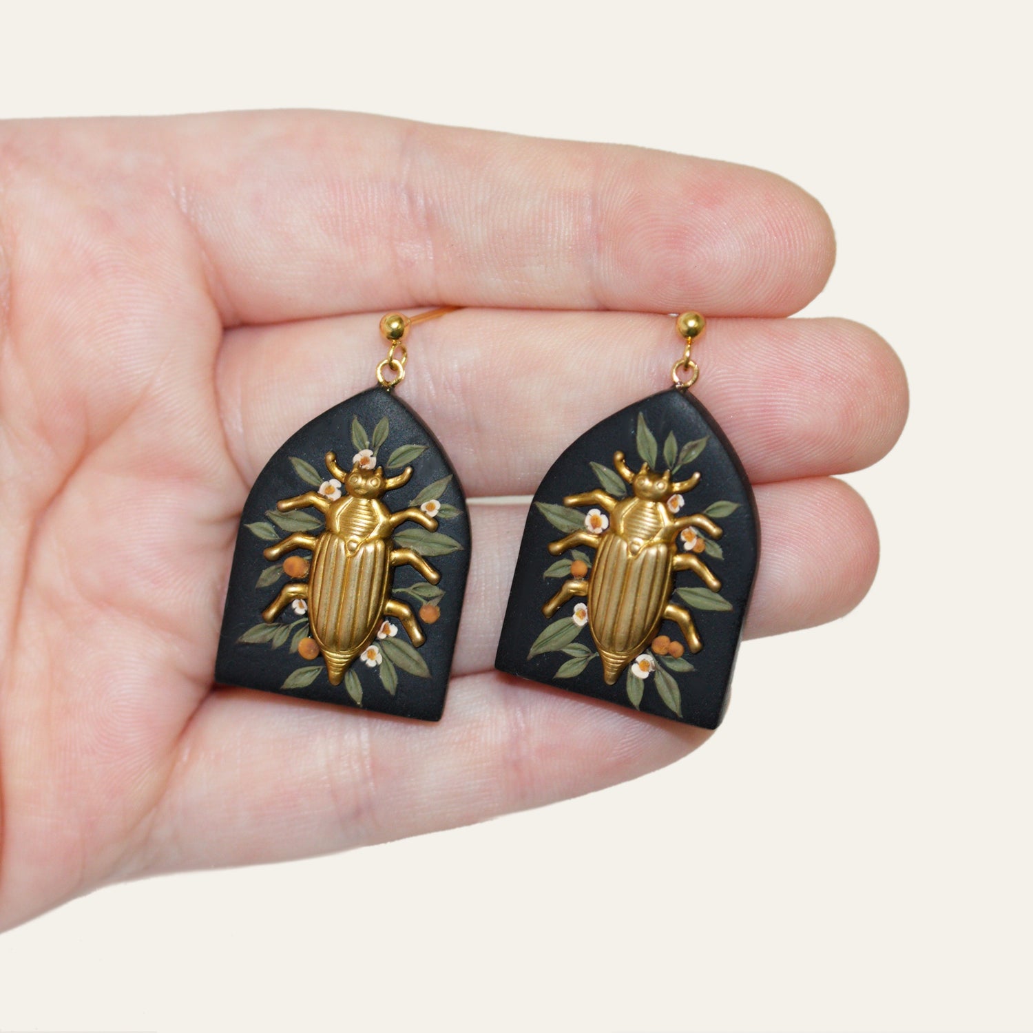 These earrings feature an adorable brass june bug in the middle of a bouquet of foliage, little white flowers, and a pop of burnt orange.