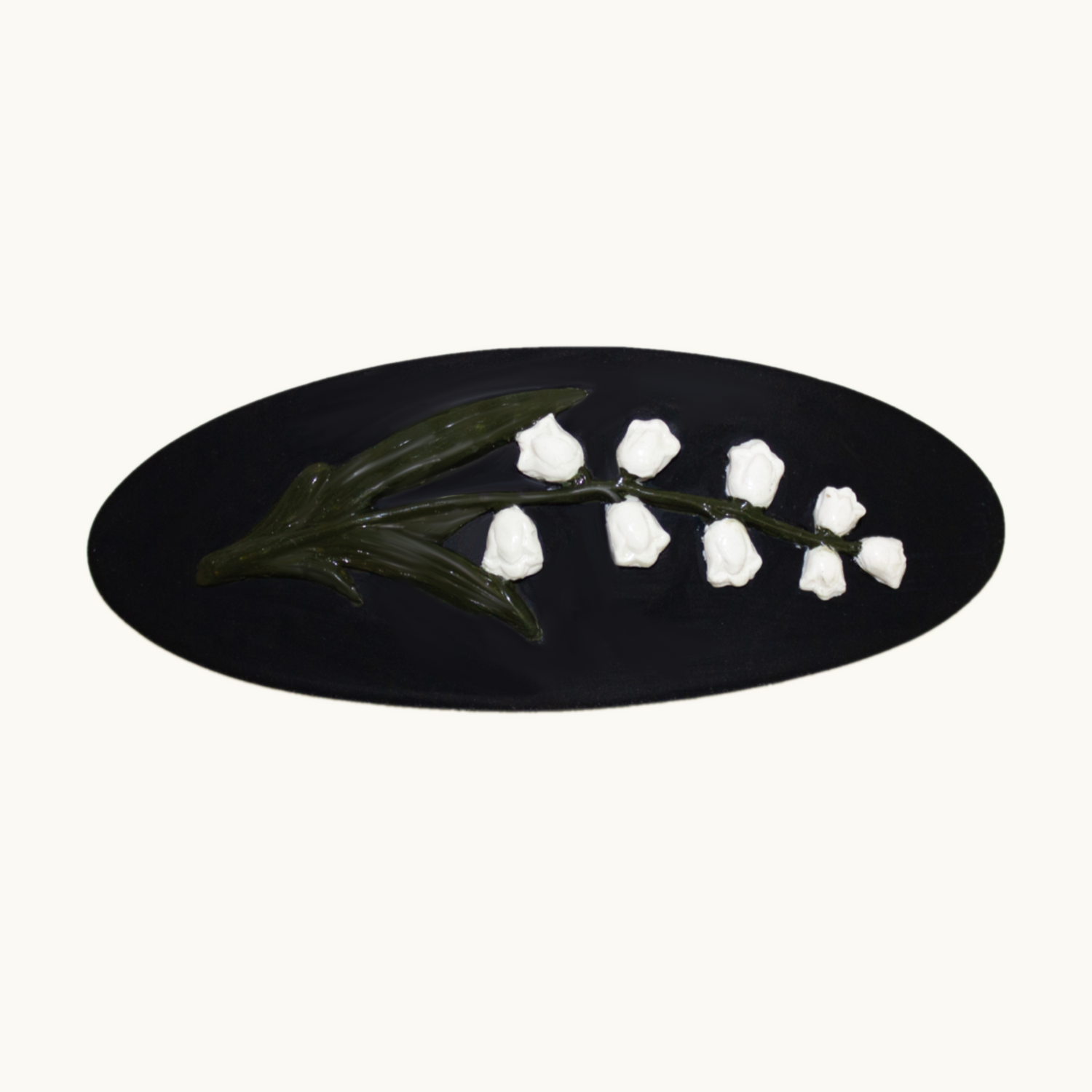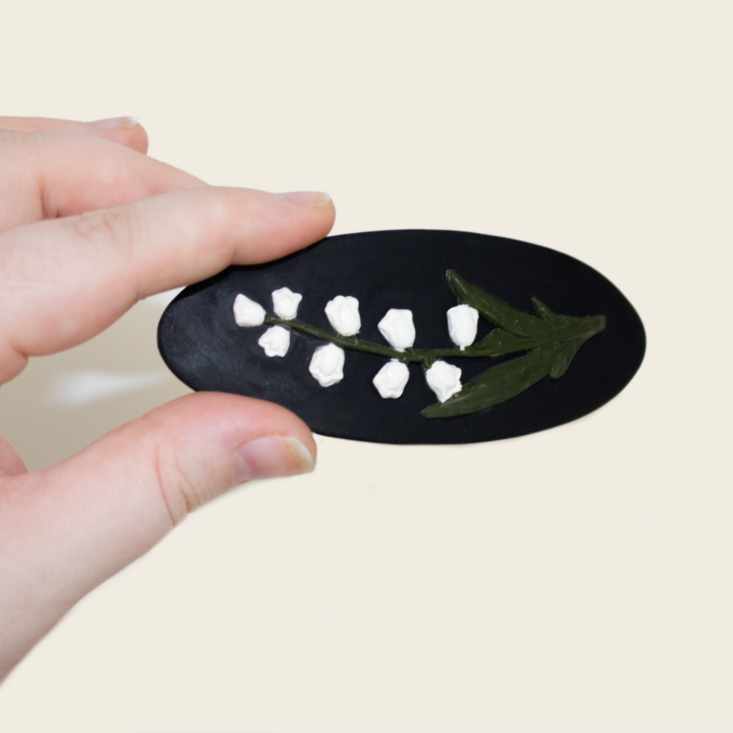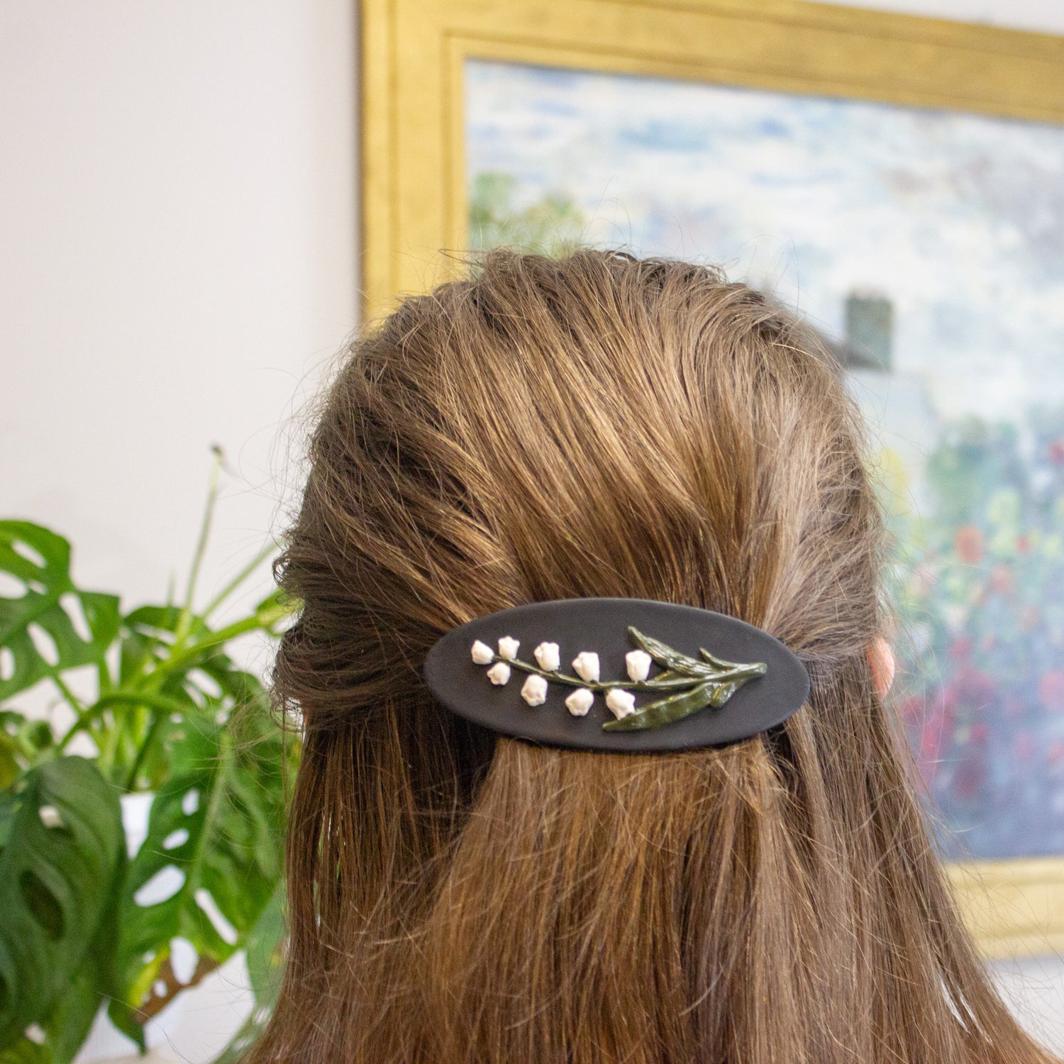 This barrette is a really sweet and simple design, It's a hand painted clay lily of the valley flower on a black oval base.