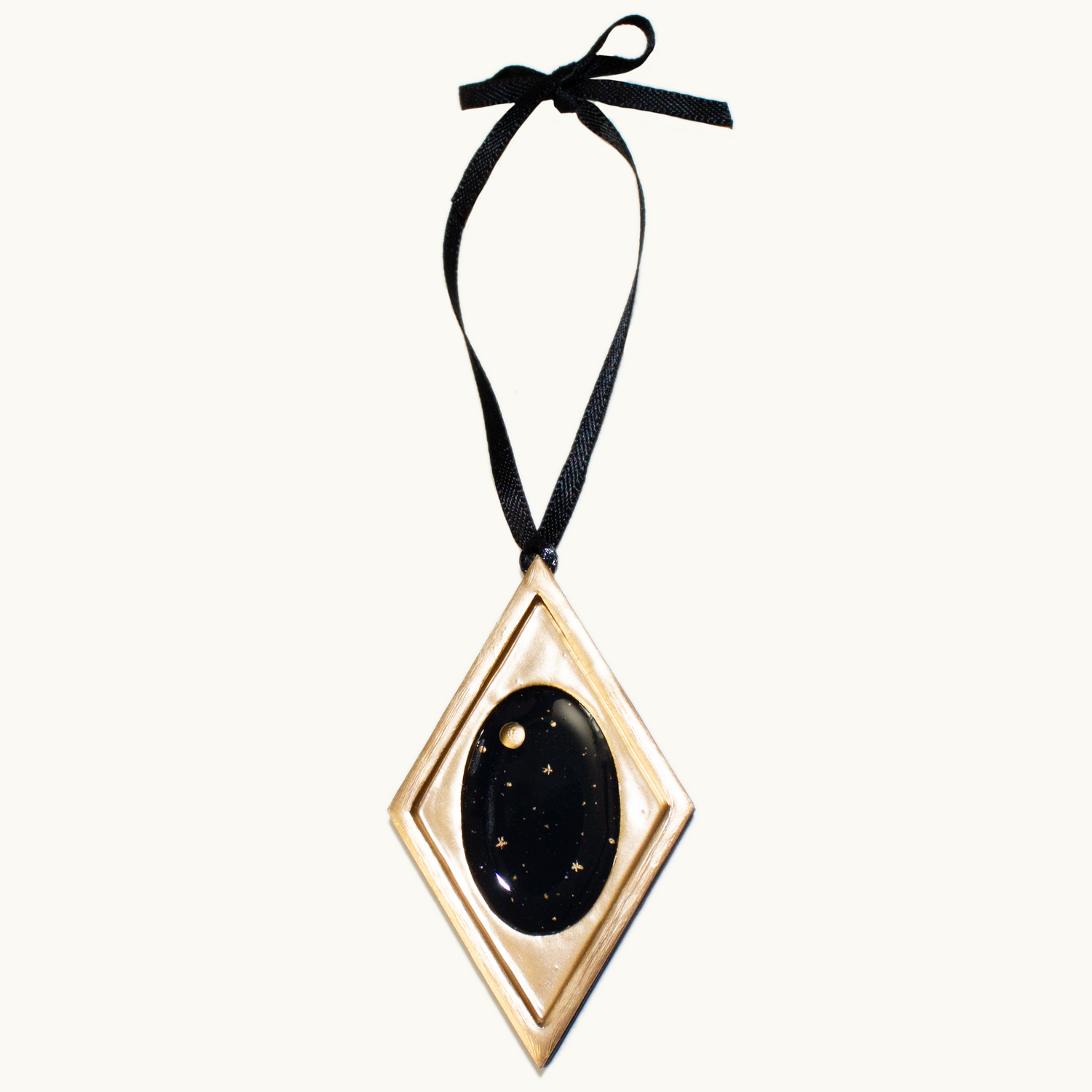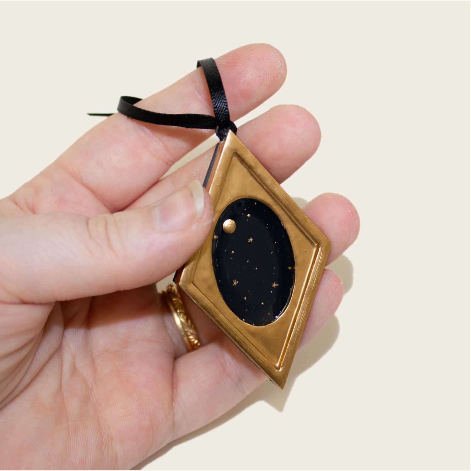 - Materials: polymer clay, gold paint, resin, acrylic, black ribbon.