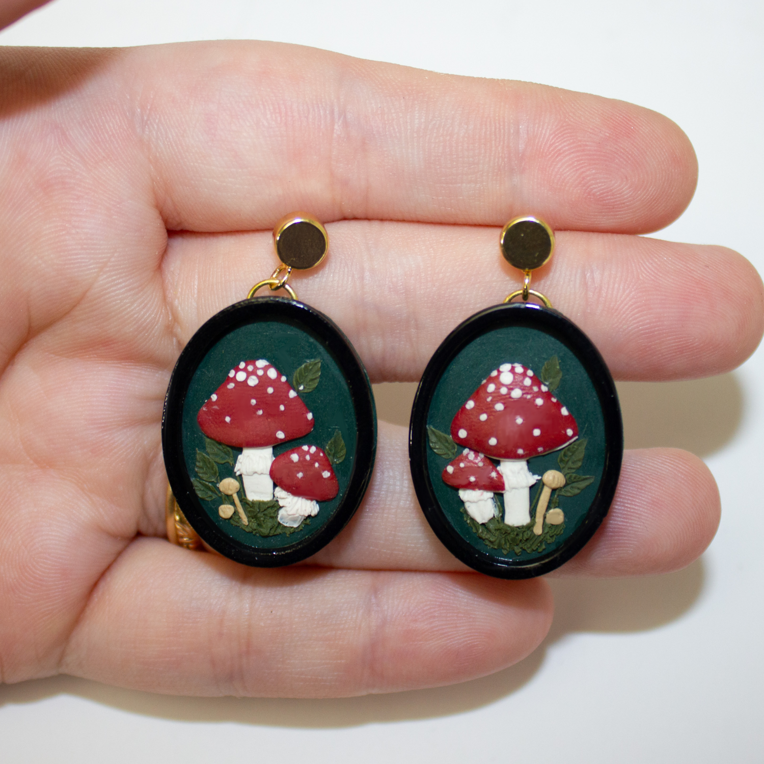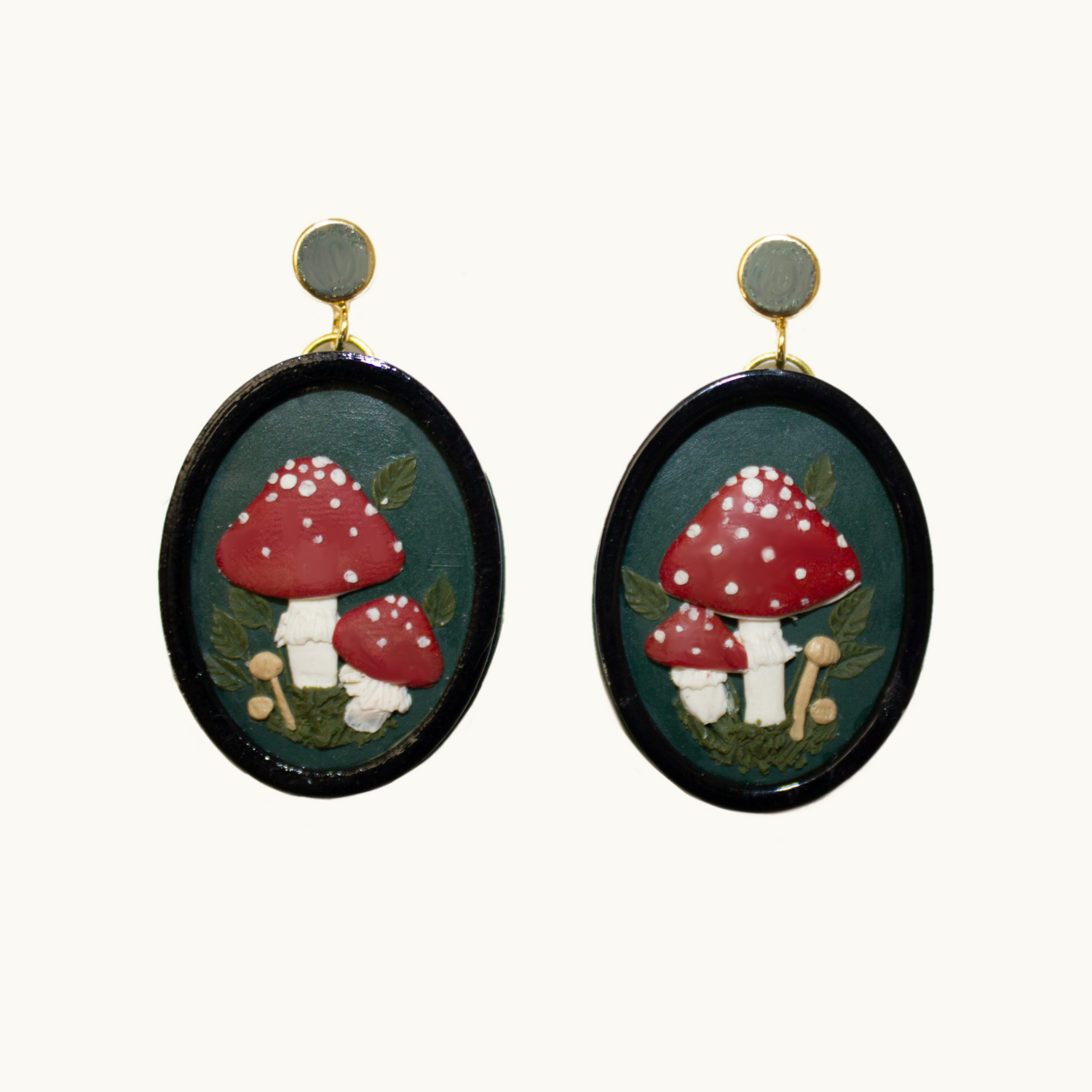 These earrings feature an adorable little mushroom forest on a pine green base. They're framed with a thin, black oval frame to finish the look :)