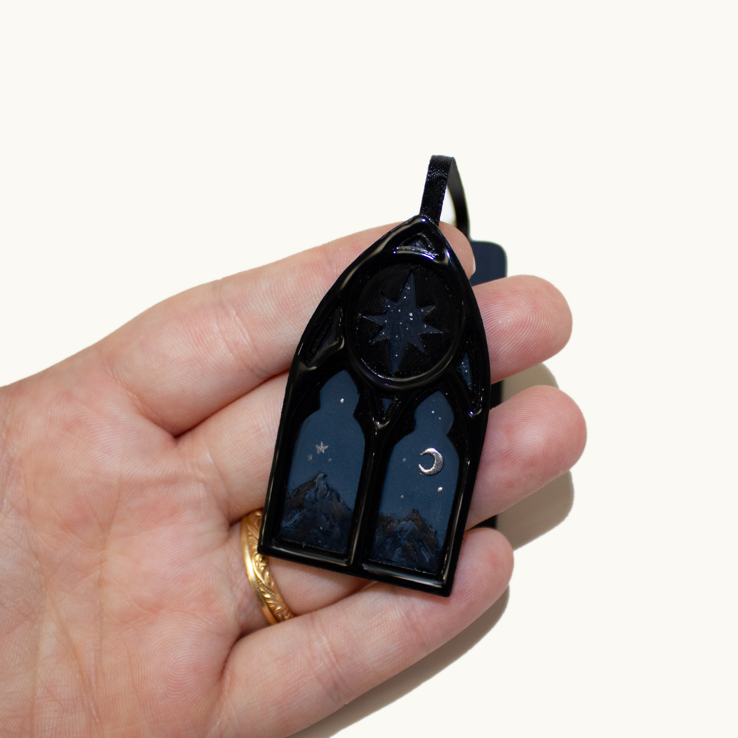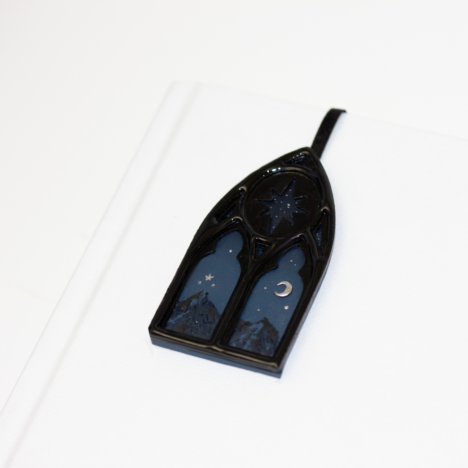 The art features the Ramiel mountain under the night sky through the view of a cathedral window.