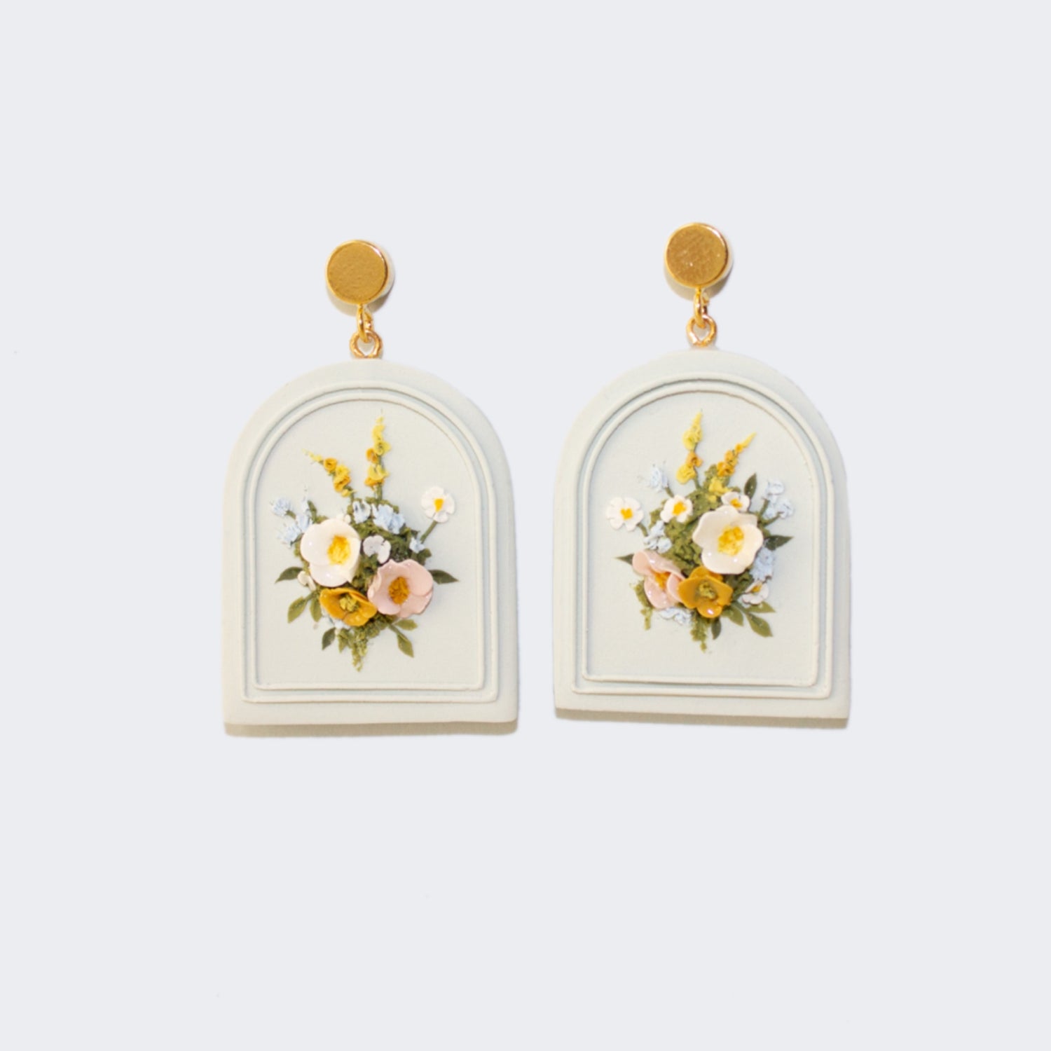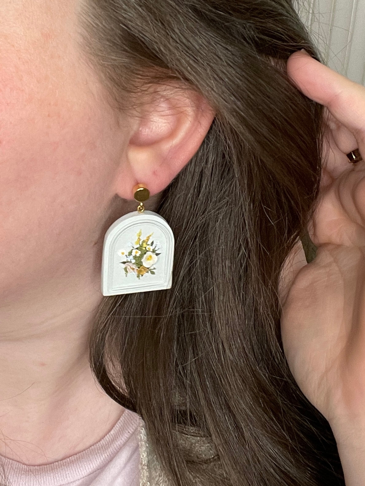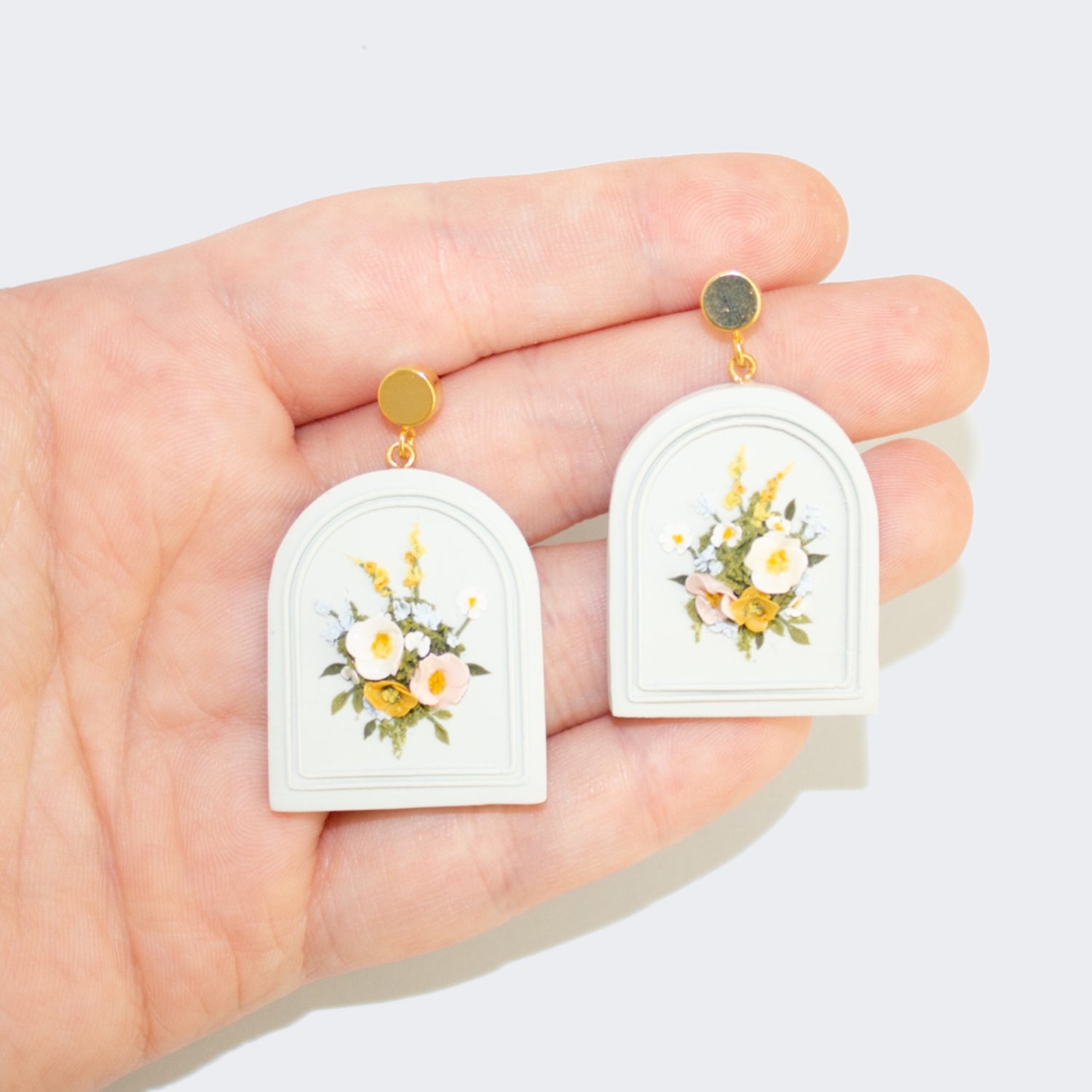 This pair of earrings has a beautiful vintage spring feel, with the delicate border and fun pastel colors. The bouquet itself is some of my best work! The florals are so detailed and the colors I used work perfectly together.
