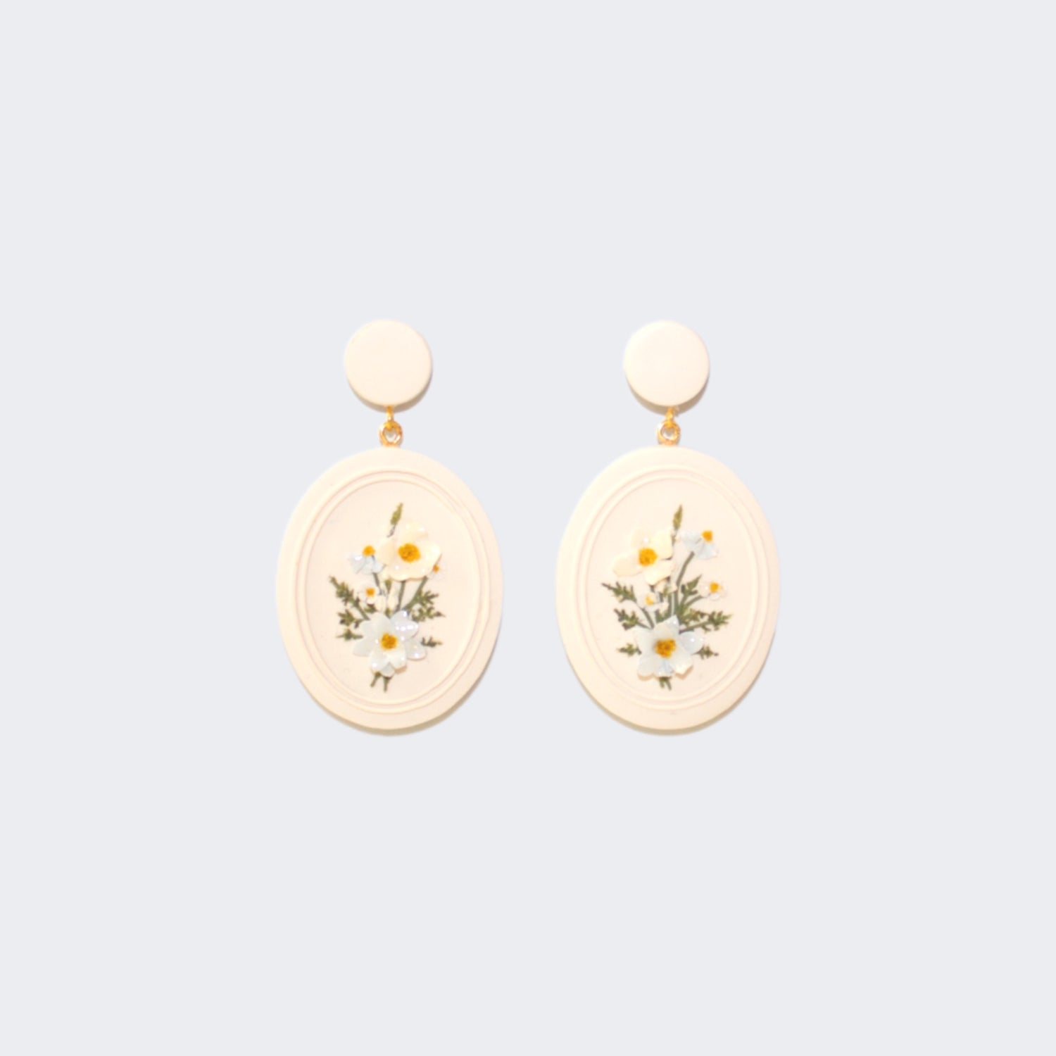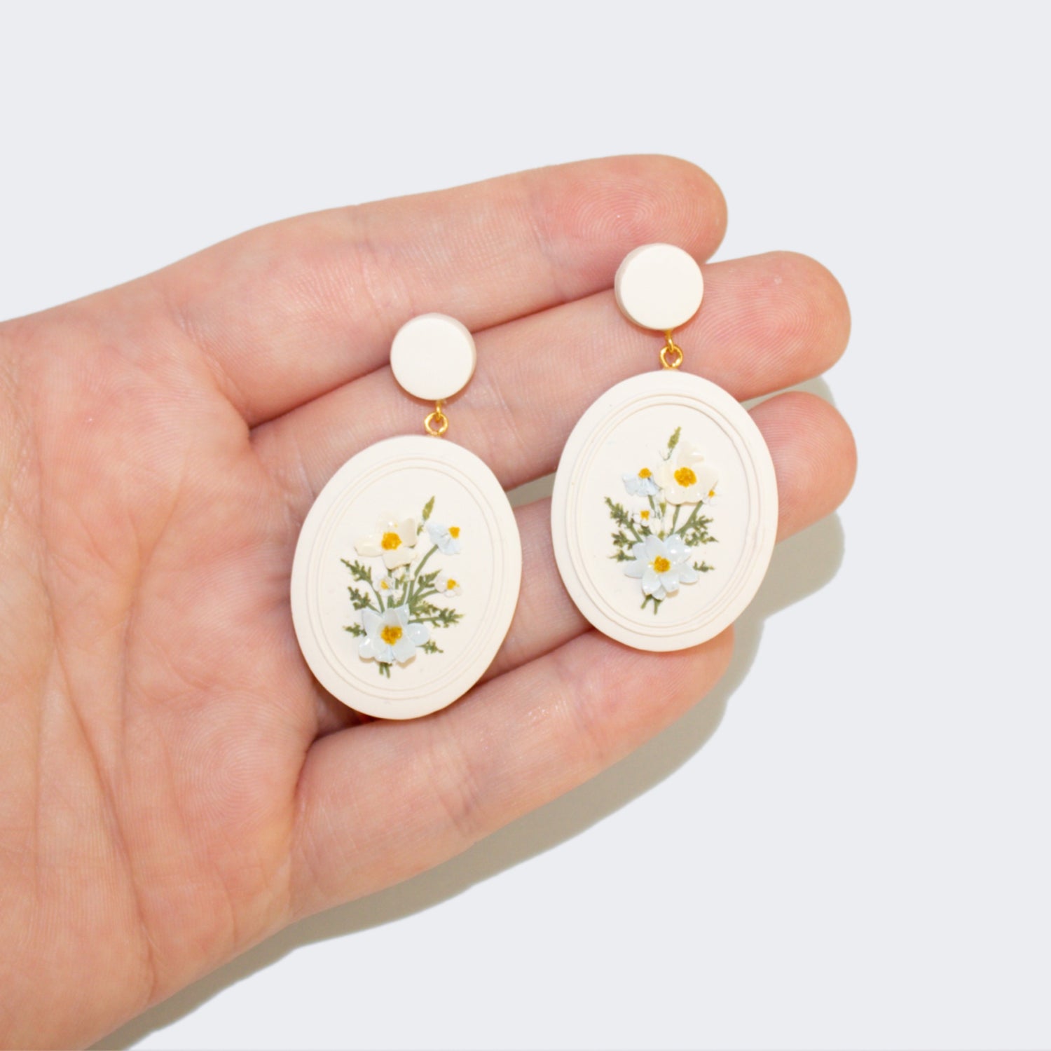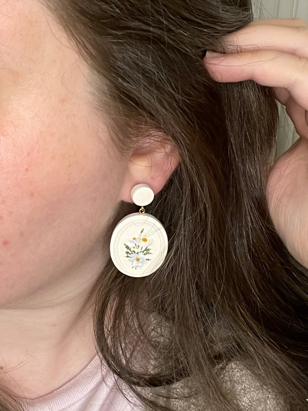 This pair of earrings features a creamy ivory base with a delicate border. The flowers themselves are what I call a "hand-picked" bouquet. That means Instead of my usual bouquet in the center, you can see the stems as if you're about to put them in a cute little vase!