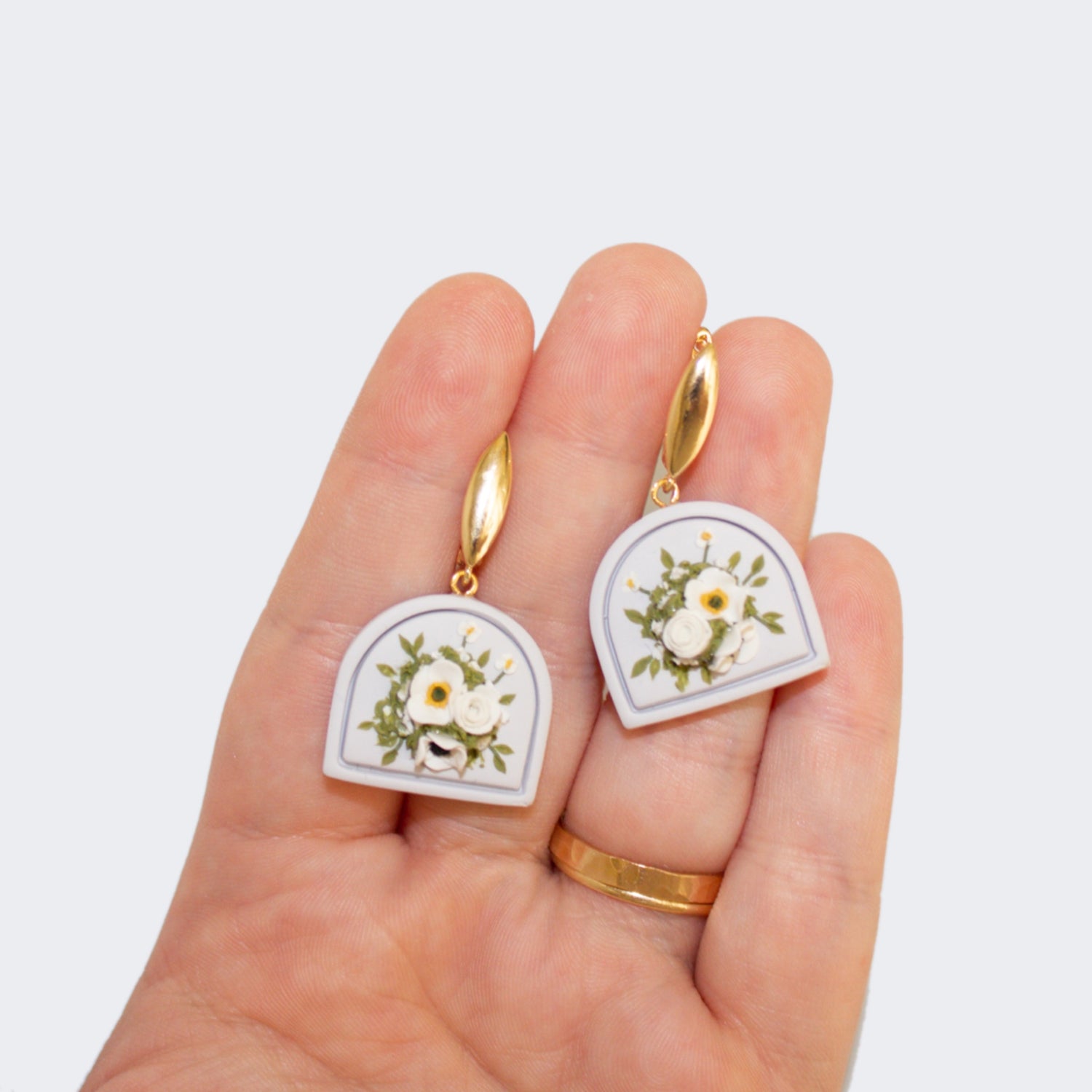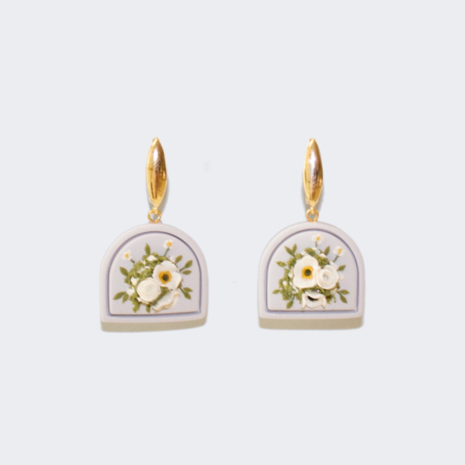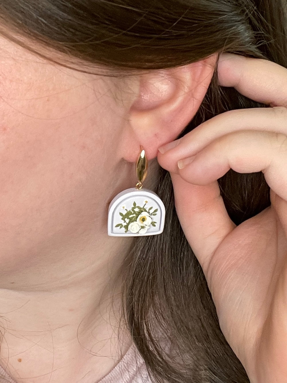 This pair of earrings is such a classic "Mal style". You have the framed periwinkle base with a cute white bouquet in the center. The latch hoops are perfectly paired with this little arch.