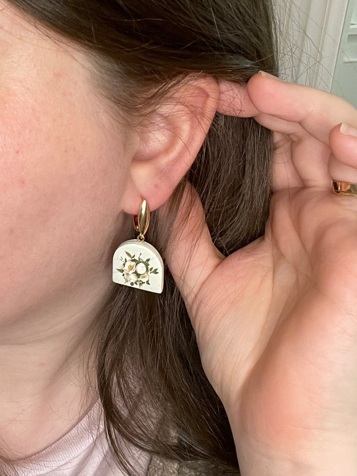 This pair of earrings is such a classic "Mal style". You have the light mint green base with a cute white bouquet in the center. The latch hoops are perfectly paired with this little arch.