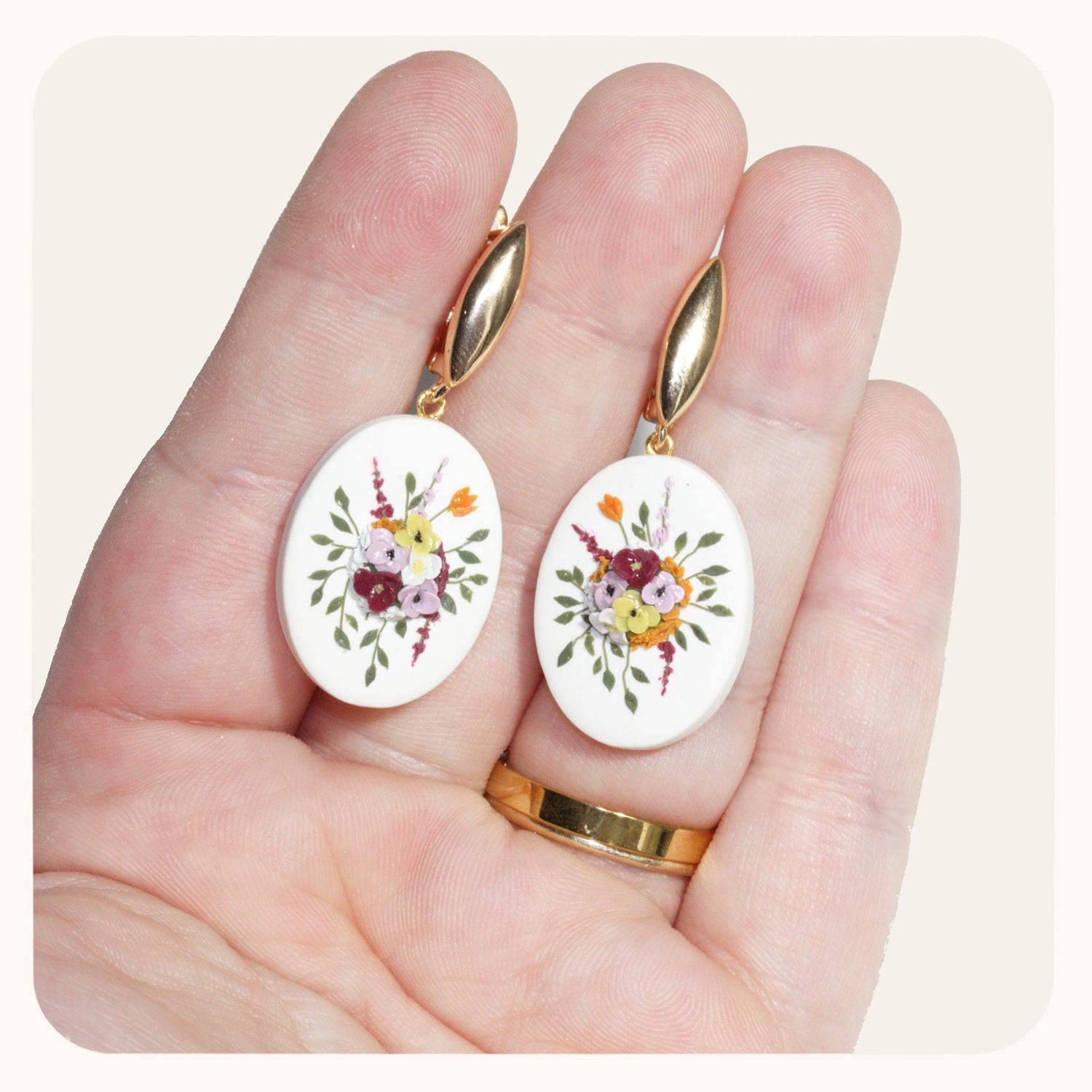 - These earrings are 100% polymer clay. I take special measures to ensure the petals and leaves stay where they're meant to be. I do recommend storing them in a safe place and treating them as you would treat any delicate, handmade jewelry!