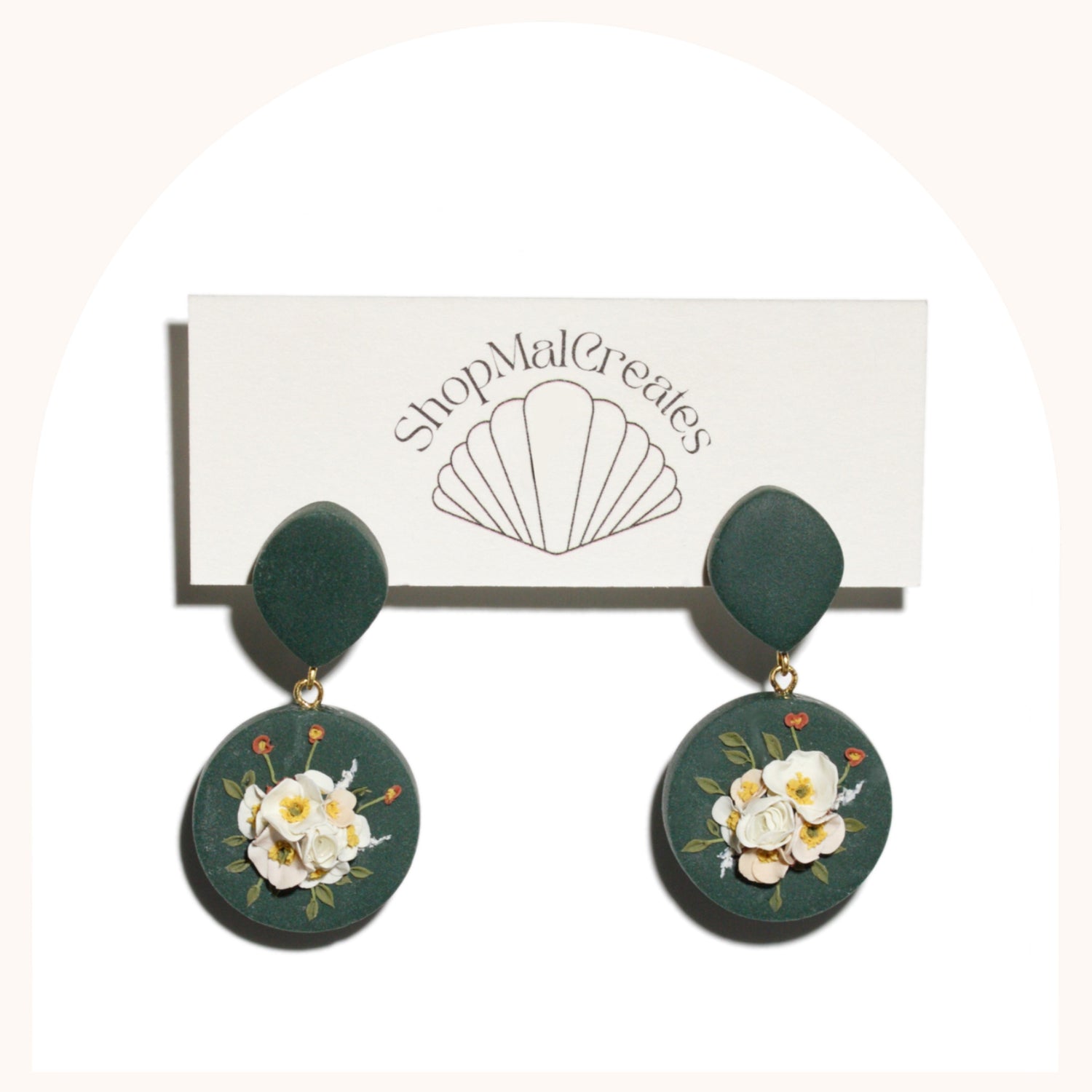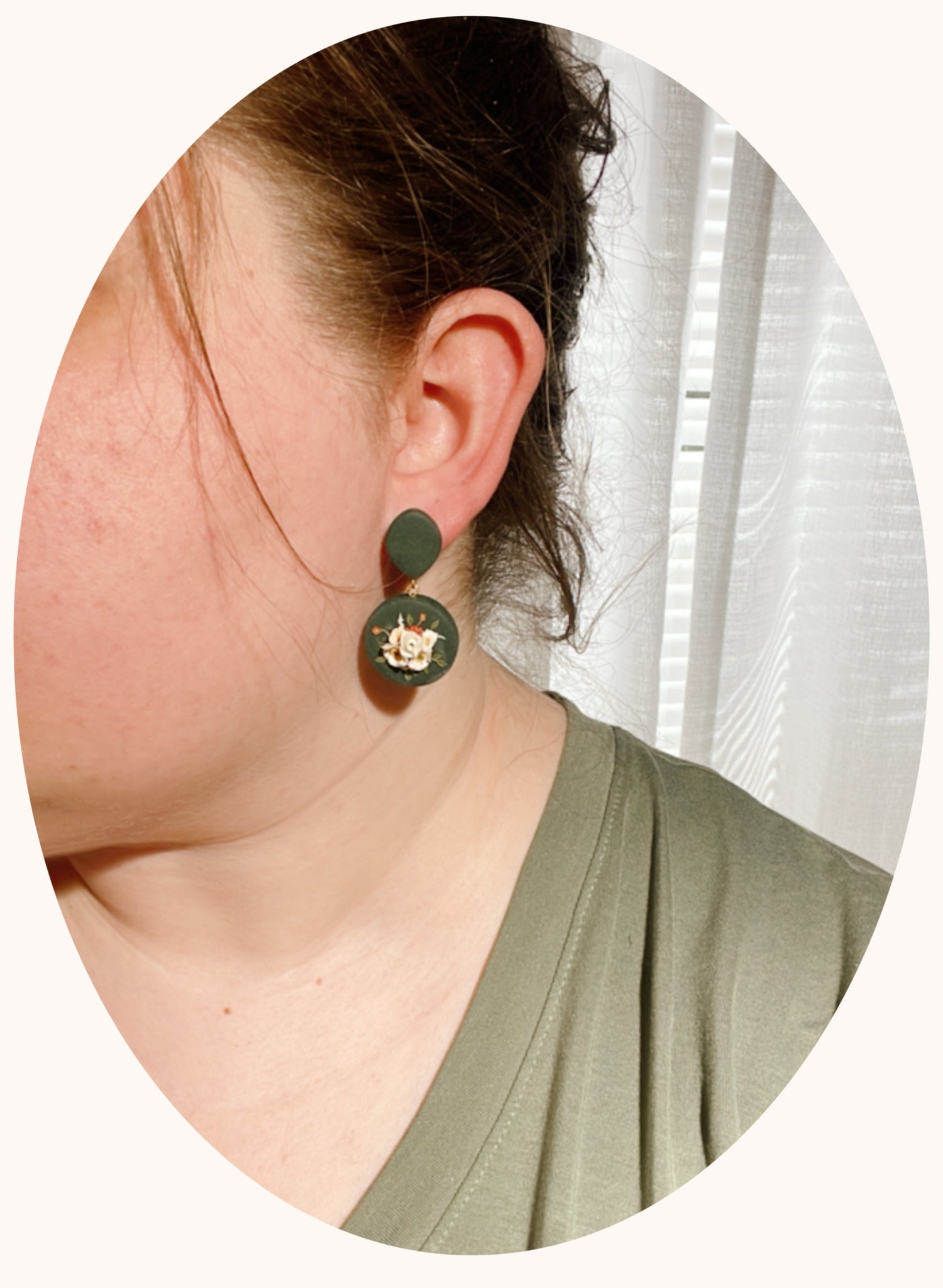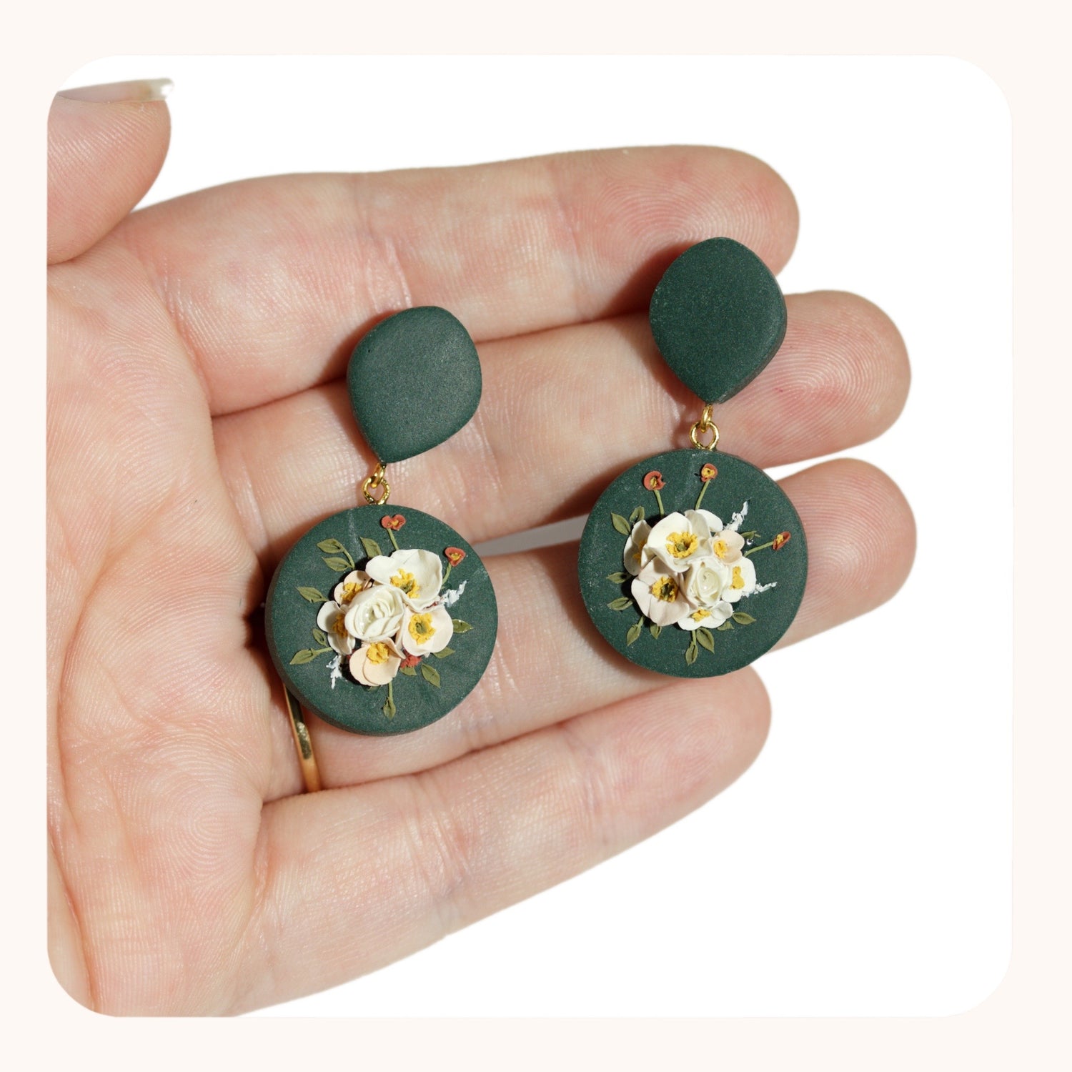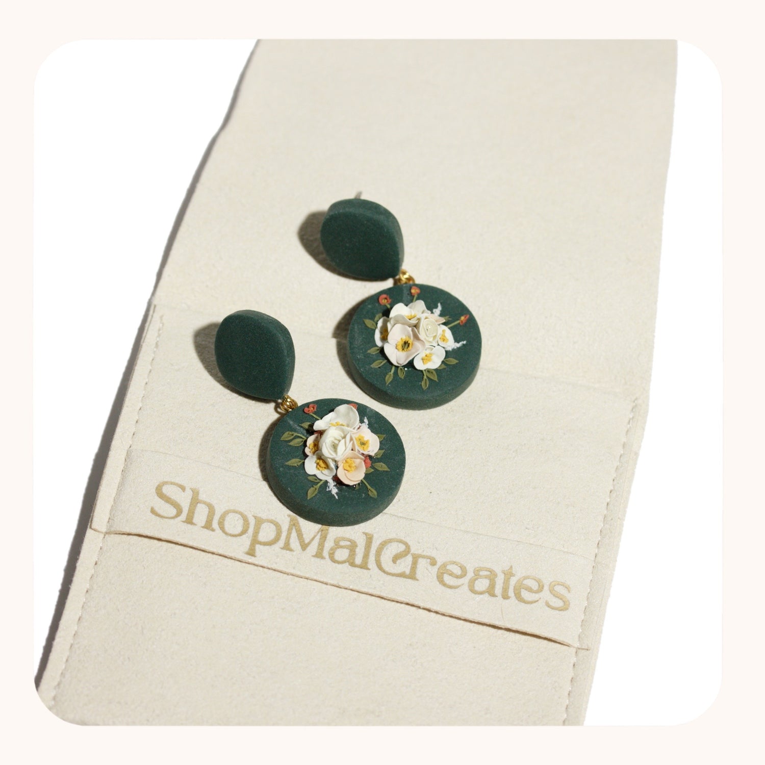 - These earrings are 100% polymer clay. I take special measures to ensure the petals and leaves stay where they're meant to be. I do recommend storing them in a safe place and treating them as you would treat any delicate, handmade jewelry!