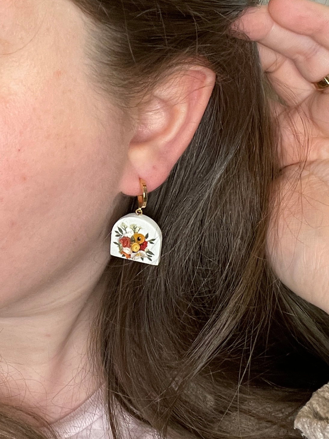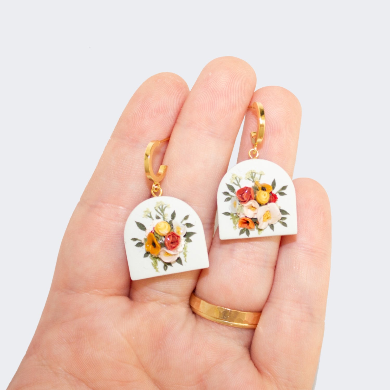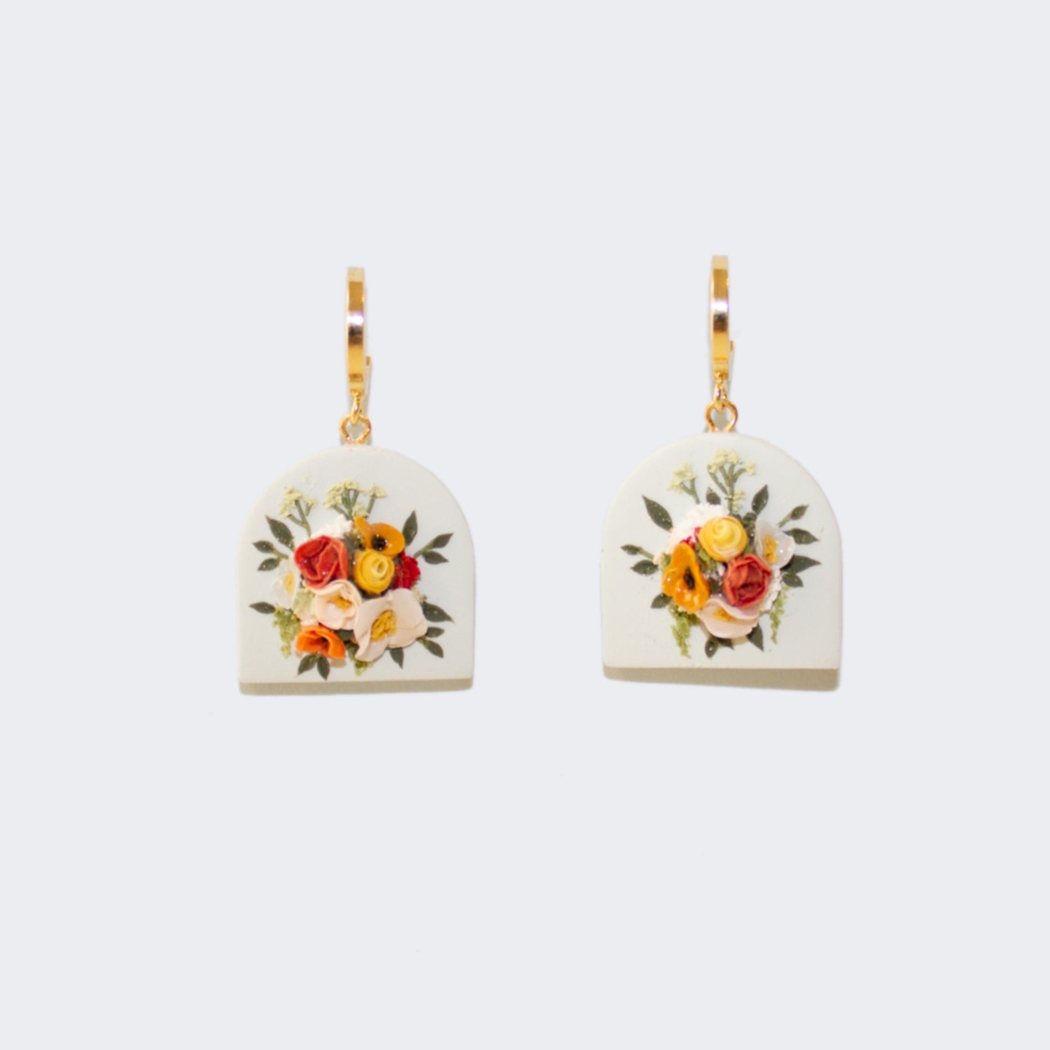 This pair of earrings is composed of a beautiful, sky blue base and a bold bouquet of red, tangerine, yellow, mauve, and burgundy flowers accented with foliage.