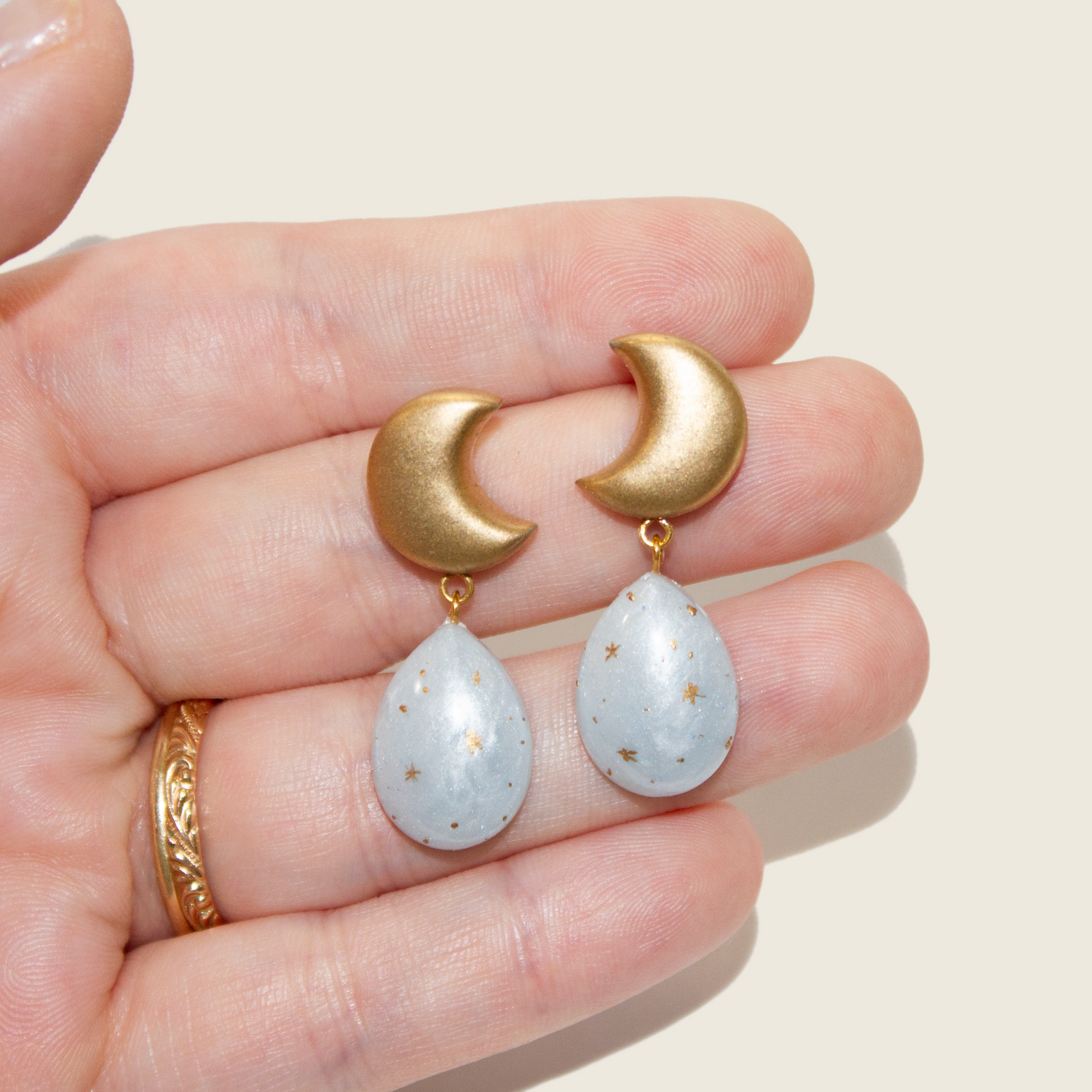 Materials: Polymer clay, resin, gold filled wire, titanium earring posts