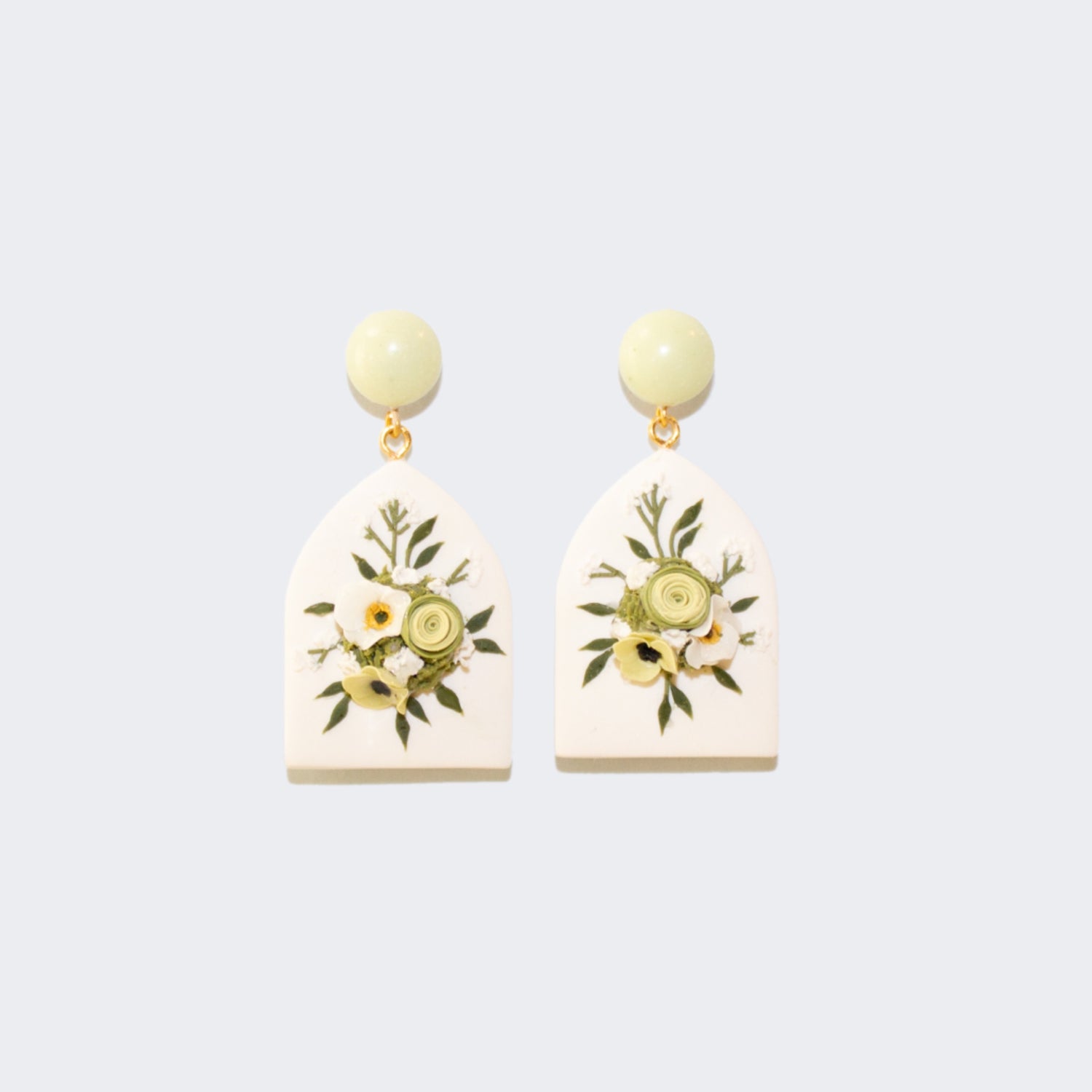 This design features a white, pointed arch base and a bouquet of white and citrine flowers. I leaned into the colors of these earrings, giving them a domed post in a beautiful light sage color. I think it gives them the perfect pop of coordinated color!